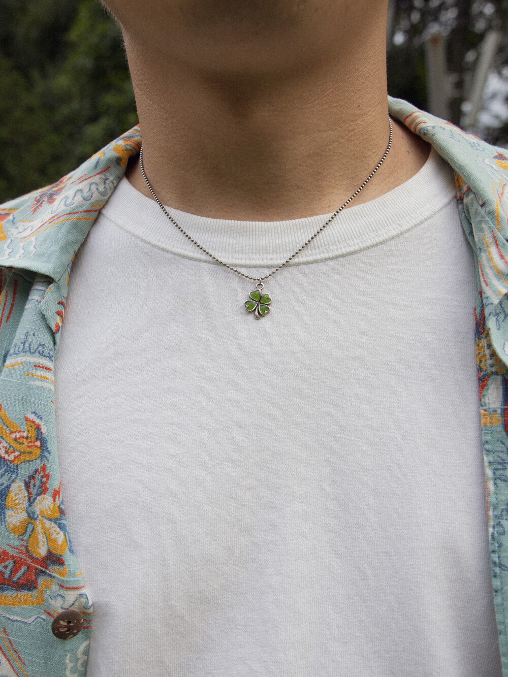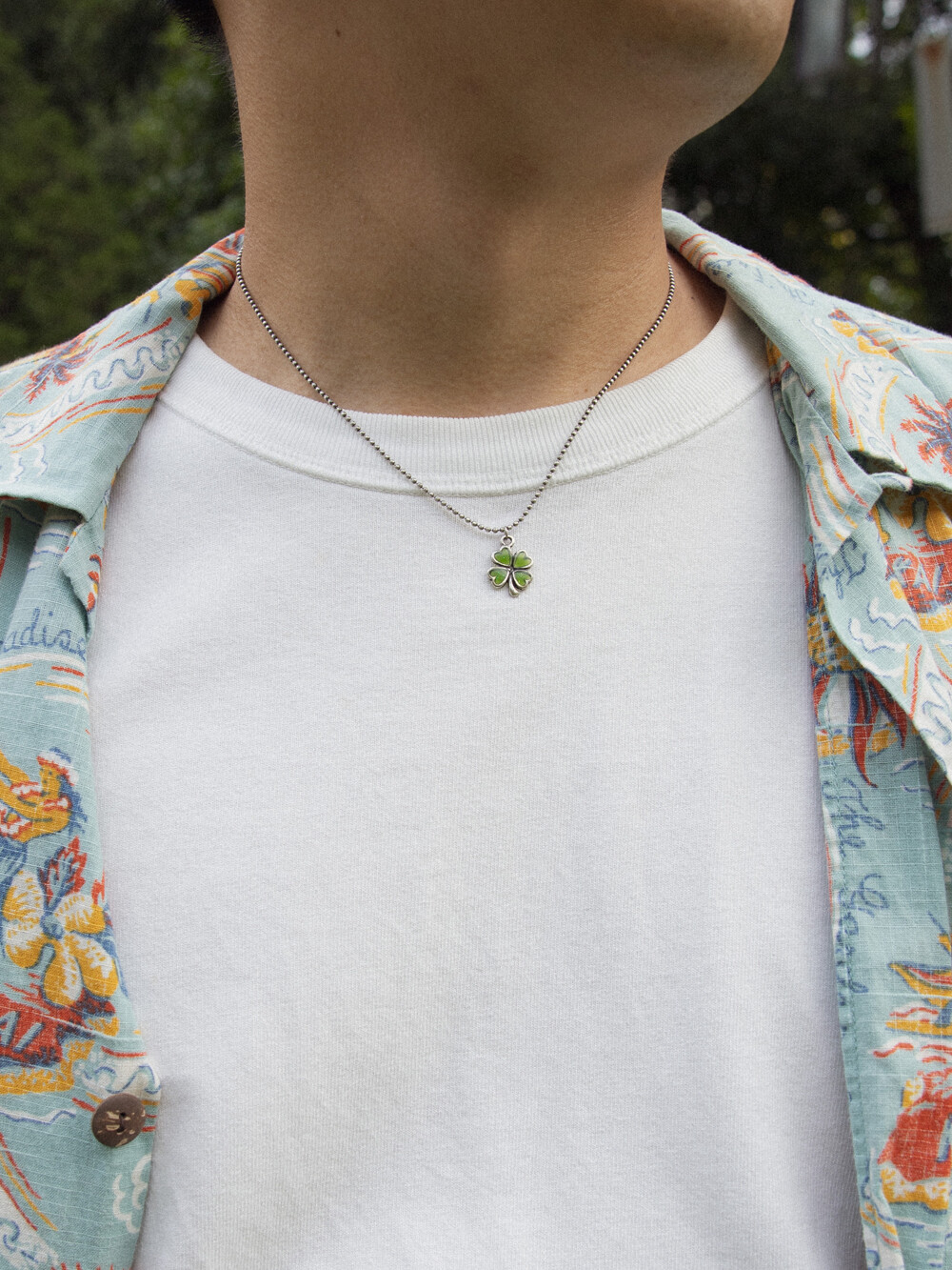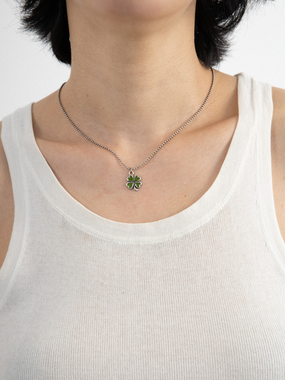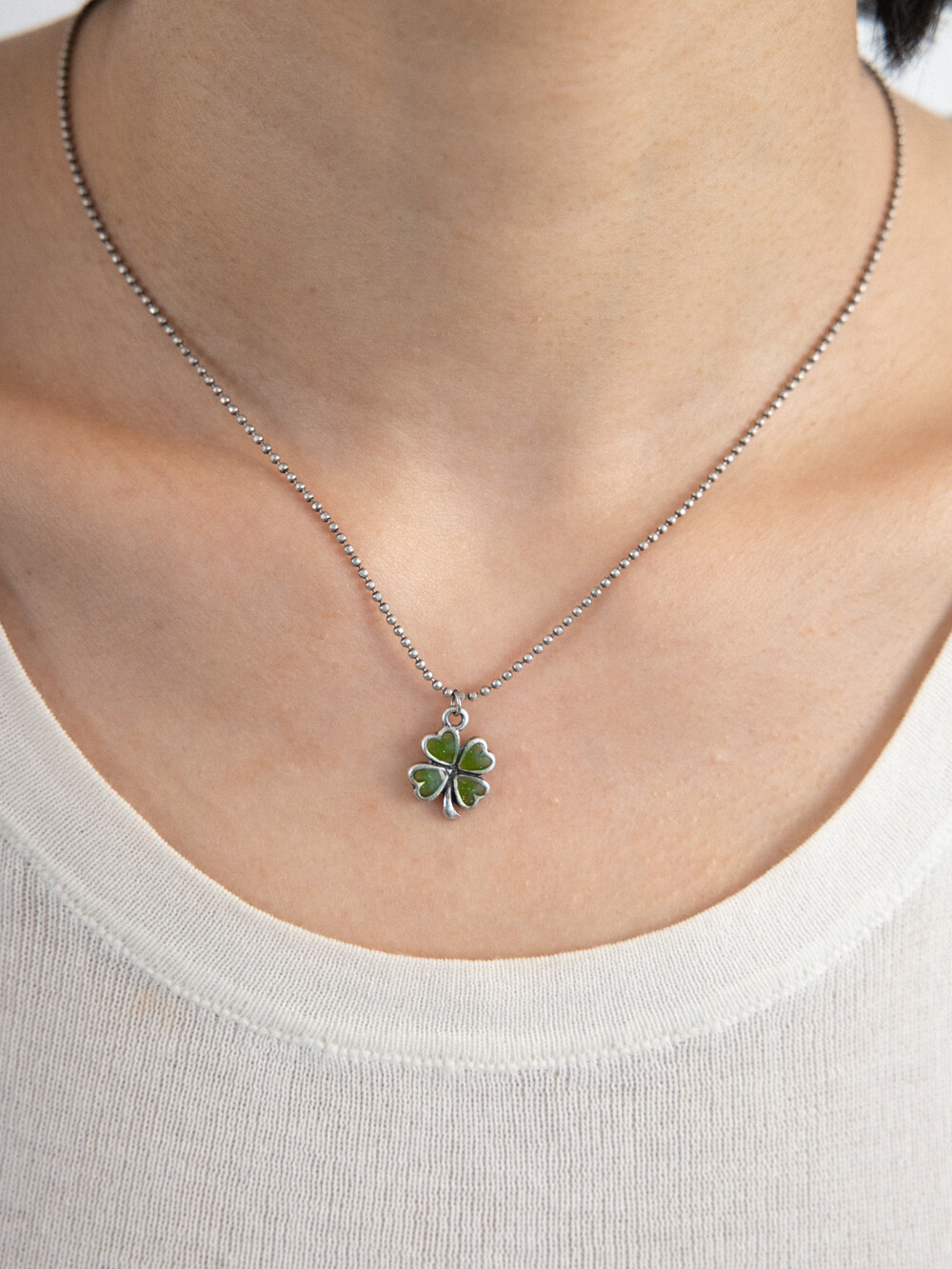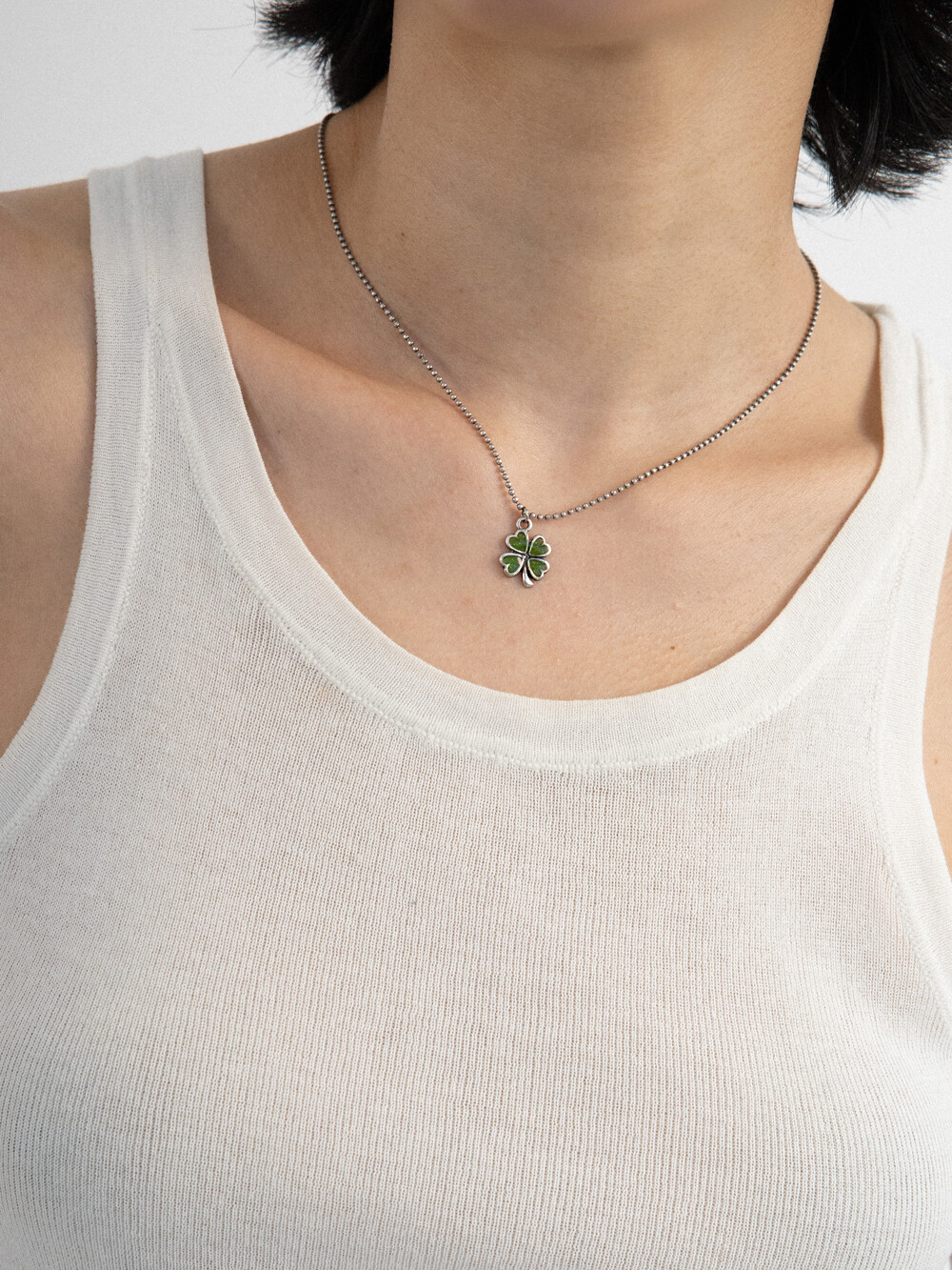 은버니쉬 처리된 빈티지 라인 네크리스로 작은 사이즈의 볼 체인에 클로버 팬던트가 매치된 디자인 입니다. 남/녀 모두 캐주얼하게 착용하기 좋은 유니섹스 제품 입니다.