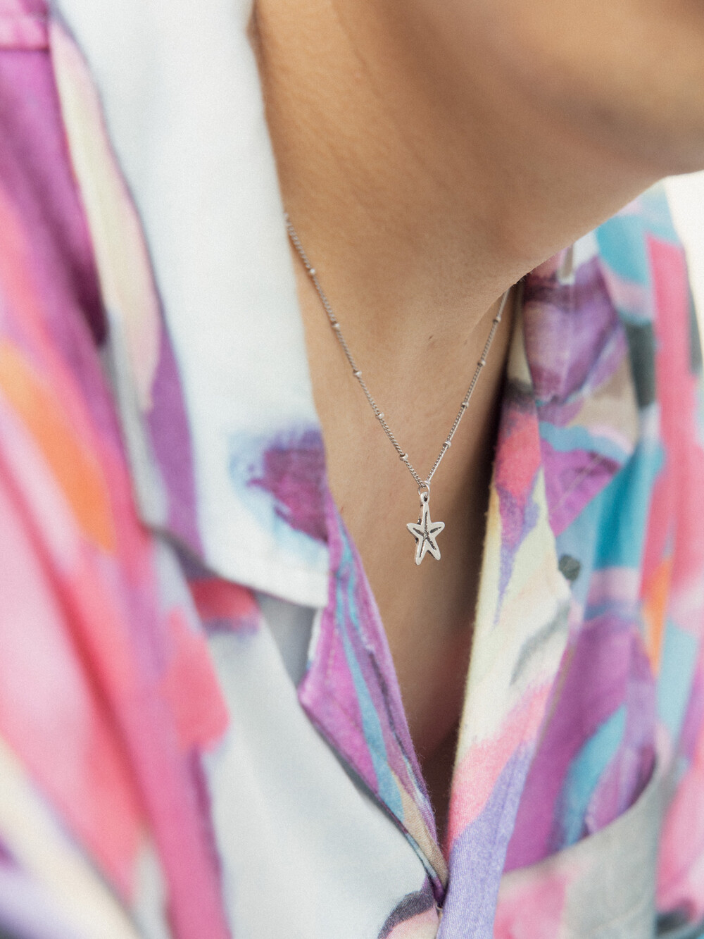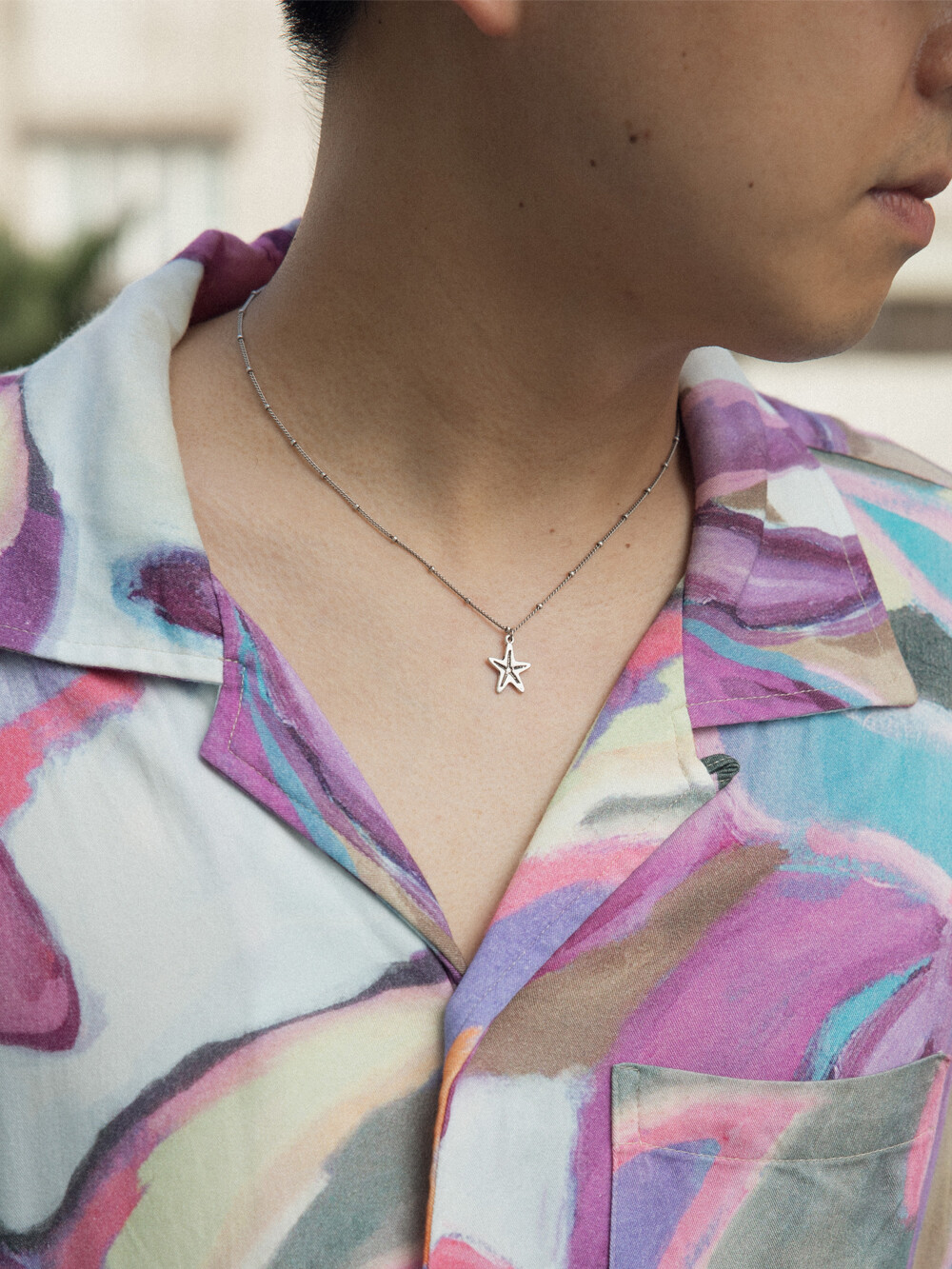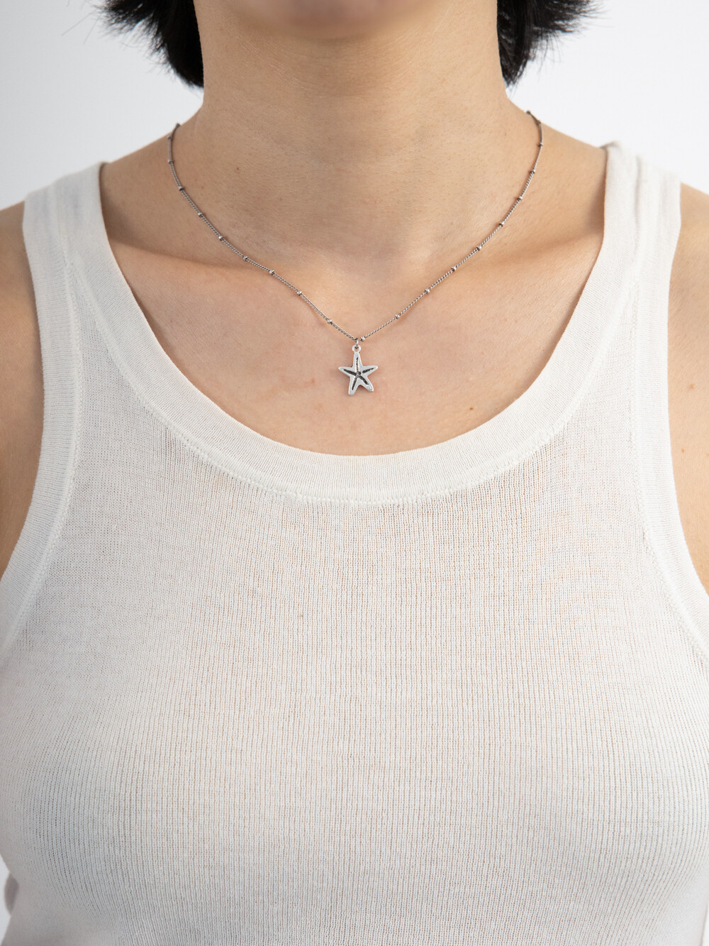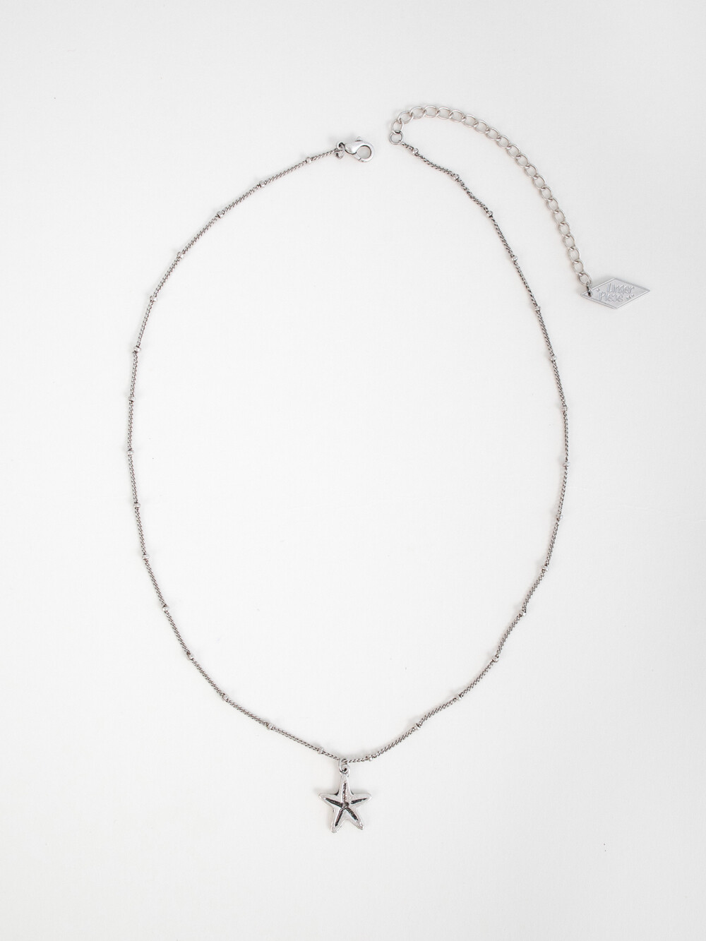 은버니쉬 처리된 빈티지 라인 네크리스로 포인트 볼 체인에 불가사리 팬던트가 매치된 디자인 입니다. 남/녀 모두 캐주얼하게 착용하기 좋은 유니섹스 제품 입니다.