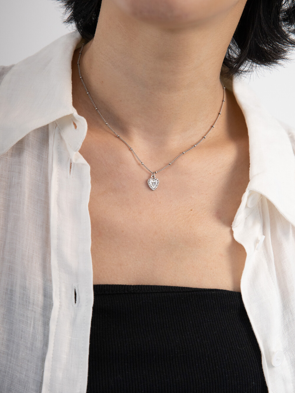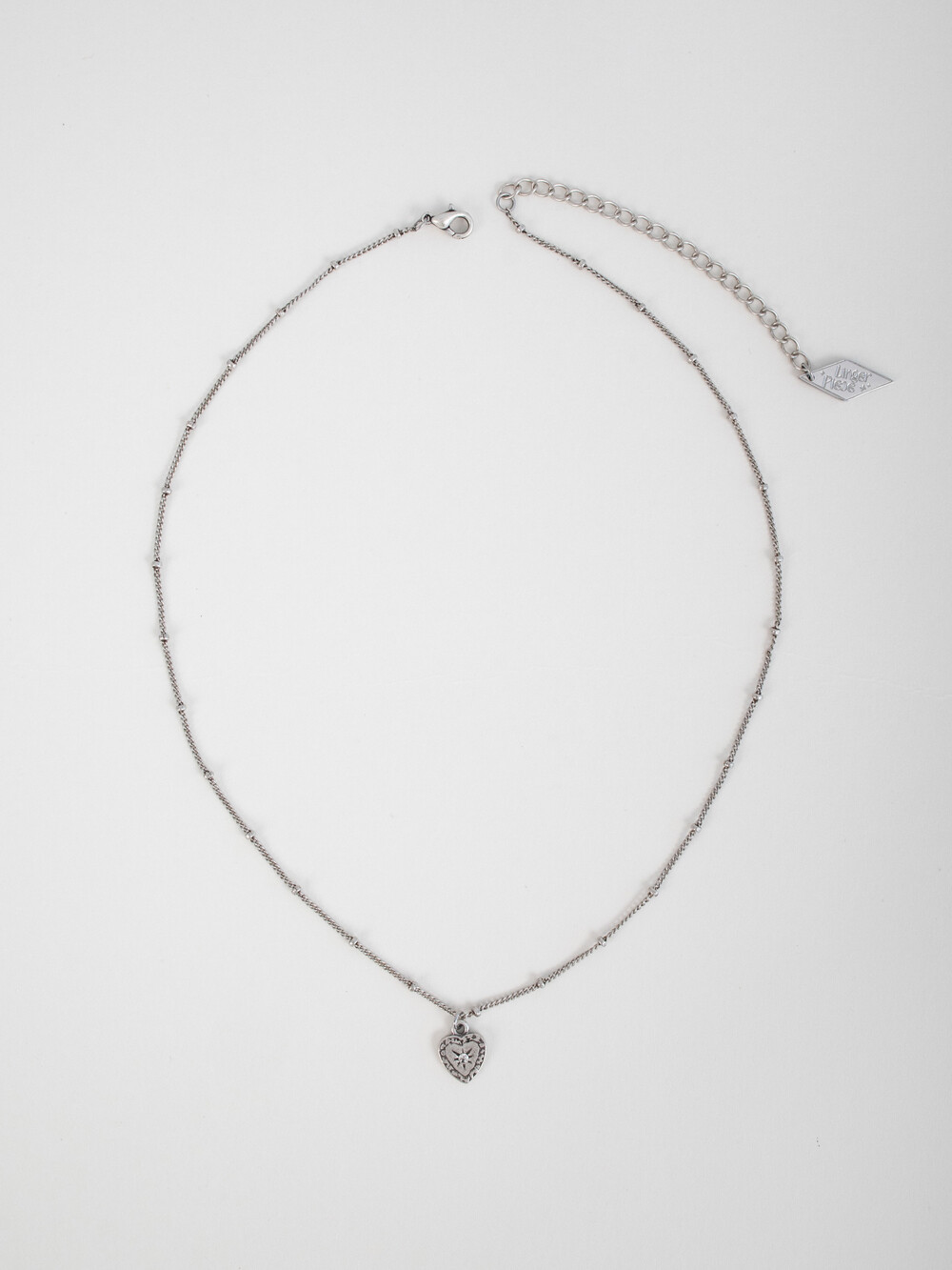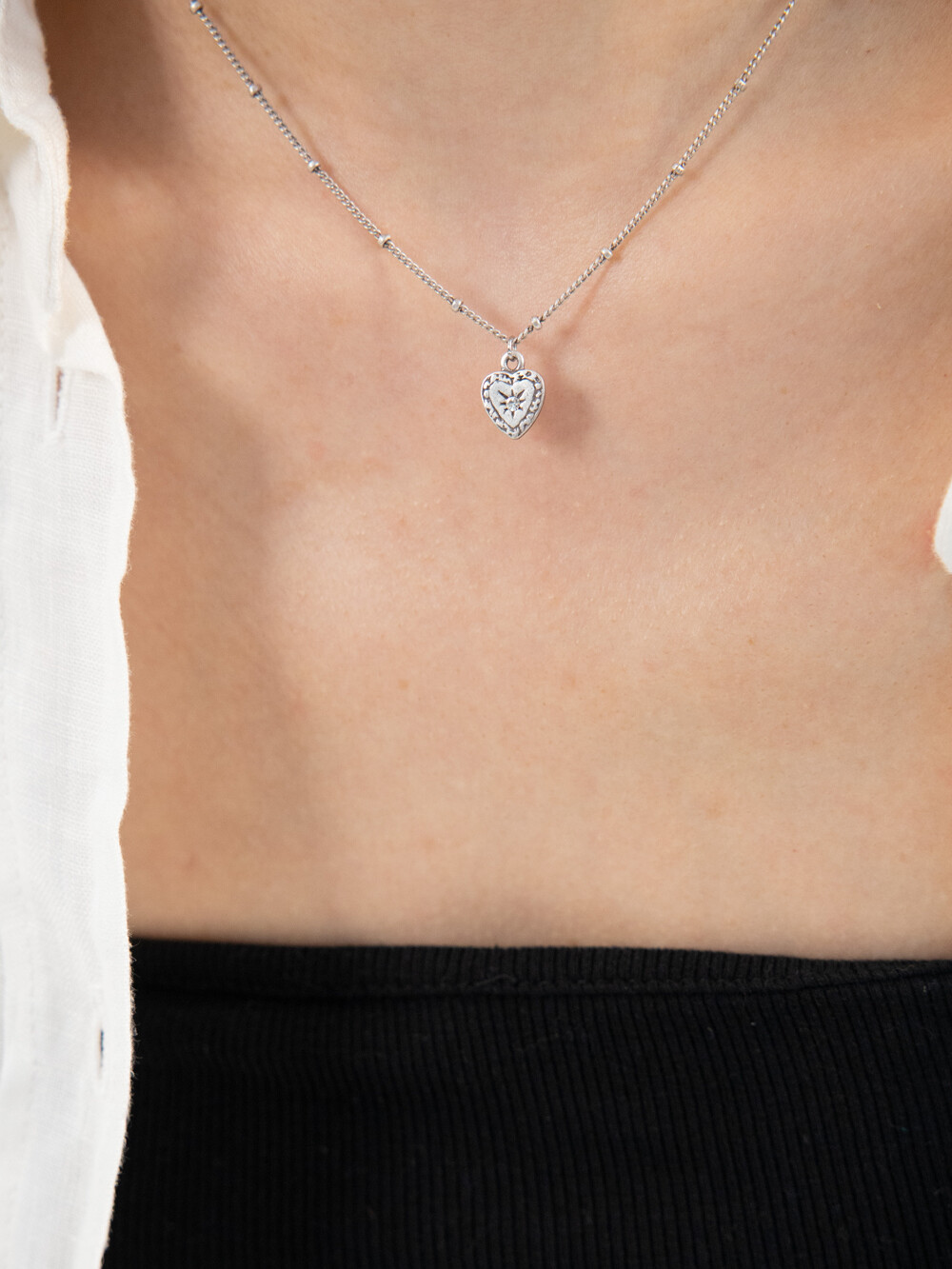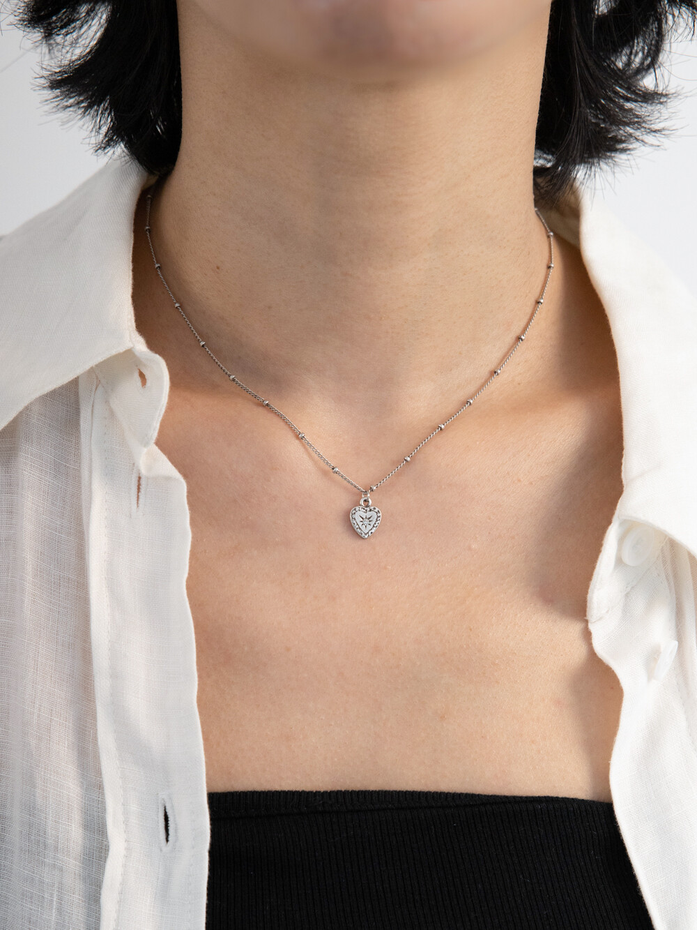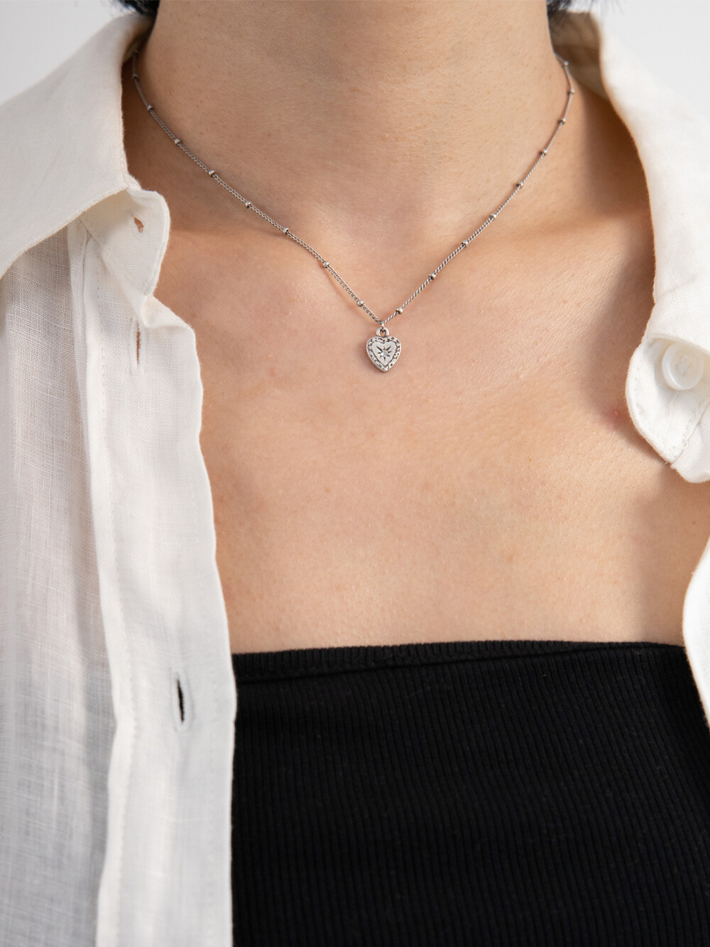 은버니쉬 처리된 빈티지 라인 네크리스로 에스닉한 무드의 하트 팬던트가 매치된 디자인 입니다. 다양한 룩에 자연스럽게 어우러지는 타임리스 네크리스 입니다.