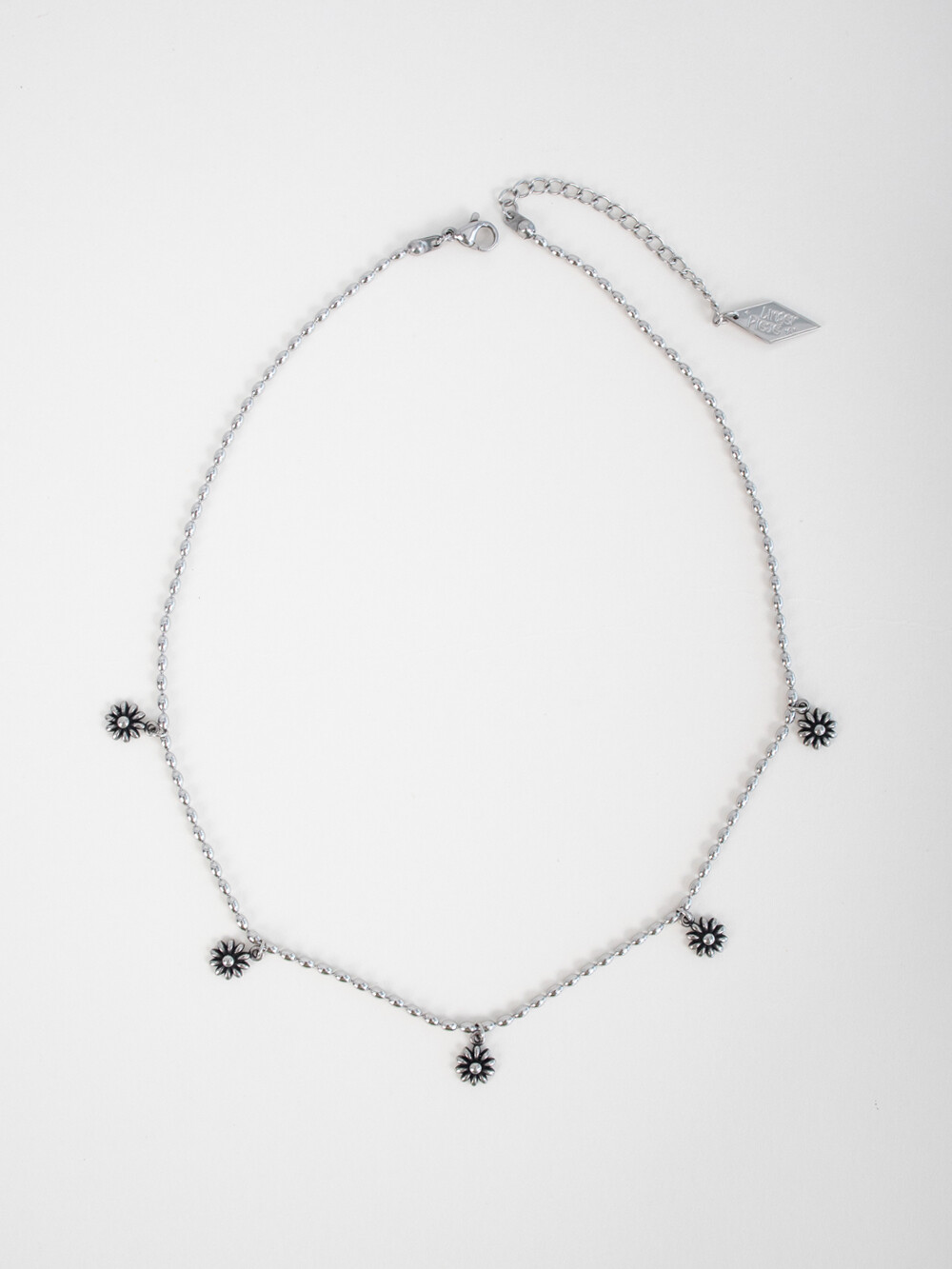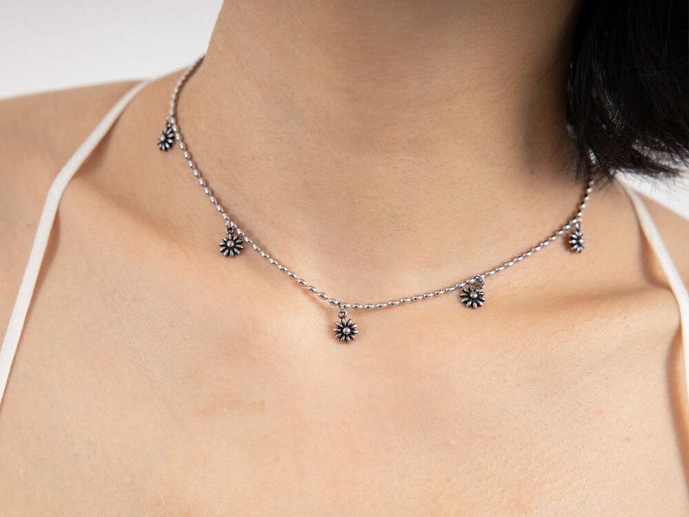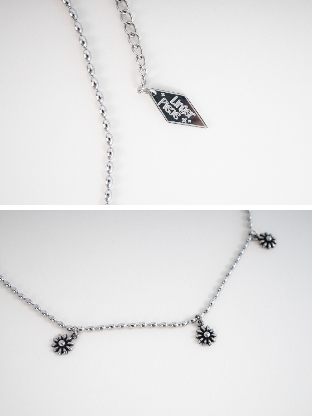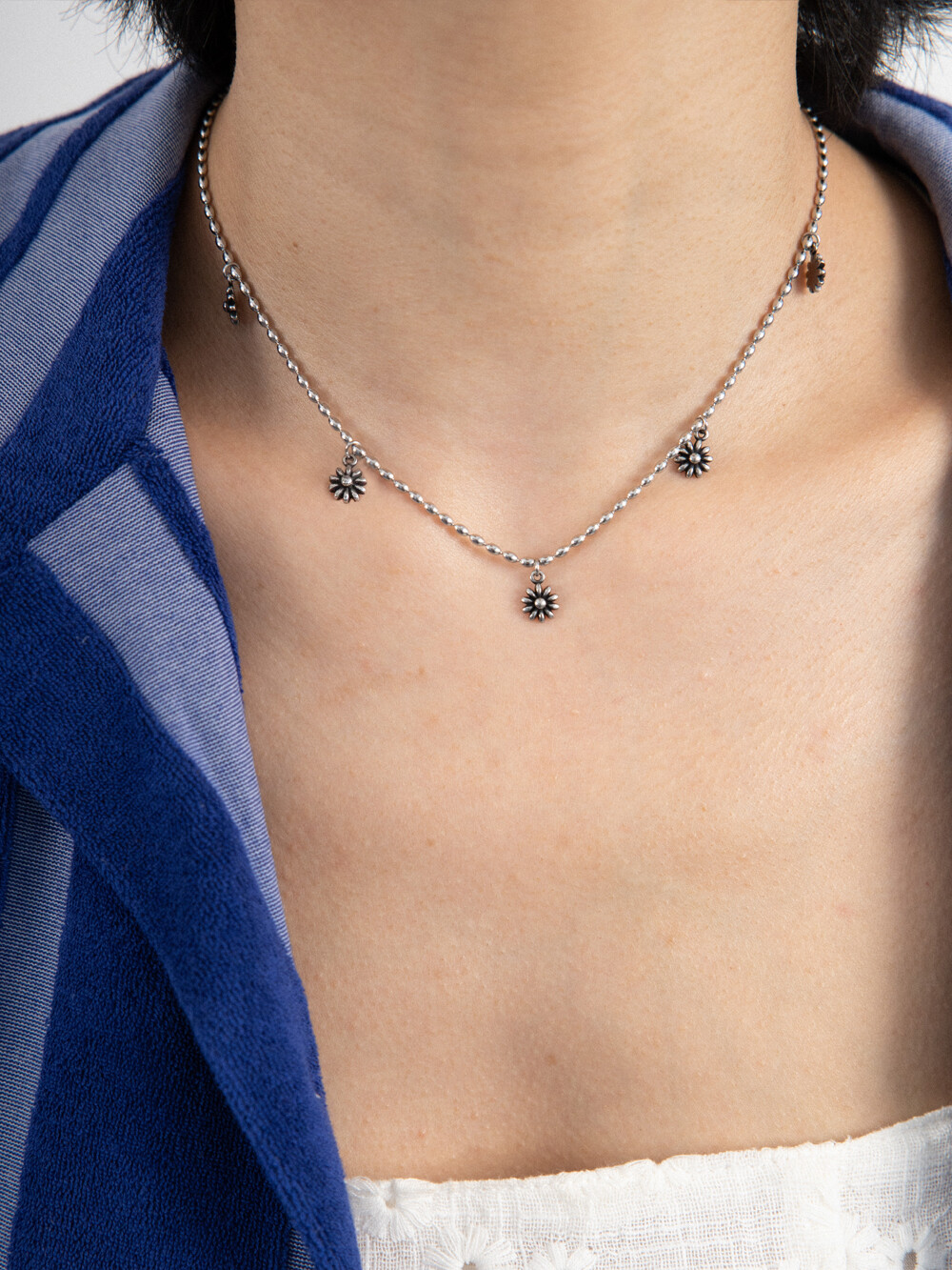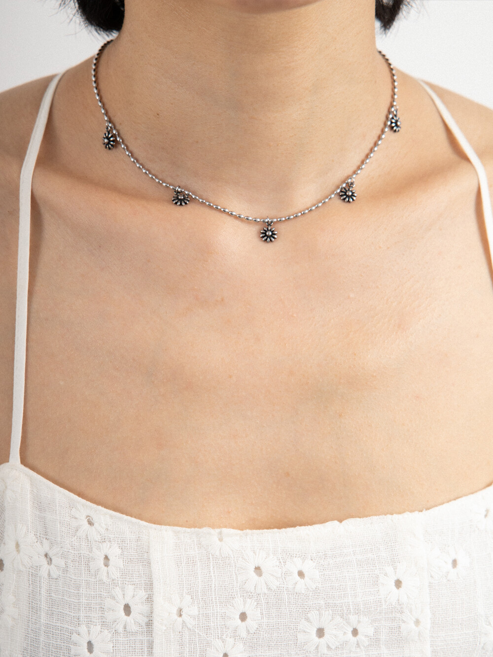 유화 처리된 미니 사이즈의 데이지 꽃이 나열된 디자인의 네크리스 입니다. 전체 써지컬스틸 소재로 제작 되었으며 여성스럽거나 캐주얼한 차림 등 다양한 스타일에 포인트로 활용하기 좋은 제품 입니다.