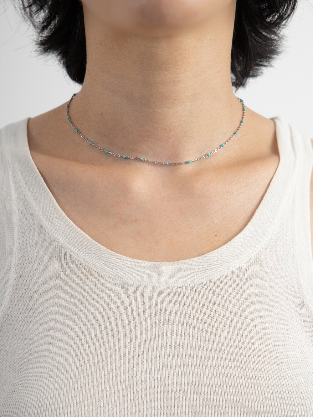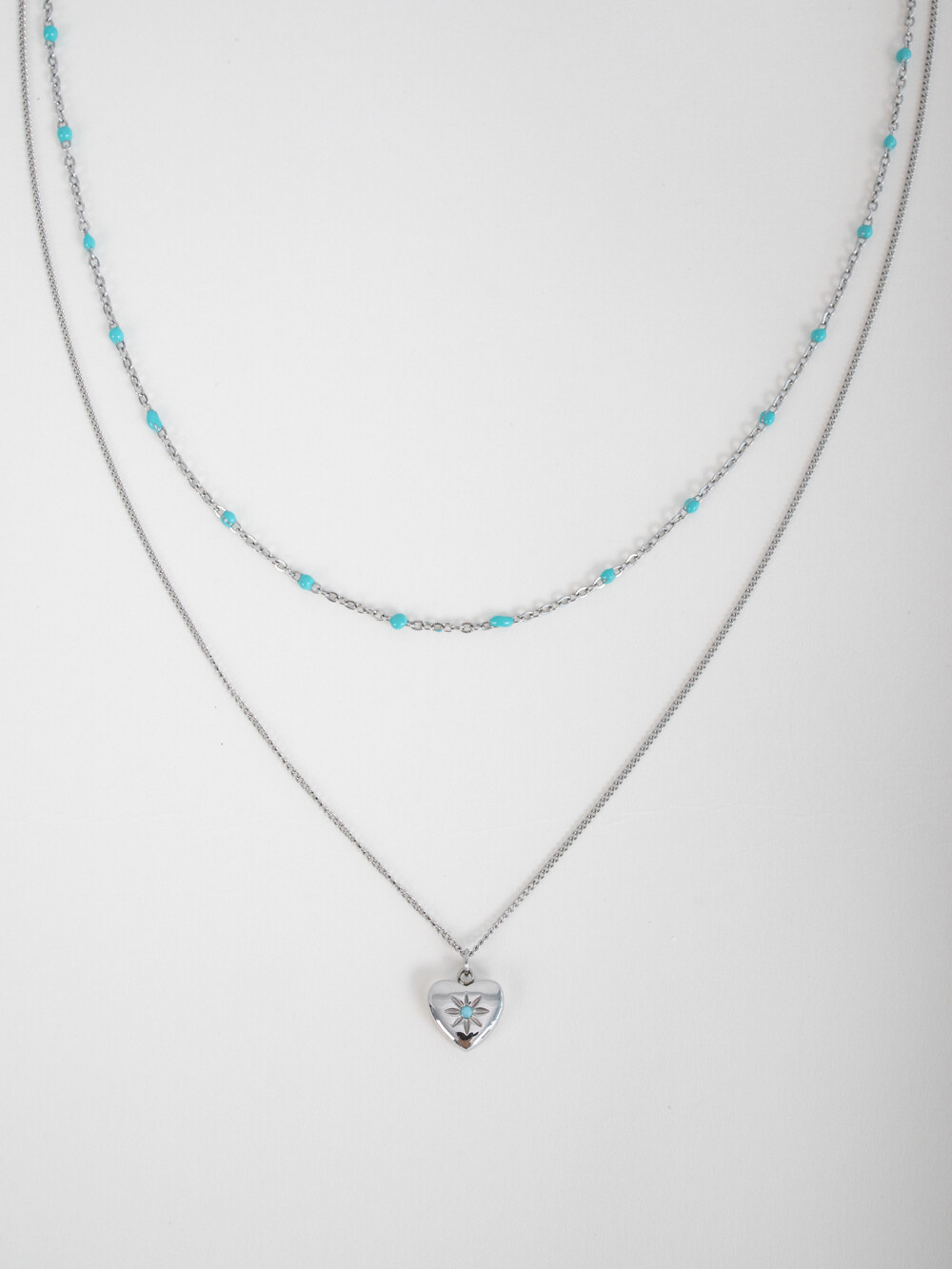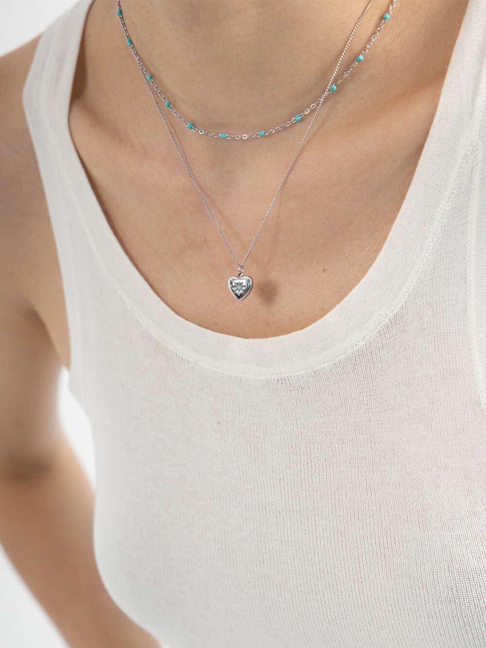 민트 컬러볼이 박힌 체인 네클리스와 중앙에 민트로 포인트를 준 하트 팬던트 네클리스가 세트로 구성된 아이템 입니다. 레이어드 해서 착용하기 좋은 디자인이며, 각기 따로 착용해도 웨어러블 하게 사용할 수 있어 유용한 네클리스 입니다. 전체 써지컬 스틸 소재로 제작되었습니다.
