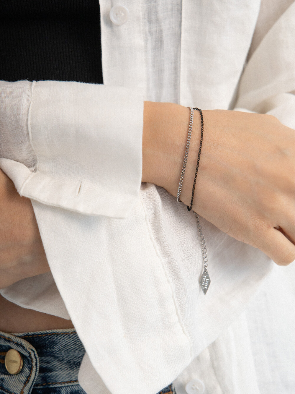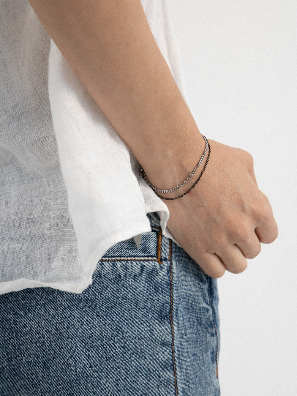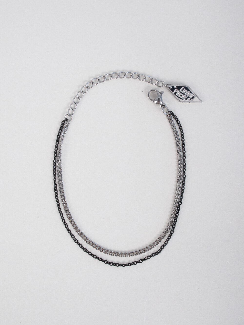 블랙과 실버 컬러의 체인이 2줄로 레이어드 된 디자인의 브레이슬릿 입니다. 전체 써지컬 스틸 소재로 제작되었으며, 남/녀 모두 착용 가능한 디자인으로 가볍게 어떤 룩에도 어우러지는 데일리한 아이템 입니다.