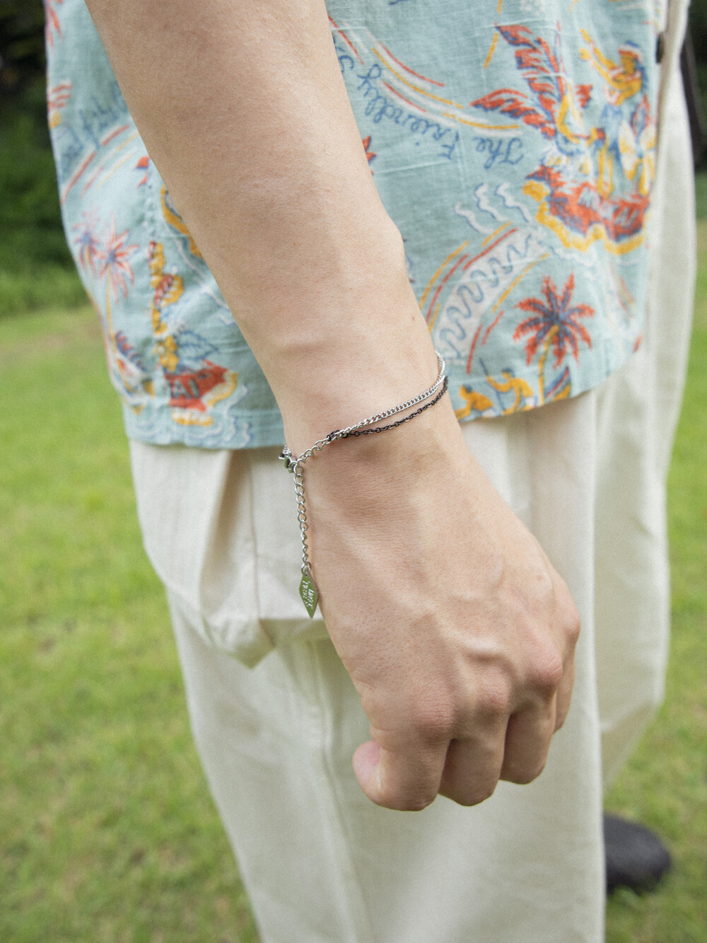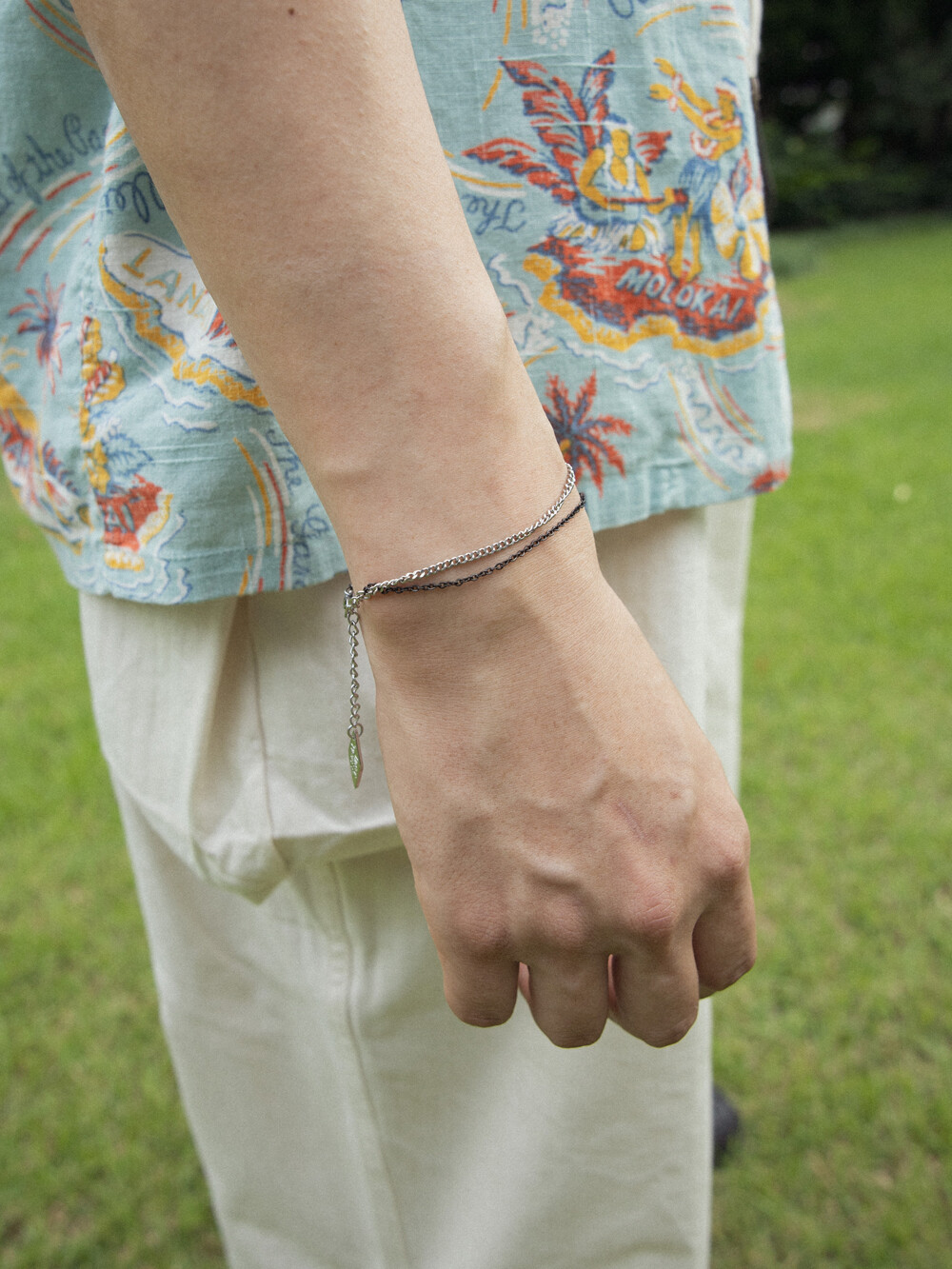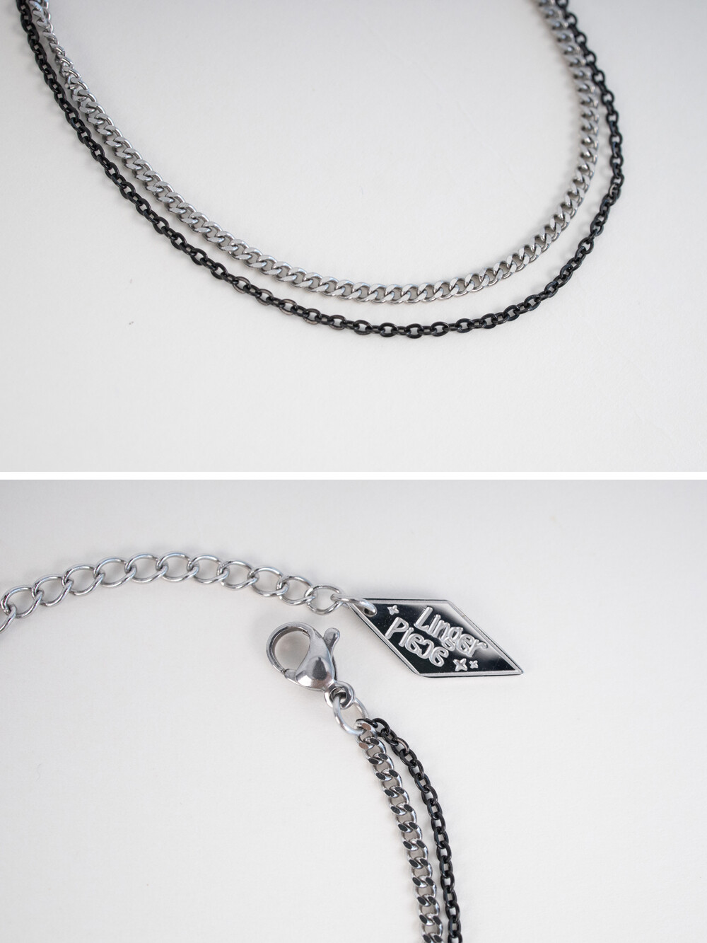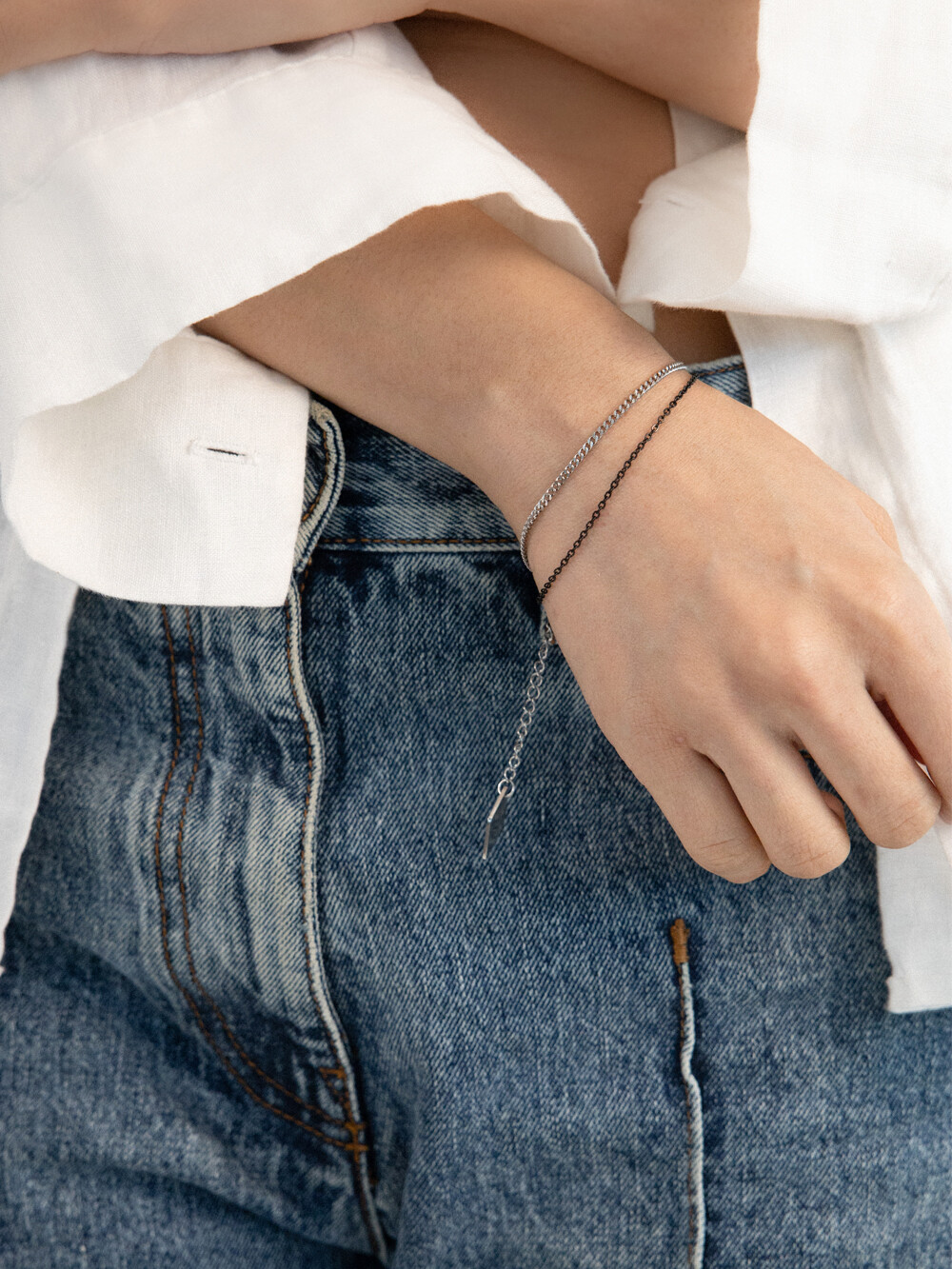 블랙과 실버 컬러의 체인이 2줄로 레이어드 된 디자인의 브레이슬릿 입니다. 전체 써지컬 스틸 소재로 제작되었으며, 남/녀 모두 착용 가능한 디자인으로 가볍게 어떤 룩에도 어우러지는 데일리한 아이템 입니다.