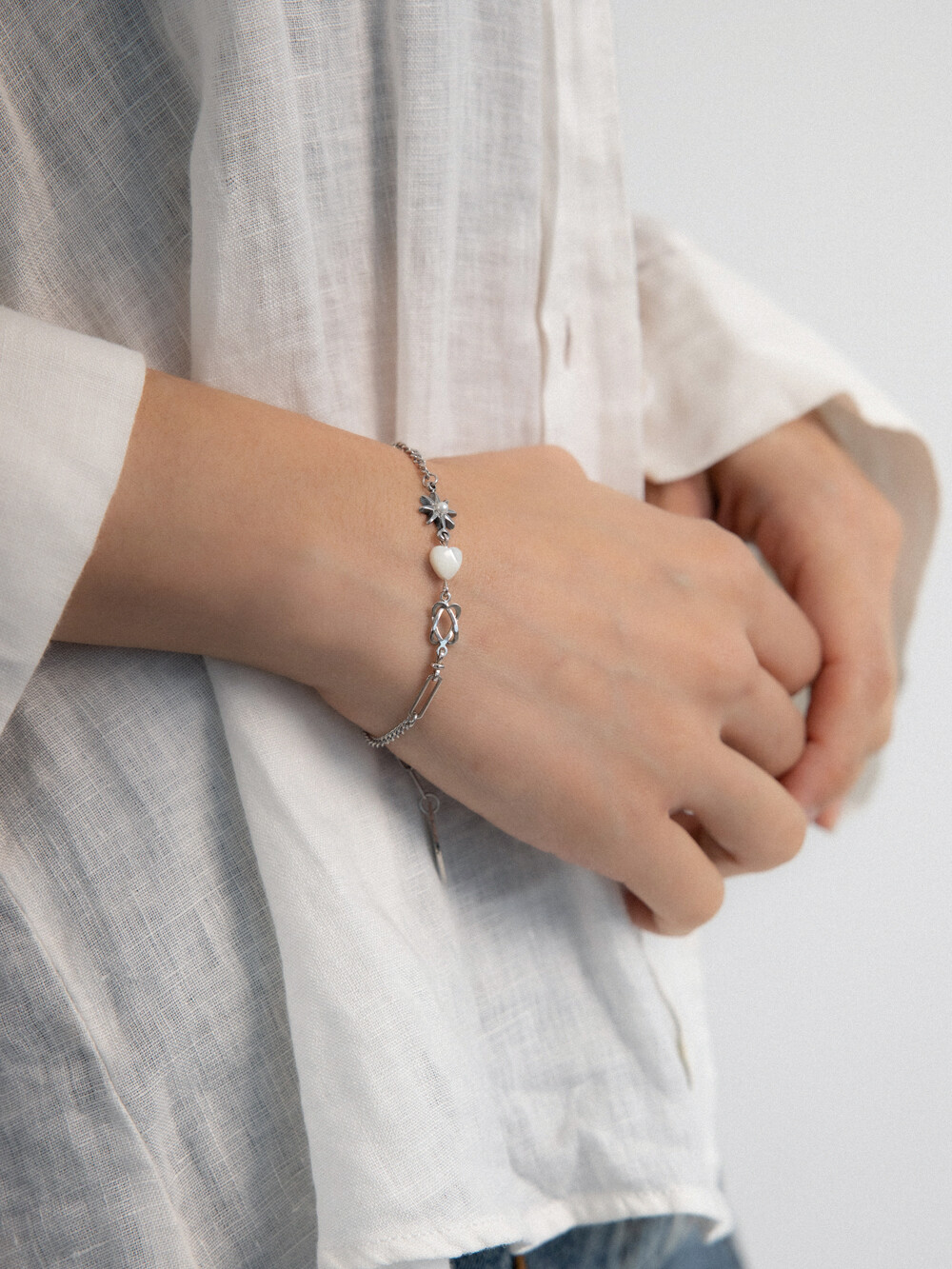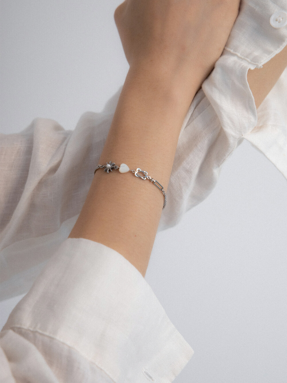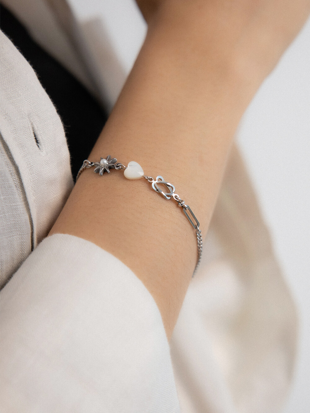 우주를 연상하는 모티프 팬던들이 조합된 유니크한 디자인의 브레이슬릿 입니다. 하트 팬던트는 천연 백자개 소재로 모양, 색상, 빛깔이 각기 다르며 자개 특유의 은은한 무늬가 있습니다. 전체 써지컬 스틸로 제작되었으며 언제든지 착용하기 좋은 아이템 입니다.
