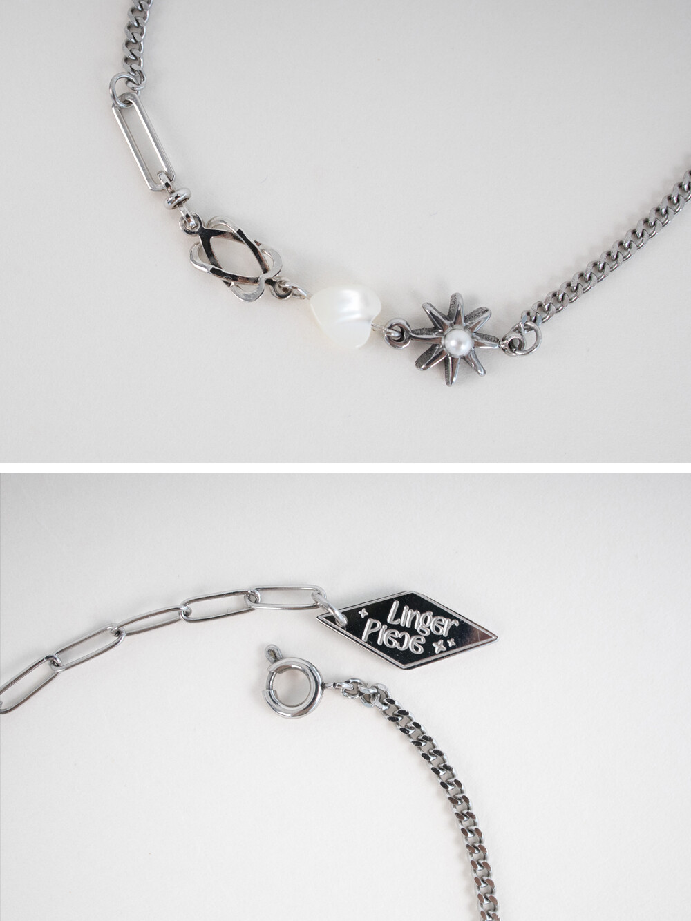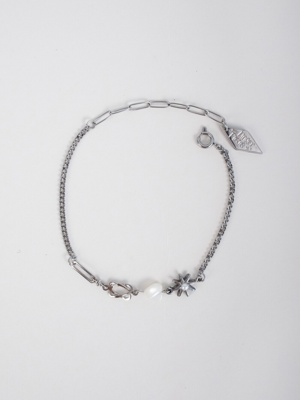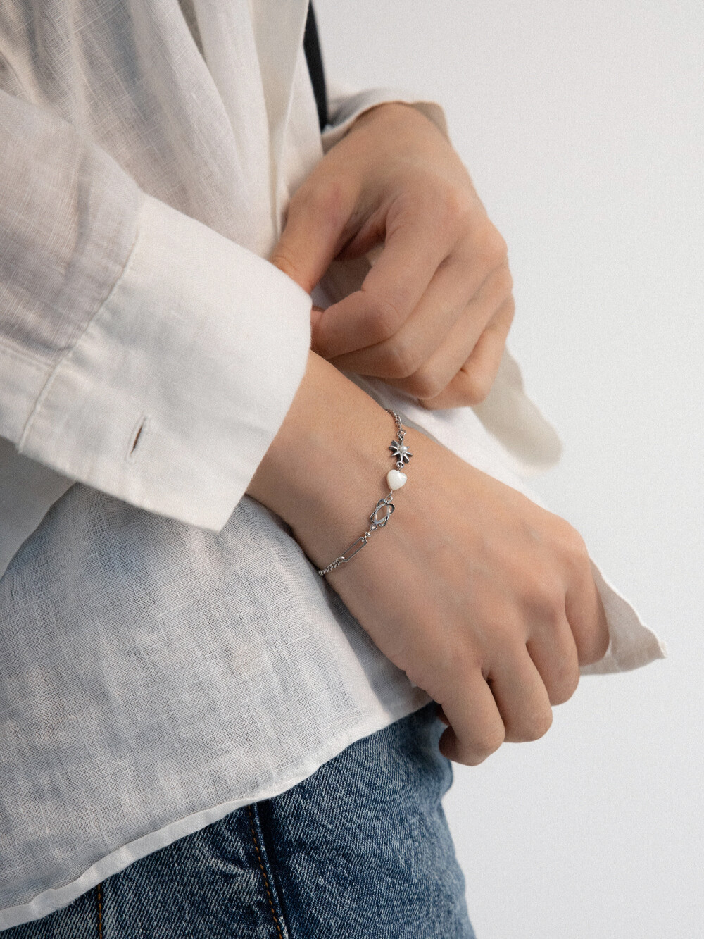 우주를 연상하는 모티프 팬던들이 조합된 유니크한 디자인의 브레이슬릿 입니다. 하트 팬던트는 천연 백자개 소재로 모양, 색상, 빛깔이 각기 다르며 자개 특유의 은은한 무늬가 있습니다. 전체 써지컬 스틸로 제작되었으며 언제든지 착용하기 좋은 아이템 입니다.
