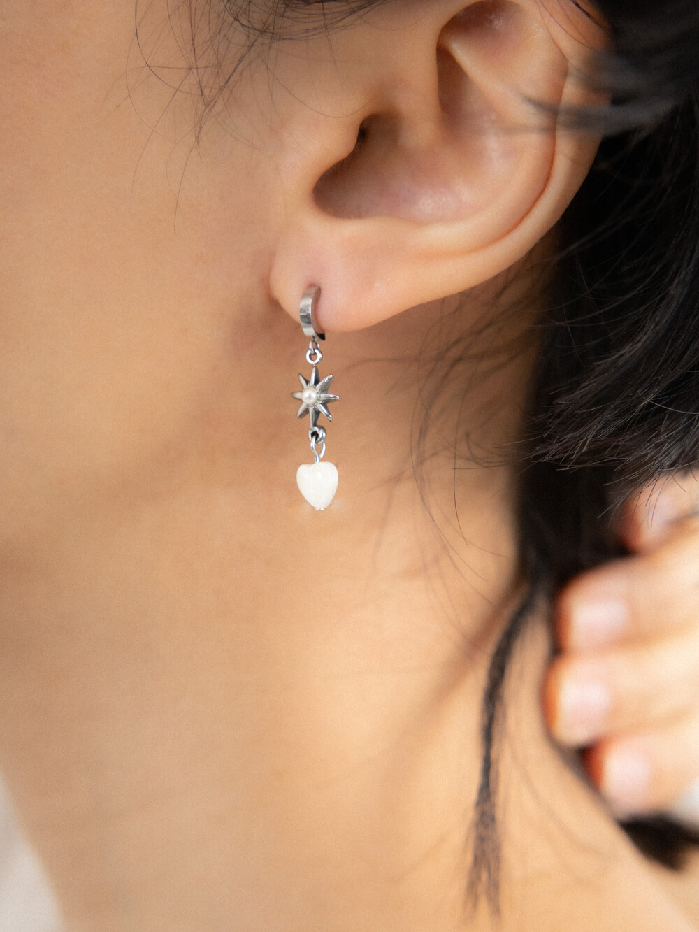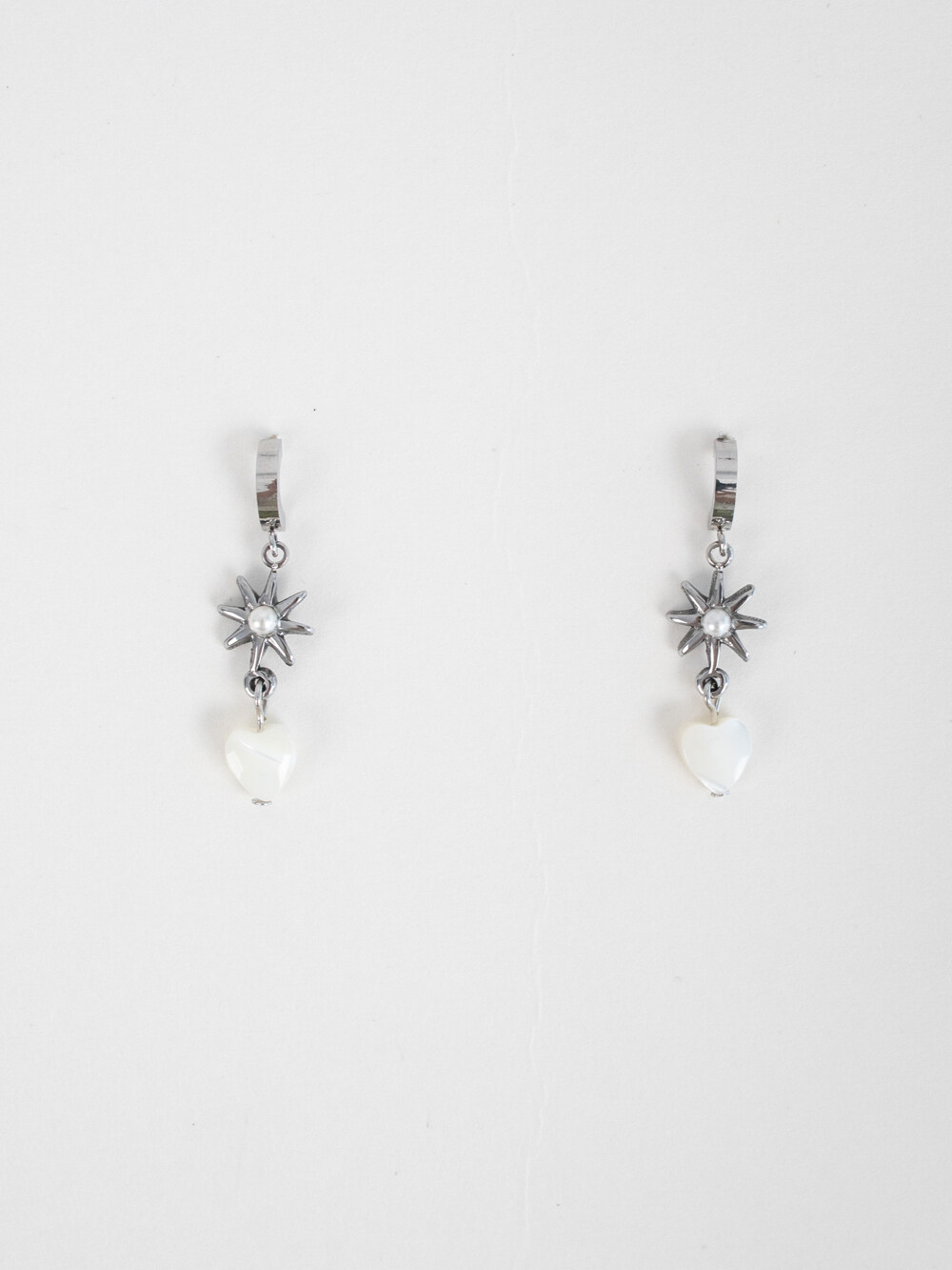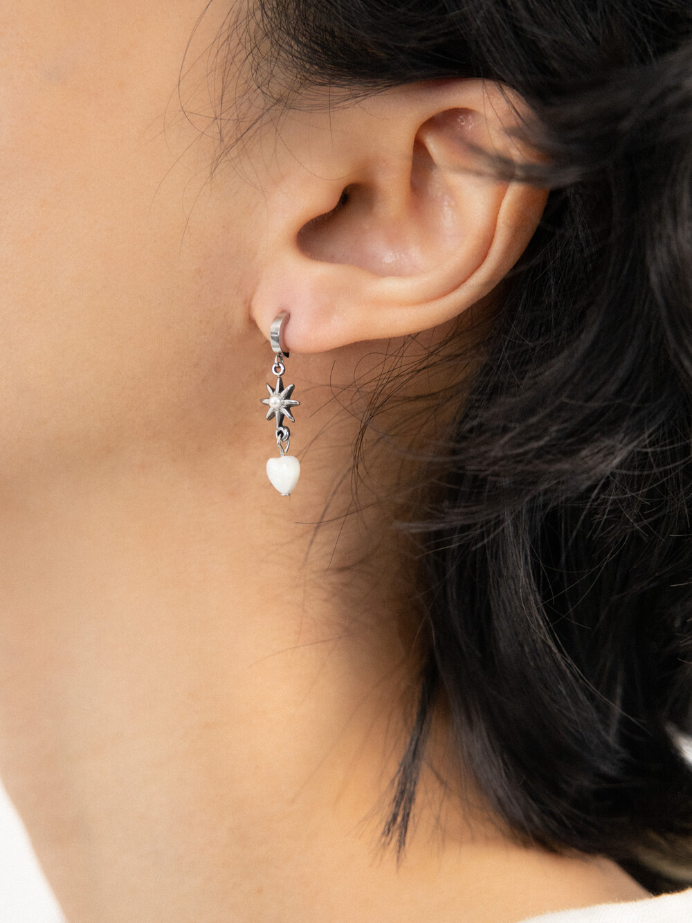 태양과 하트 팬던트가 드롭 형식으로 매치된 유니크한 무드의 이어링 입니다. 하트 팬던트는 천연 백자개 소재로 모양, 색상, 빛깔이 각기 다르며 자개 특유의 은은한 무늬가 있습니다. 귀침 까지 써지컬 스틸 소재로 제작되었습니다.