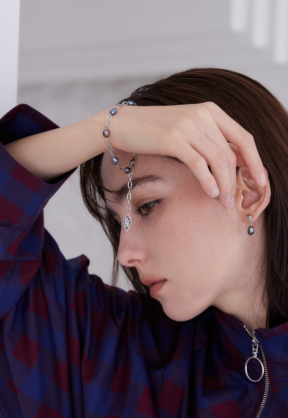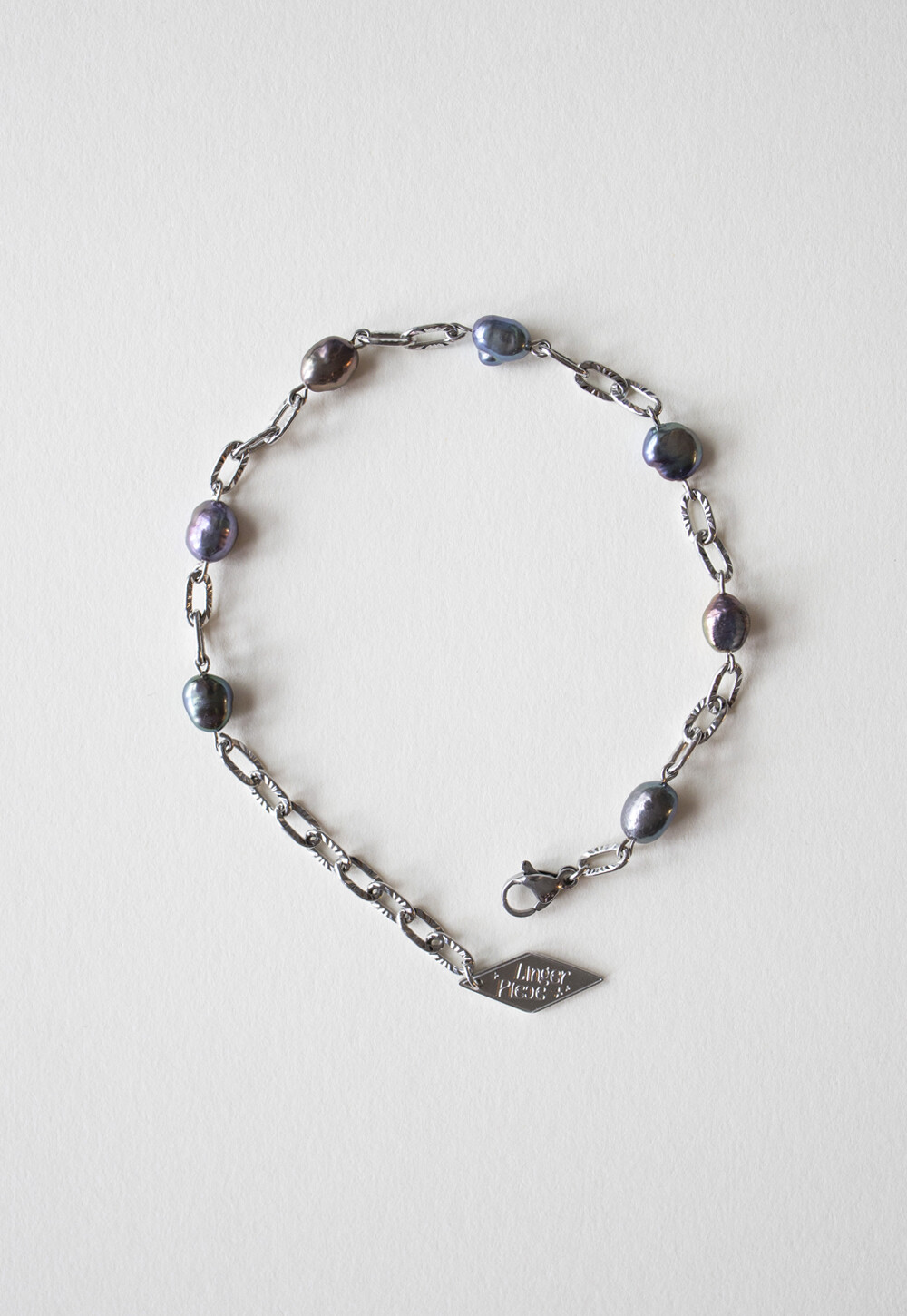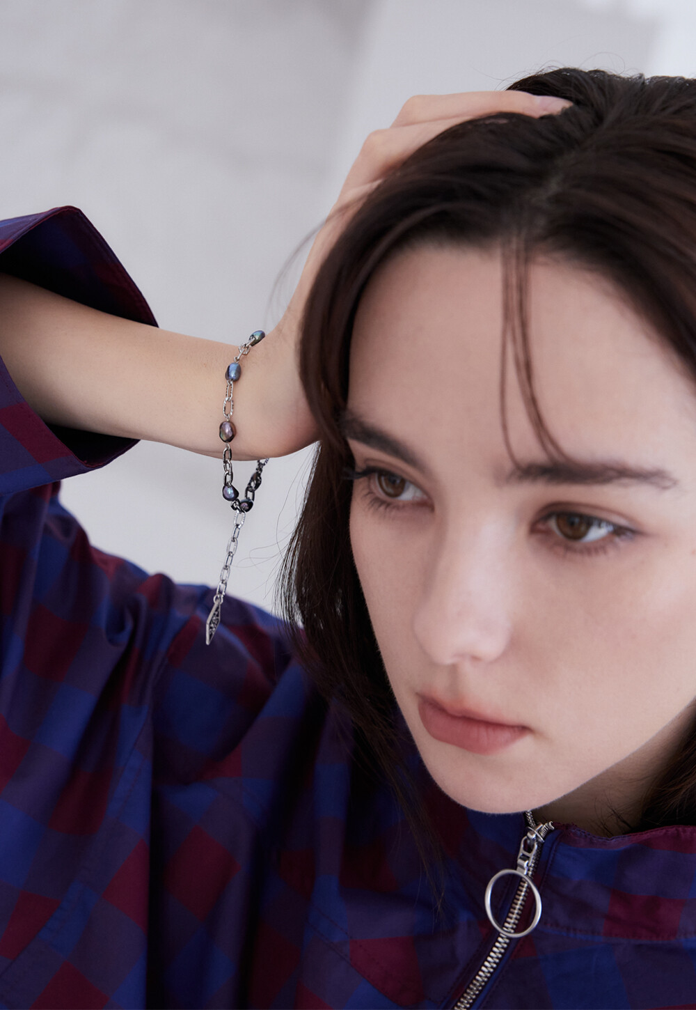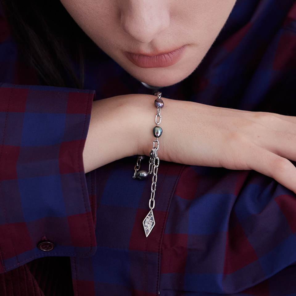 오로라 펄 빛깔이 감도는 블랙 담수진주와 클립 체인이 매치된 팔찌. 블랙 담수진주는 천연 진주 소재 특성상 크기와 형태, 빛깔들이 개체마다 다른 매력이 있습니다. 전체 써지컬 스틸 소재로 마감되어 알러지와 변색 걱정없이 착용하기 좋습니다.