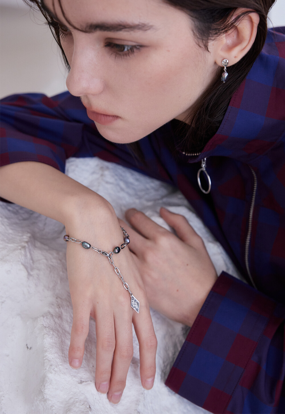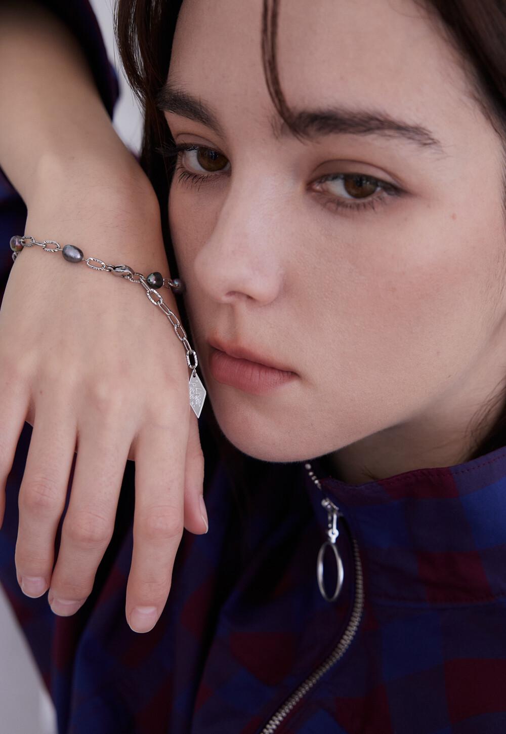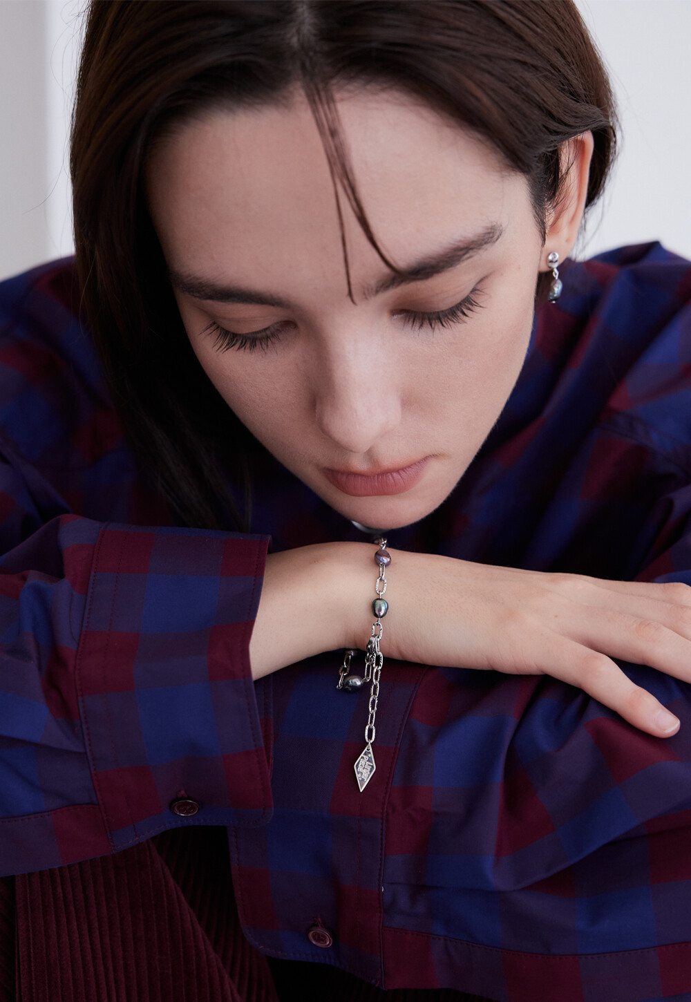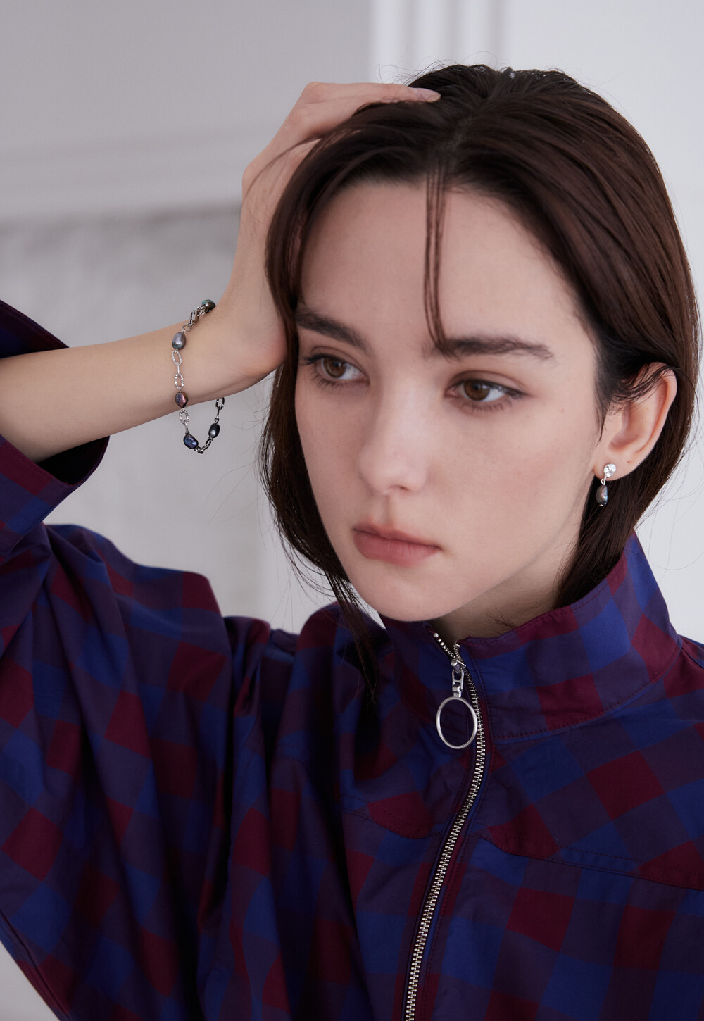 오로라 펄 빛깔이 감도는 블랙 담수진주와 클립 체인이 매치된 팔찌. 블랙 담수진주는 천연 진주 소재 특성상 크기와 형태, 빛깔들이 개체마다 다른 매력이 있습니다. 전체 써지컬 스틸 소재로 마감되어 알러지와 변색 걱정없이 착용하기 좋습니다.