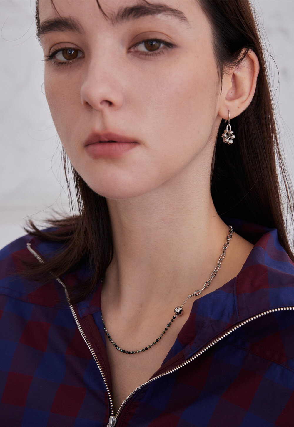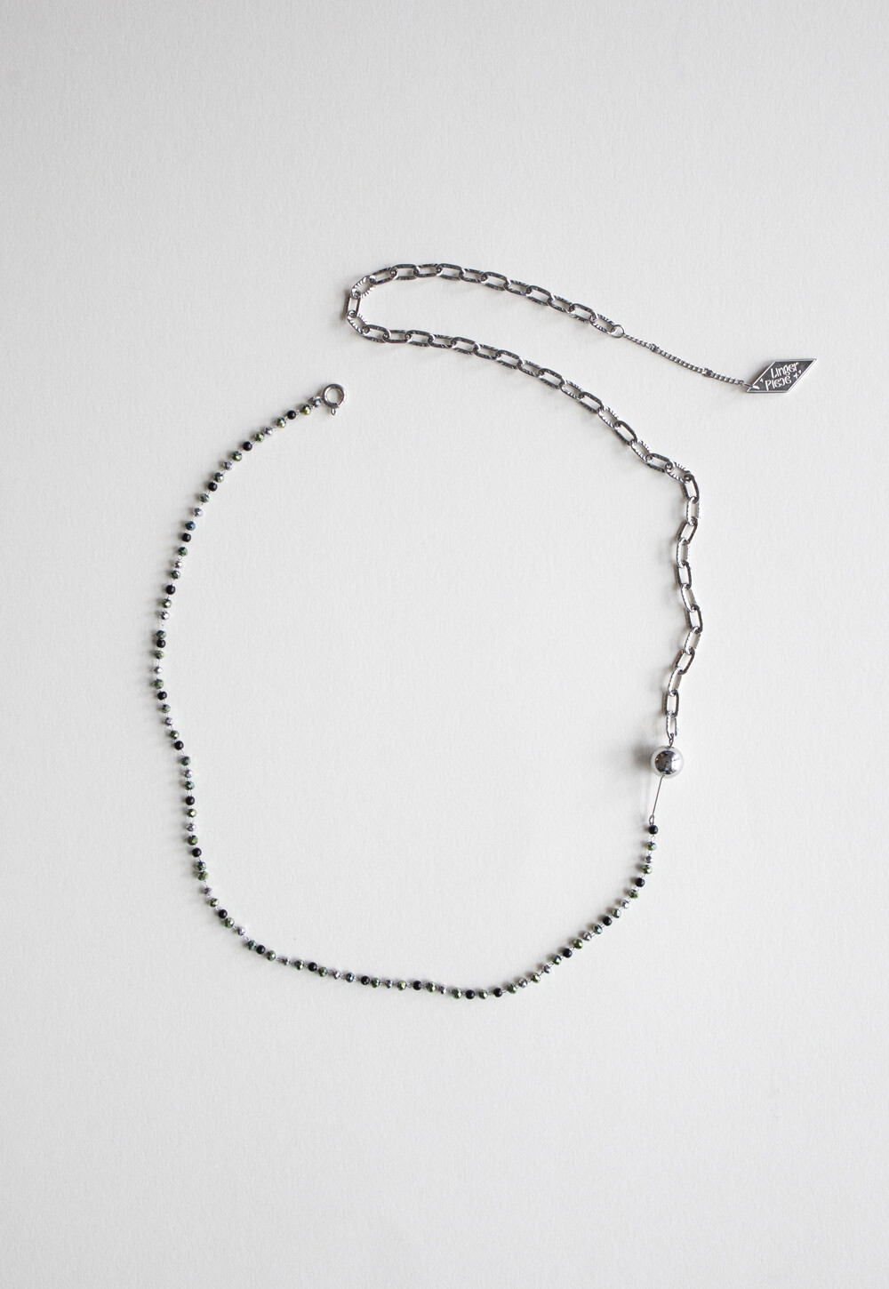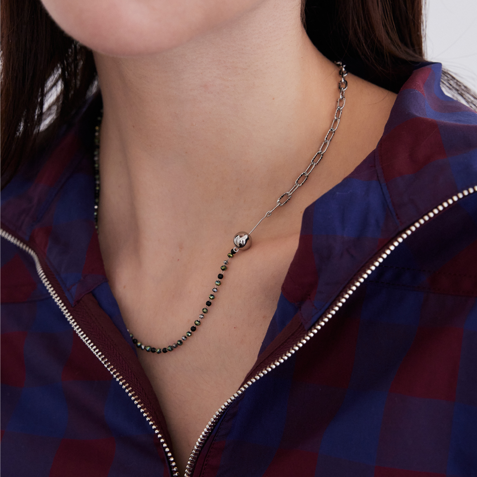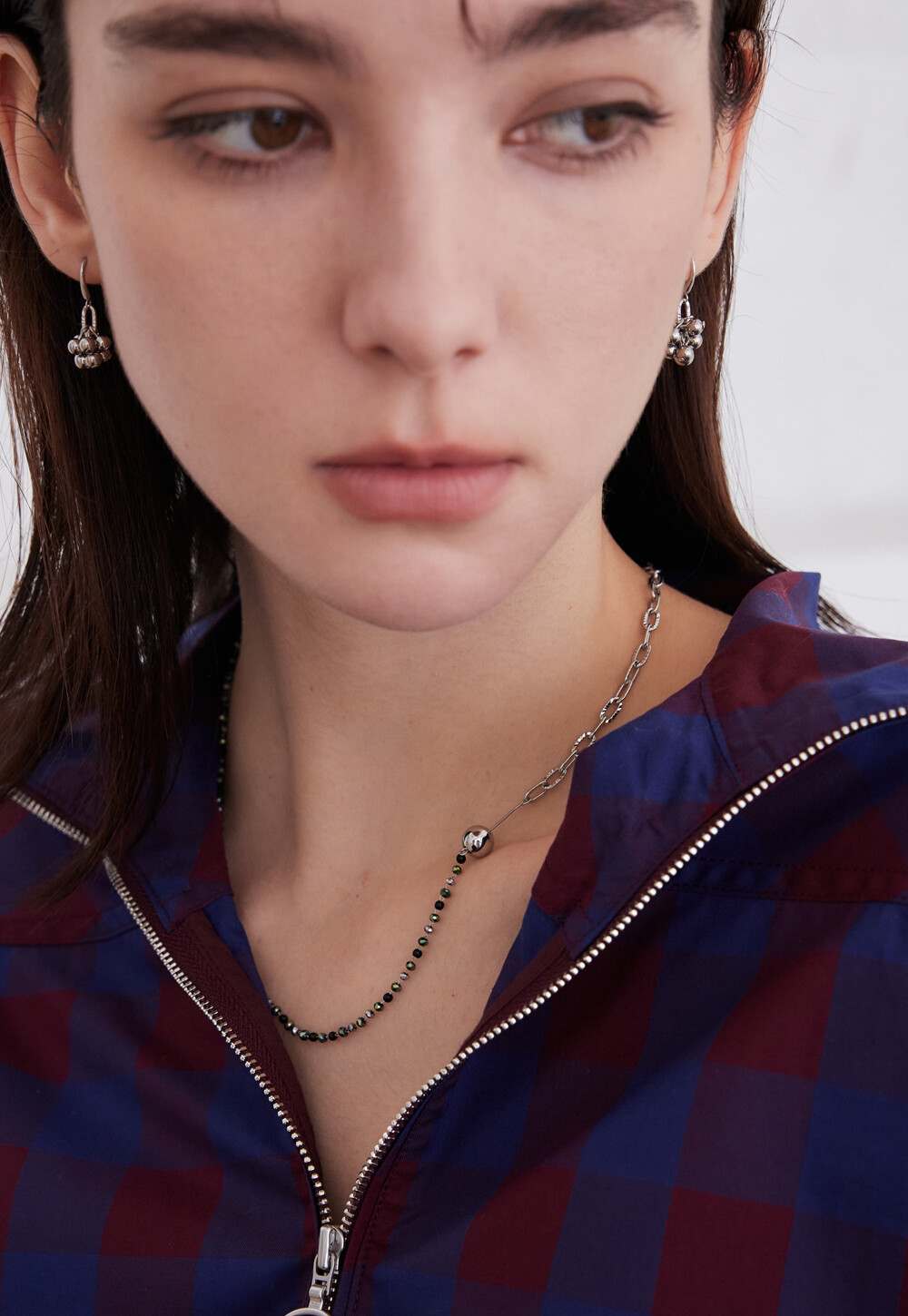 카키 컬러 배열의 은은하게 반짝이는 비즈 체인과 써지컬 볼이 매치된 유니크한 디자인의 목걸이 입니다. 각기 다른 체인이 믹스되고 볼 팬던트가 매치되어 디자인의 다양성을 살린 아이템입니다. 캐주얼하게 착용하기 좋은 디자인으로 추천합니다.