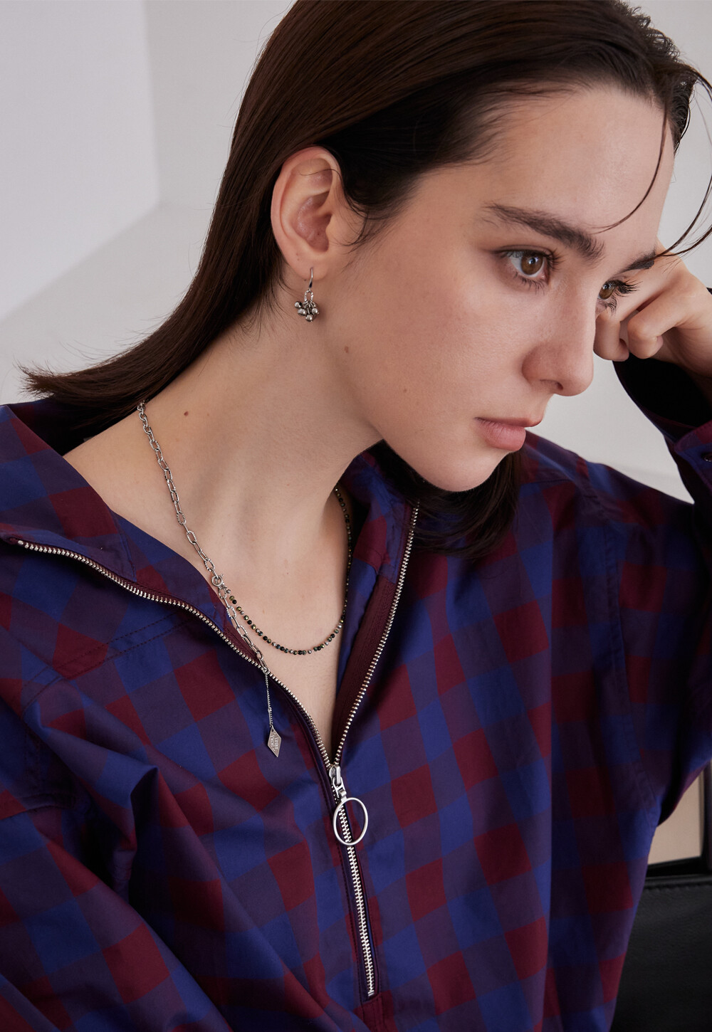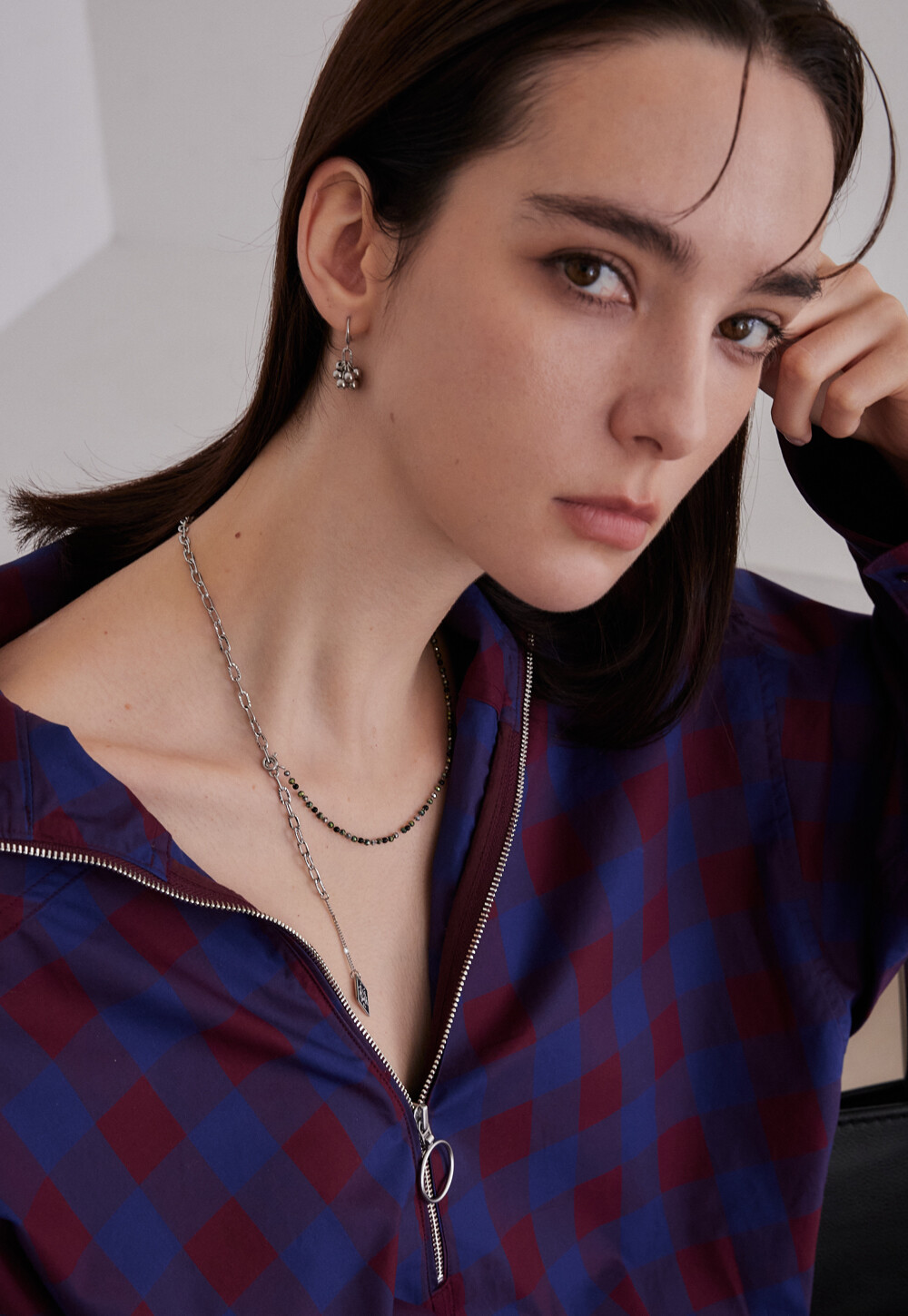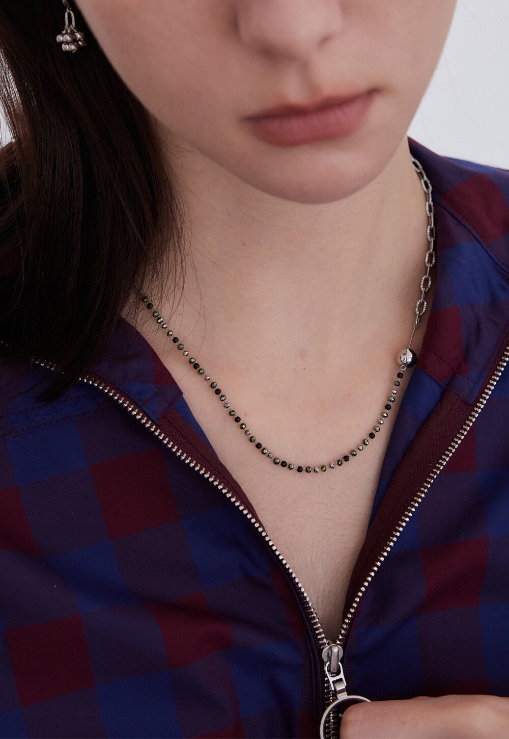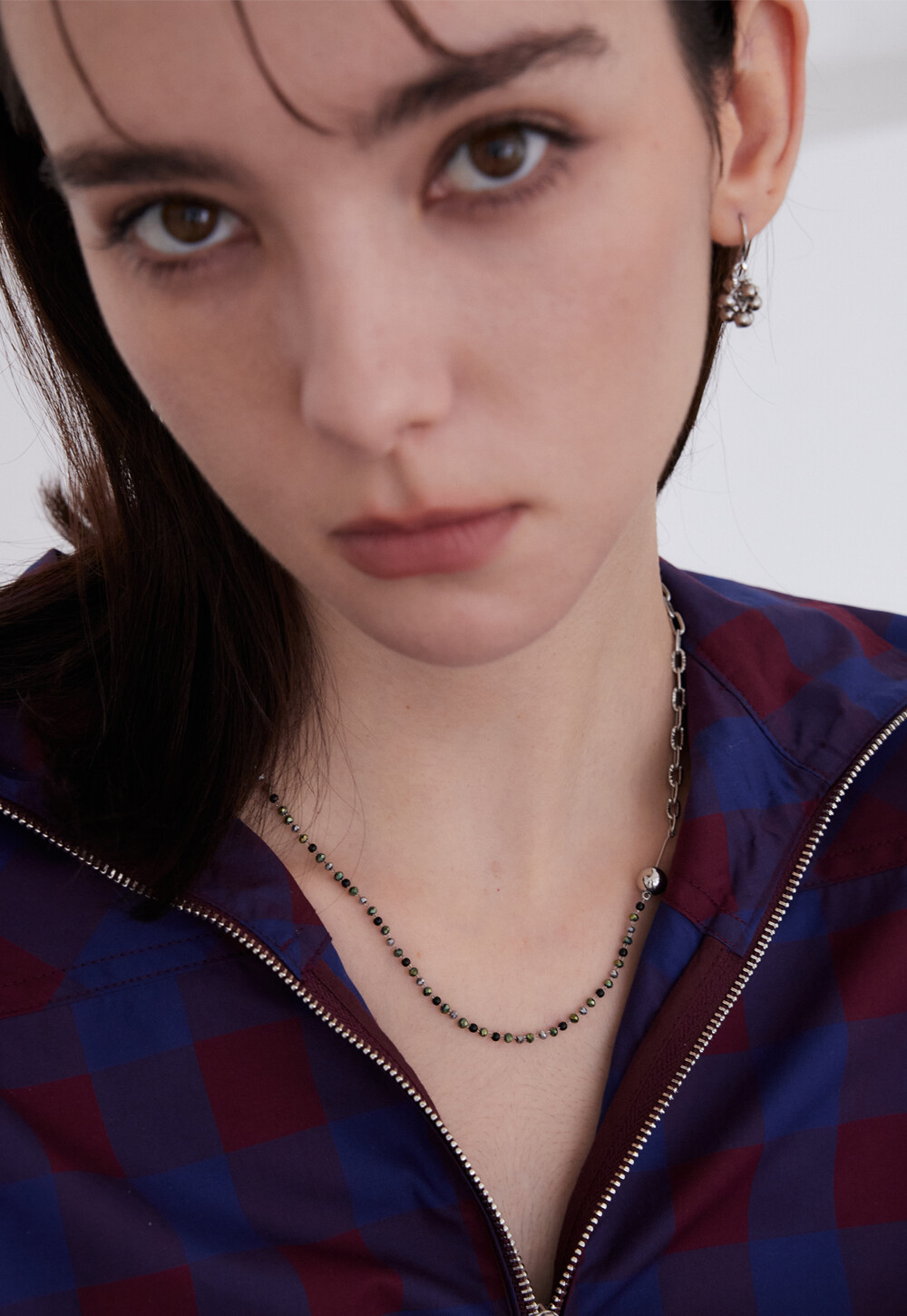 카키 컬러 배열의 은은하게 반짝이는 비즈 체인과 써지컬 볼이 매치된 유니크한 디자인의 목걸이 입니다. 각기 다른 체인이 믹스되고 볼 팬던트가 매치되어 디자인의 다양성을 살린 아이템입니다. 캐주얼하게 착용하기 좋은 디자인으로 추천합니다.