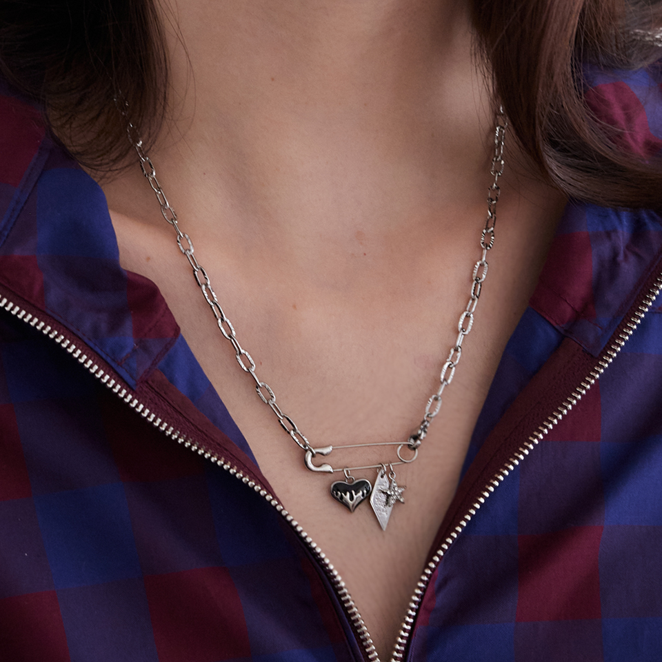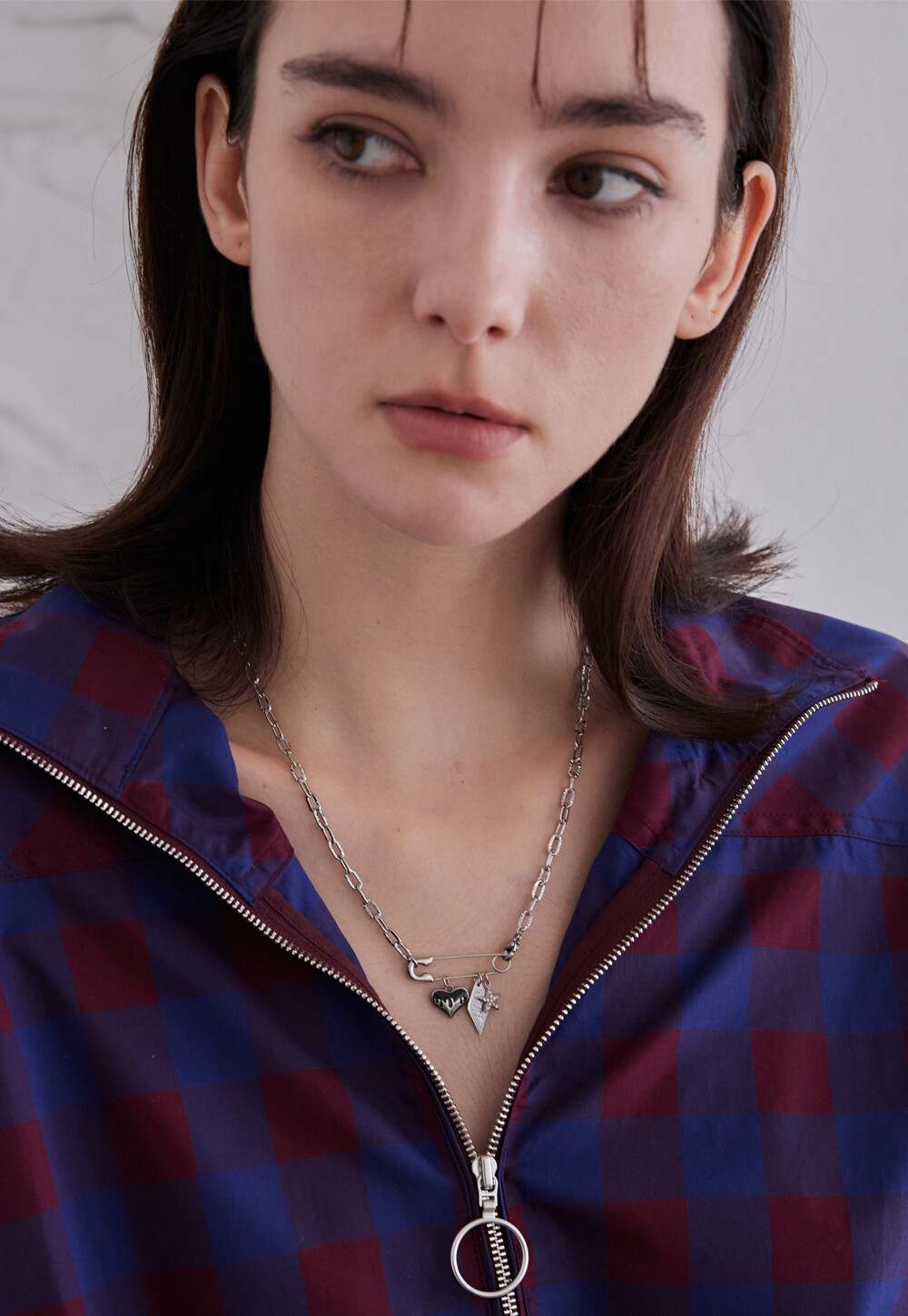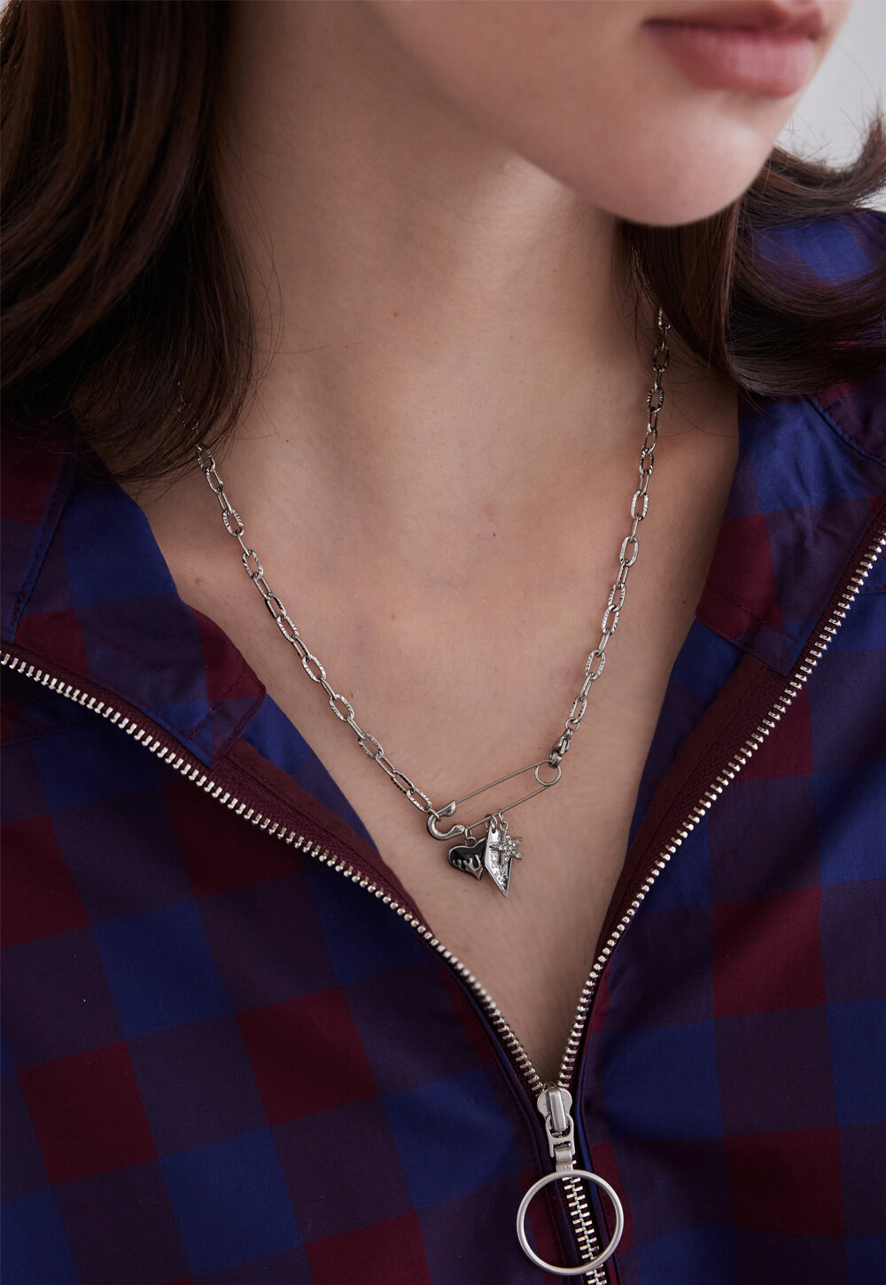 다양한 팬던트가 클립에 달려있는 유니크한 디자인의 목걸이 입니다. 전체 써지컬 스틸 소재로 제작되어 알러지와 변색 걱정없이 착용하기 좋습니다. 다양한 스타일에 특별한 포인트를 줄 수 있는 매력적인 아이템으로 추천합니다.