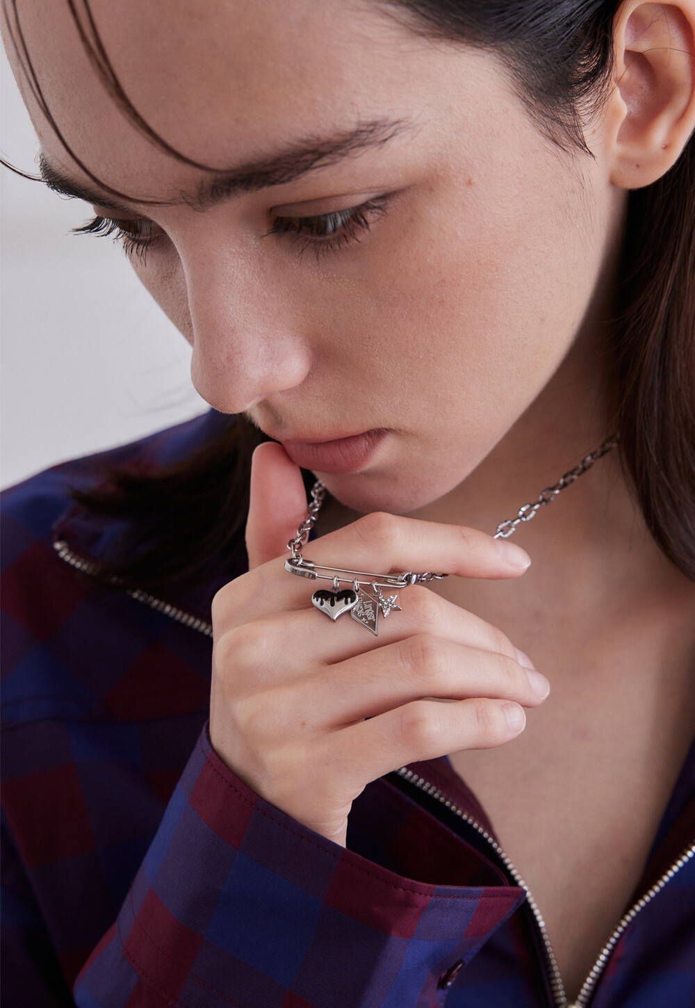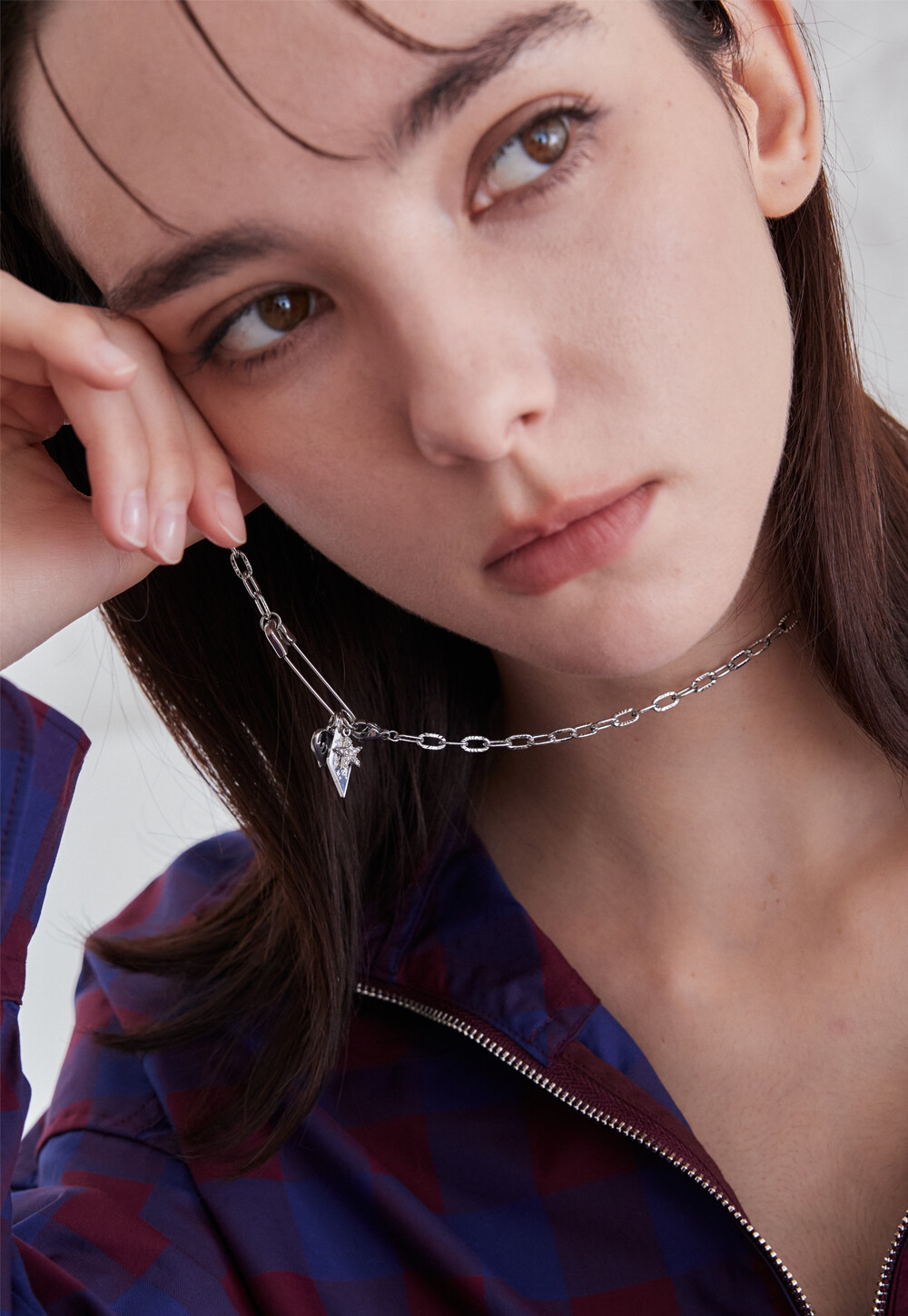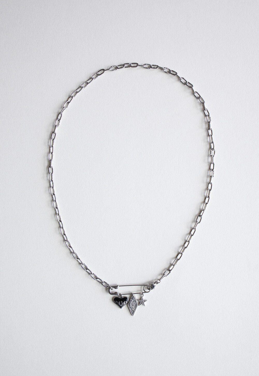 다양한 팬던트가 클립에 달려있는 유니크한 디자인의 목걸이 입니다. 전체 써지컬 스틸 소재로 제작되어 알러지와 변색 걱정없이 착용하기 좋습니다. 다양한 스타일에 특별한 포인트를 줄 수 있는 매력적인 아이템으로 추천합니다.