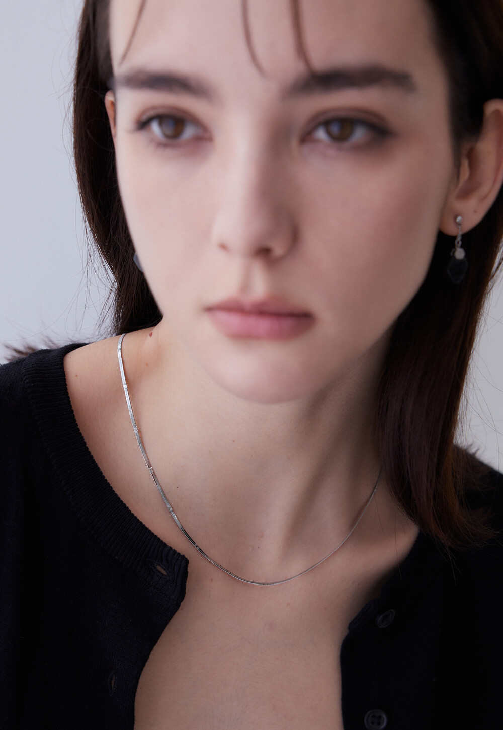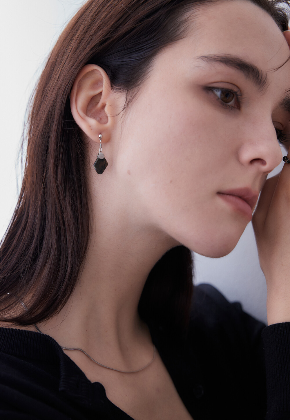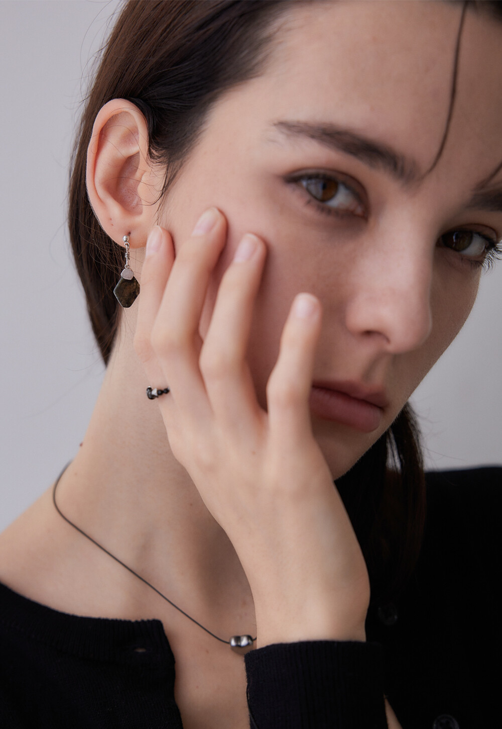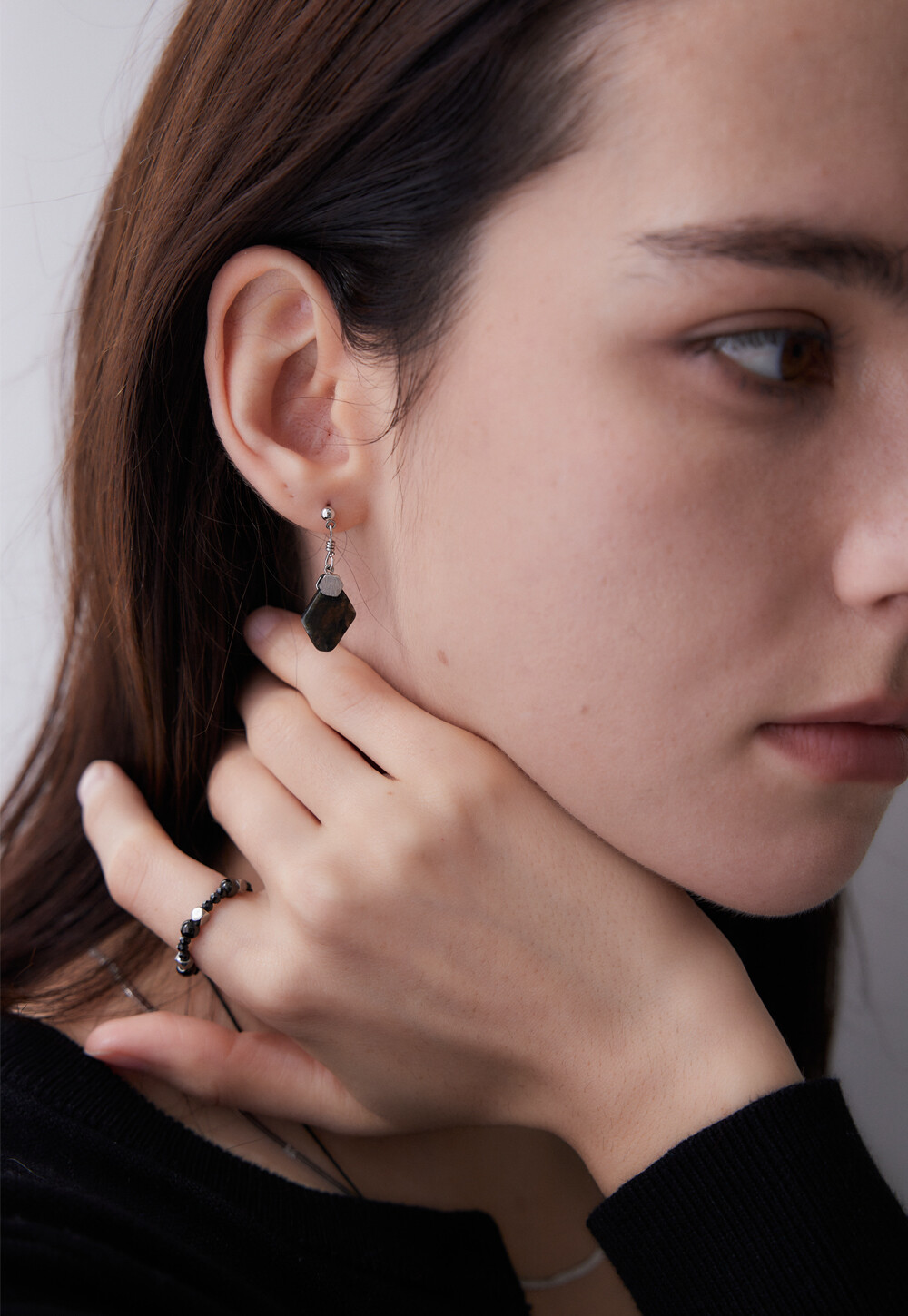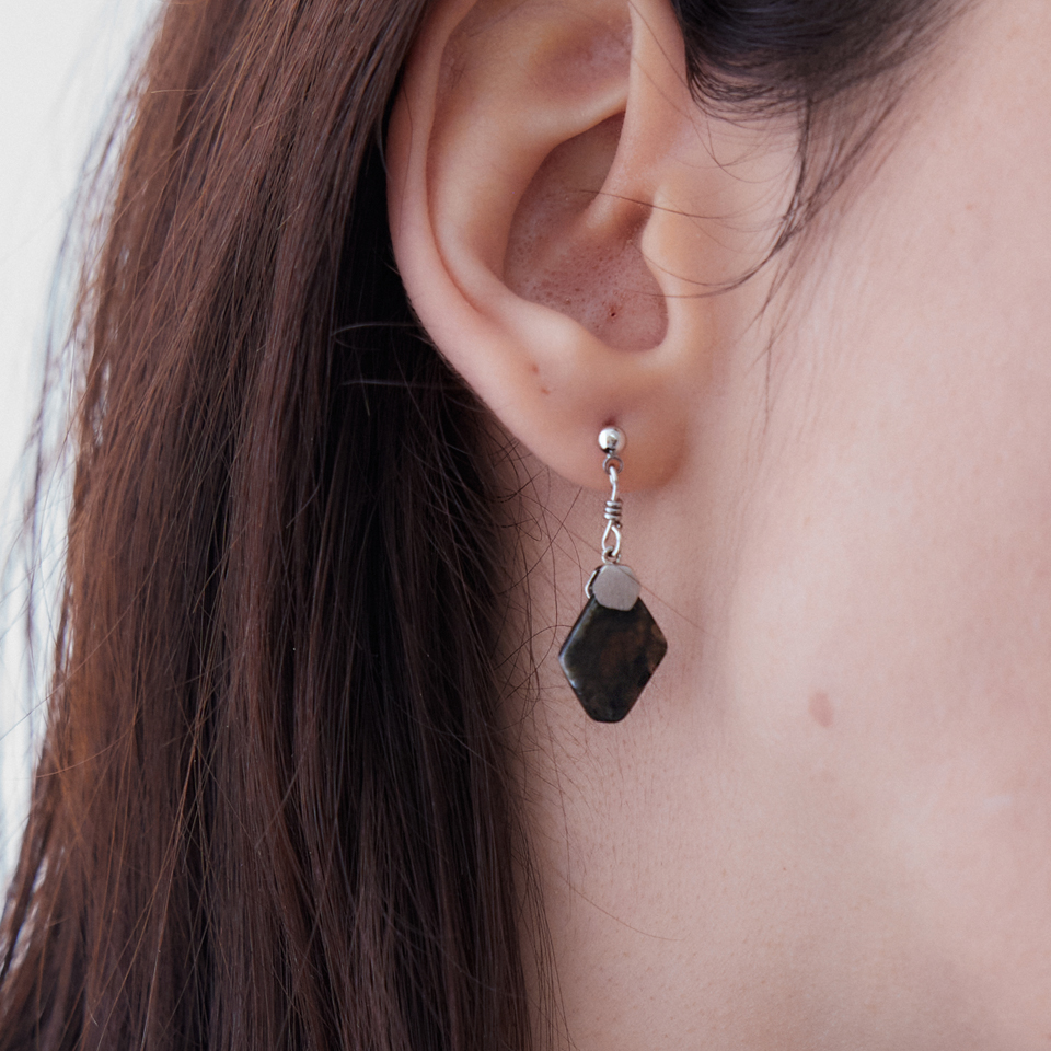 레브라도라이트 천연 원석으로 제작한 고급스럽고 유니크한 무드를 자아내는 귀걸이. 가벼우면서도 분위기 있게 연출하기 좋은 디자인이며, 925 실버침으로 알러지를 예방합니다. 어떤 스타일에도 깔끔하고 무드 있게 연출할 수 있는 아이템 입니다.