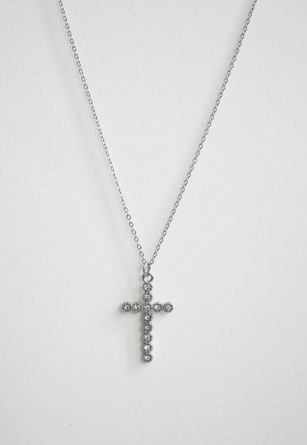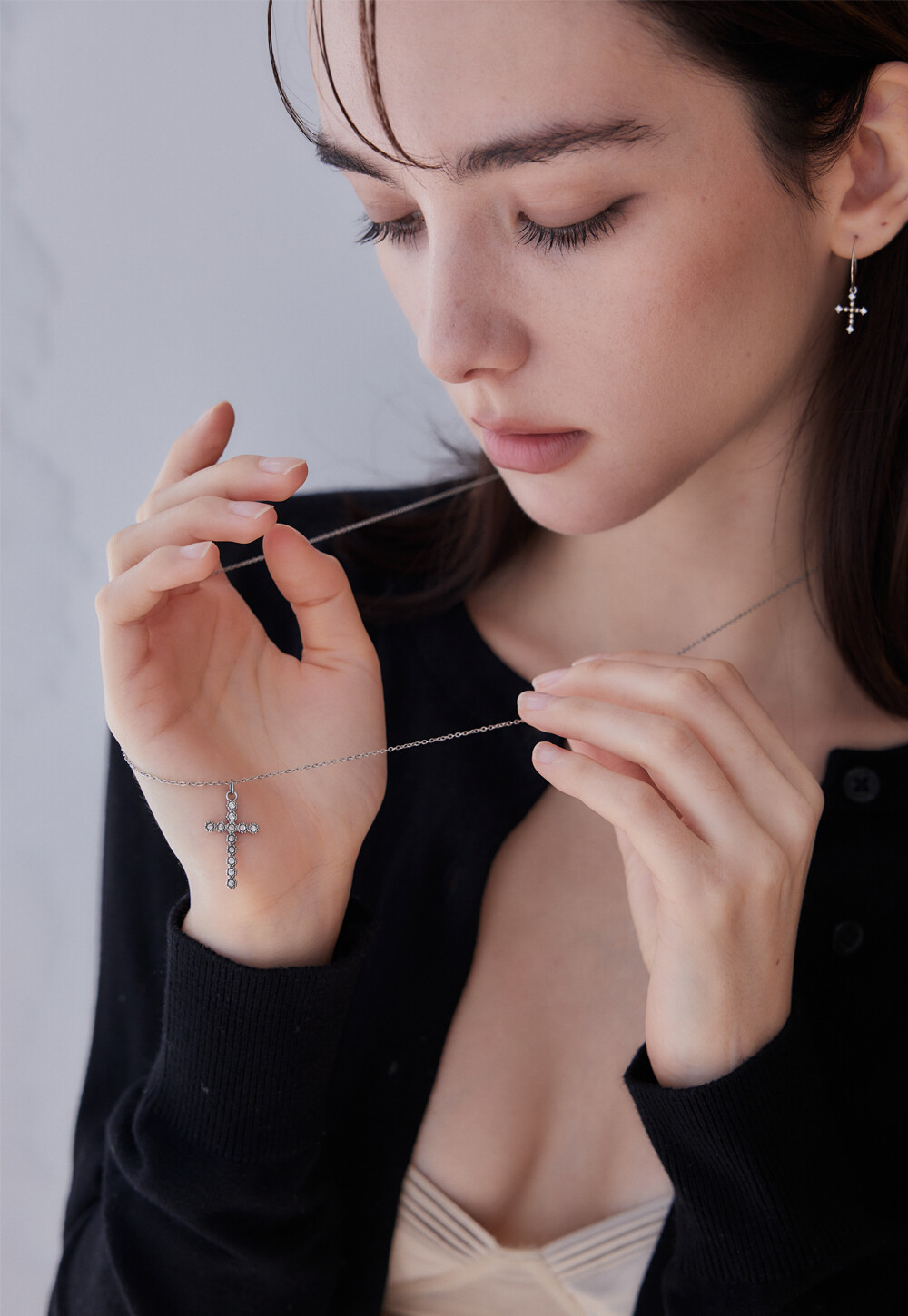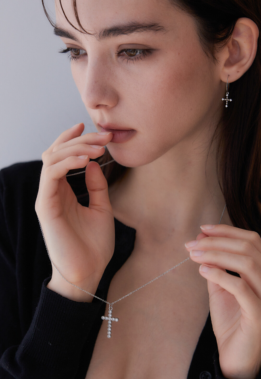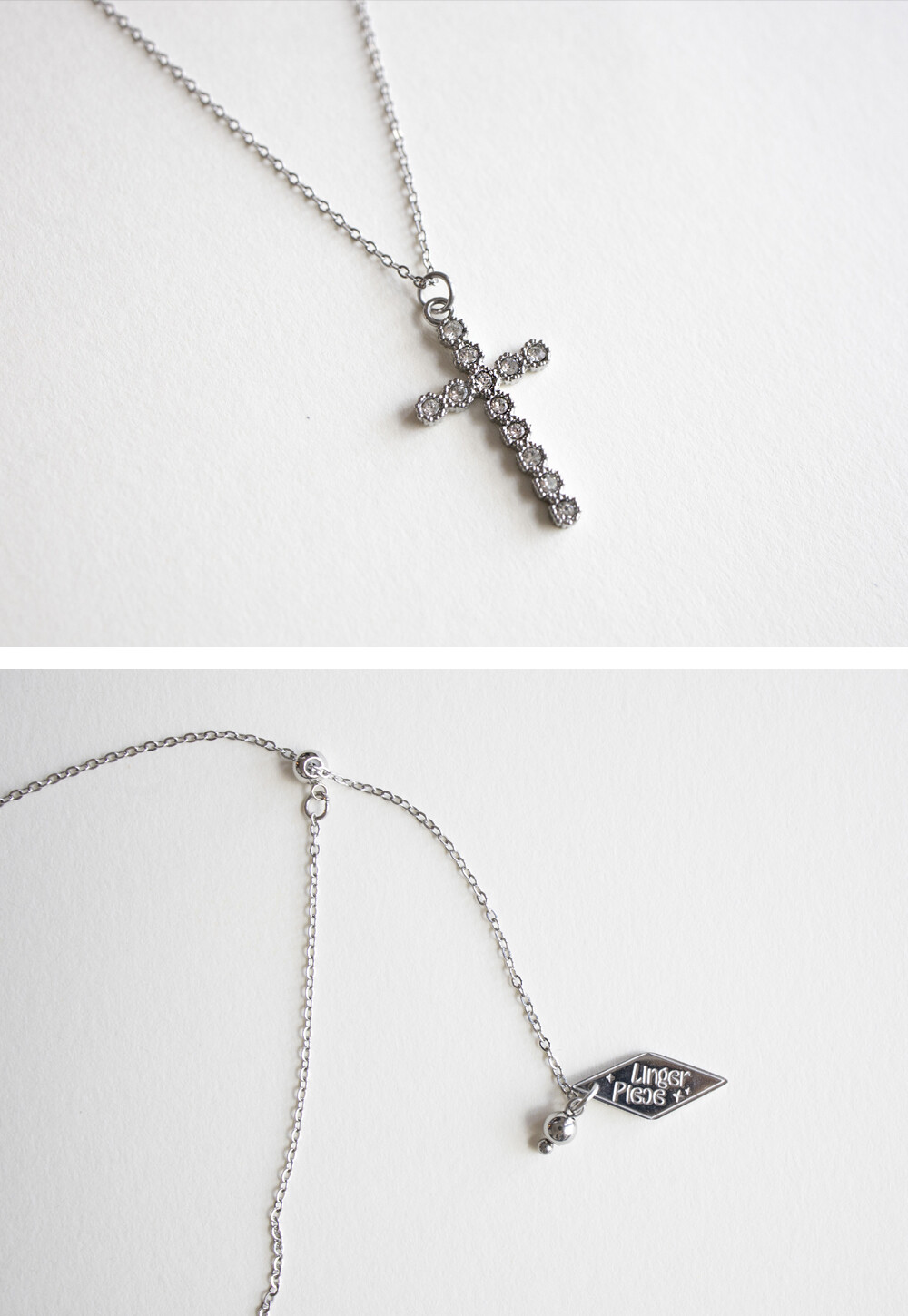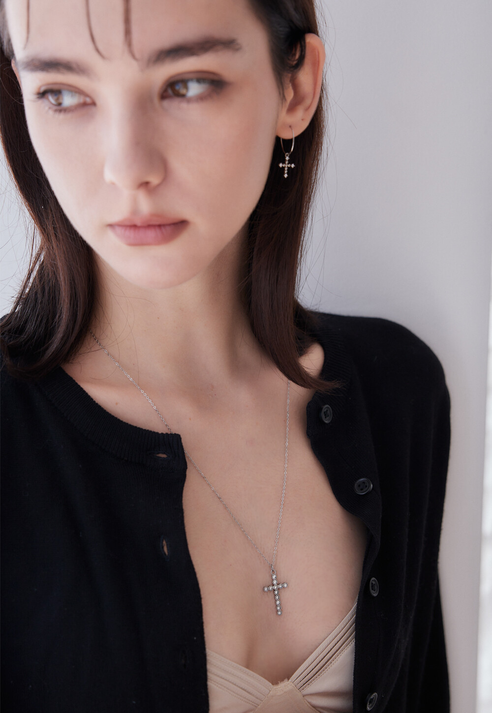 얇은 써지컬 소재의 체인과 라운드 스톤이 박힌 십자가 팬던트로 포인트를 준 디자인. 존재감 있는 크로스 팬던트와 다양하게 길이 조정이 가능한 체인으로 웨어러블하게 스타일링하기 좋은 목걸이로 추천하는 아이템입니다.