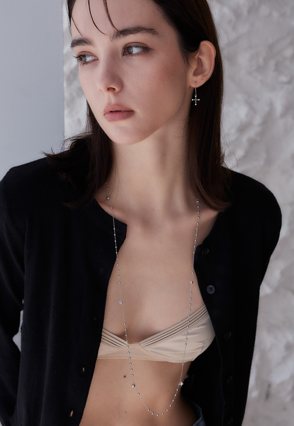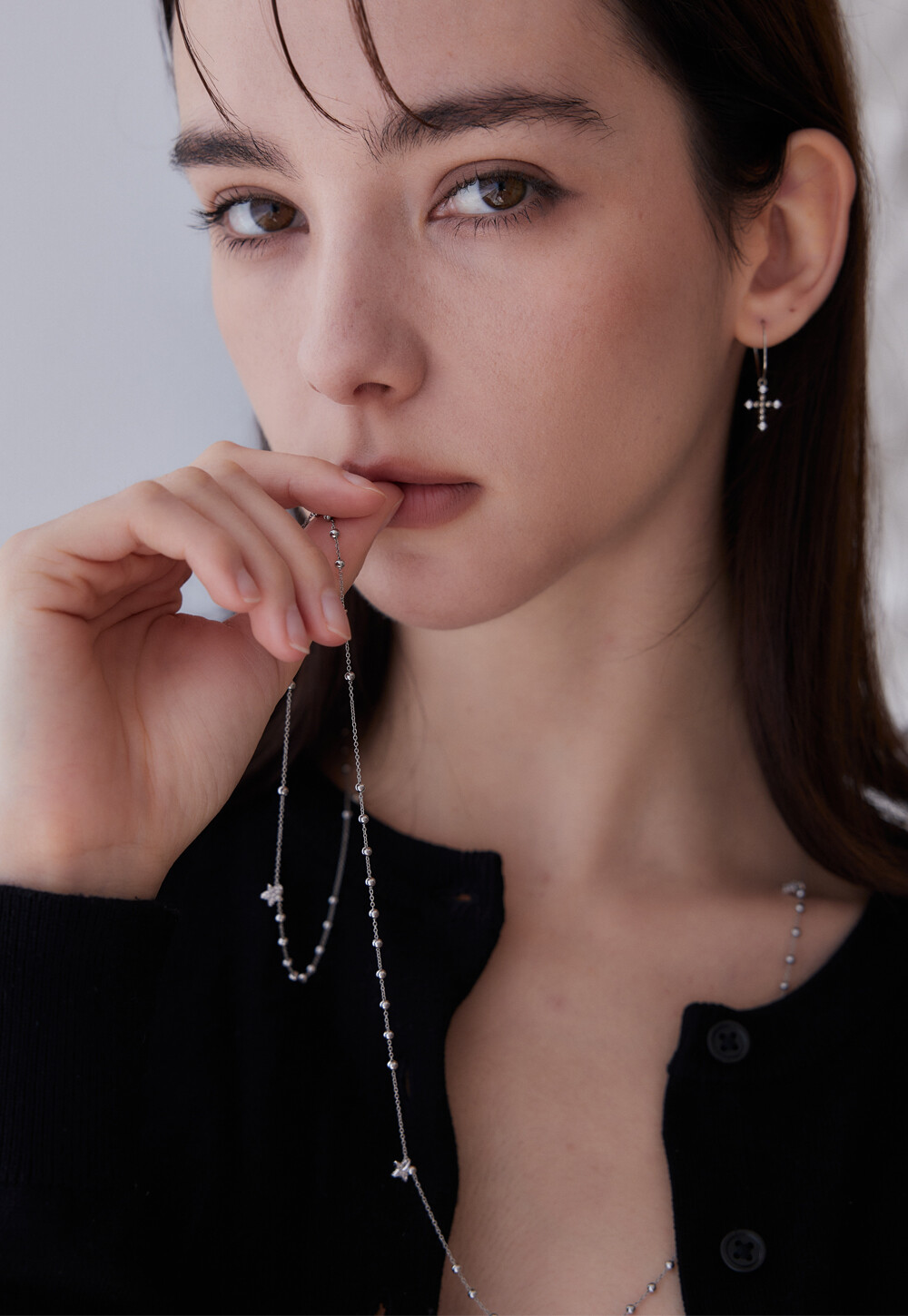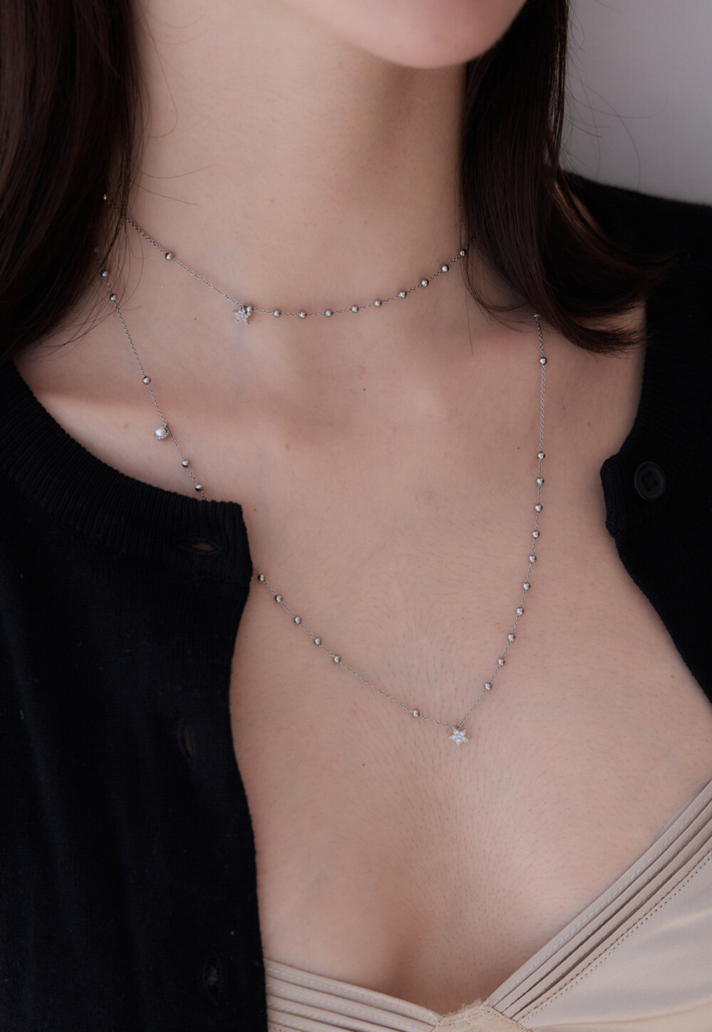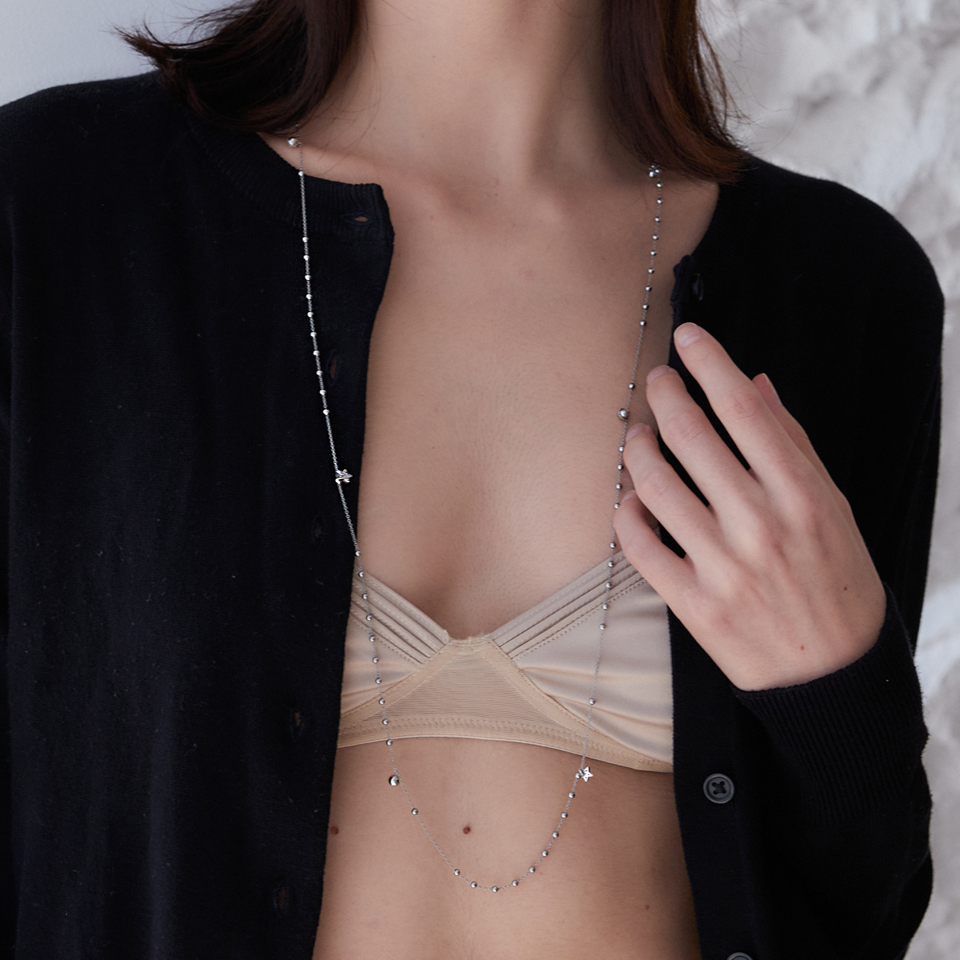 볼 패턴의 체인이 길게 늘어진 롱 디자인의 목걸이. 슬림한 써지컬 볼 체인과 반짝이는 작은 별과 진주 팬던트로 포인트를 준 디자인. 긴 길이의 체인으로 길게 또는 감아서 두줄로도 착용 가능한 2way 스타일. 소장하고 있는 다양한 목걸이와 레이어드하기 좋은 아이템으로 추천합니다.