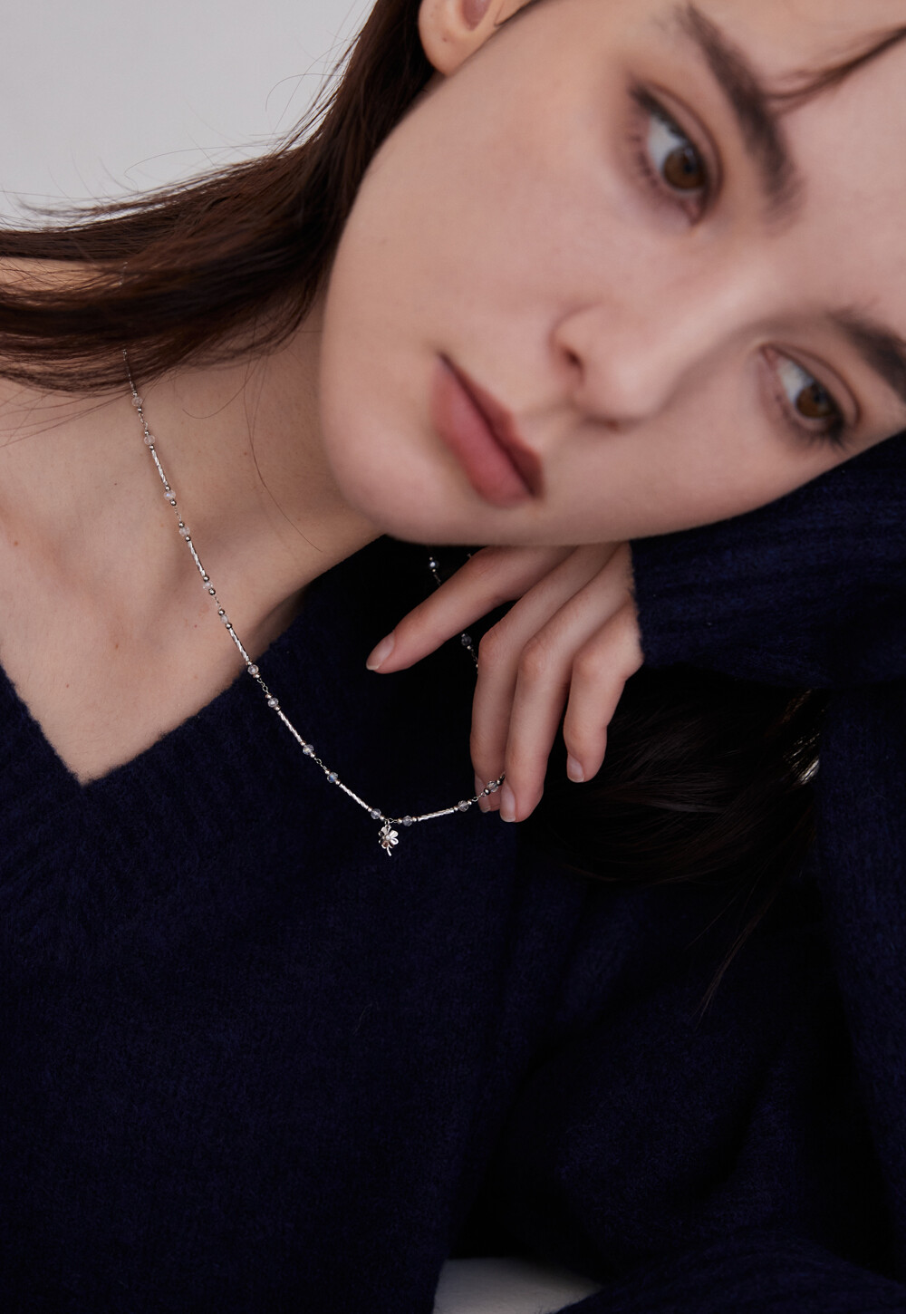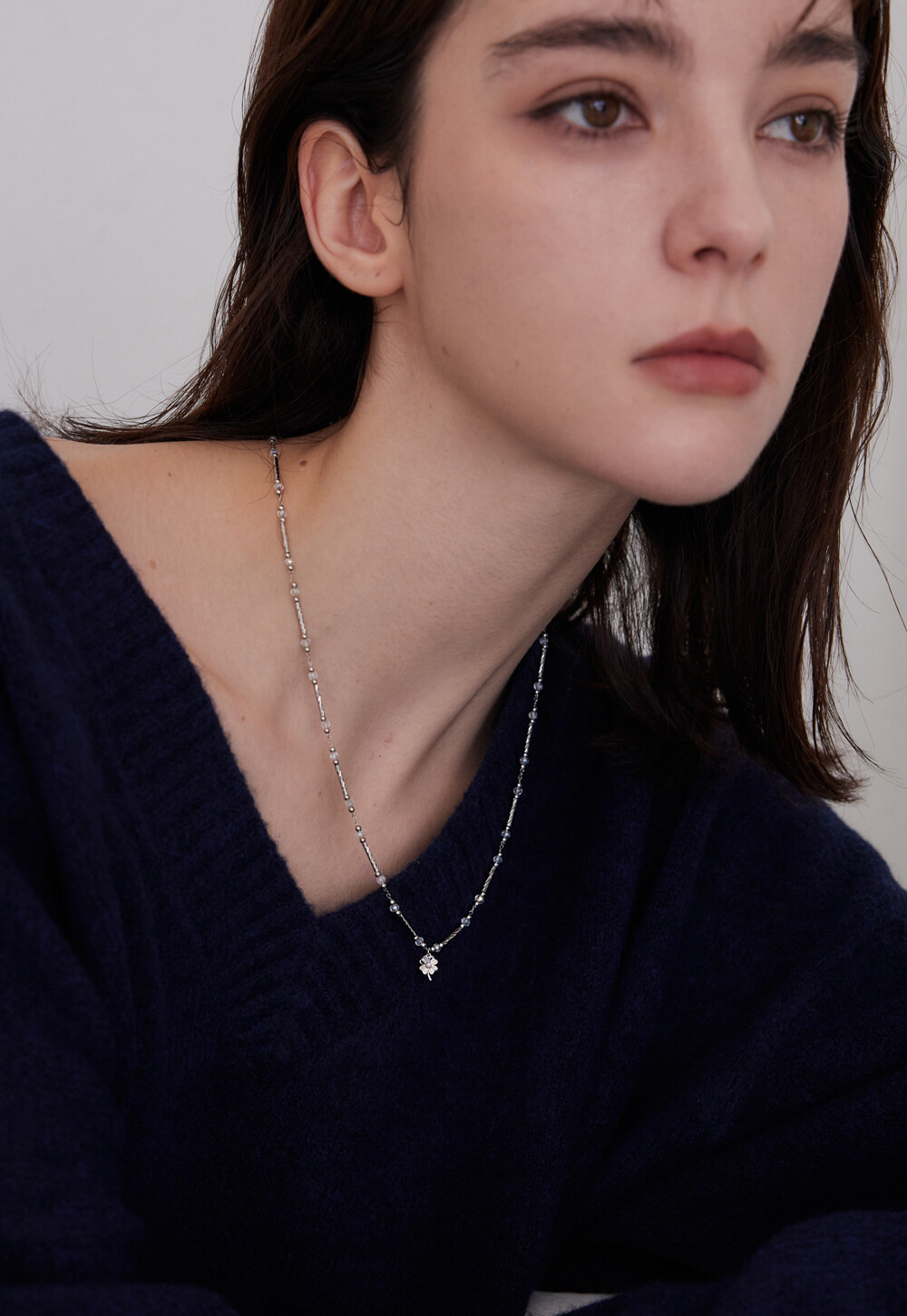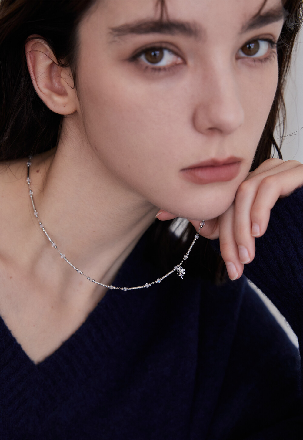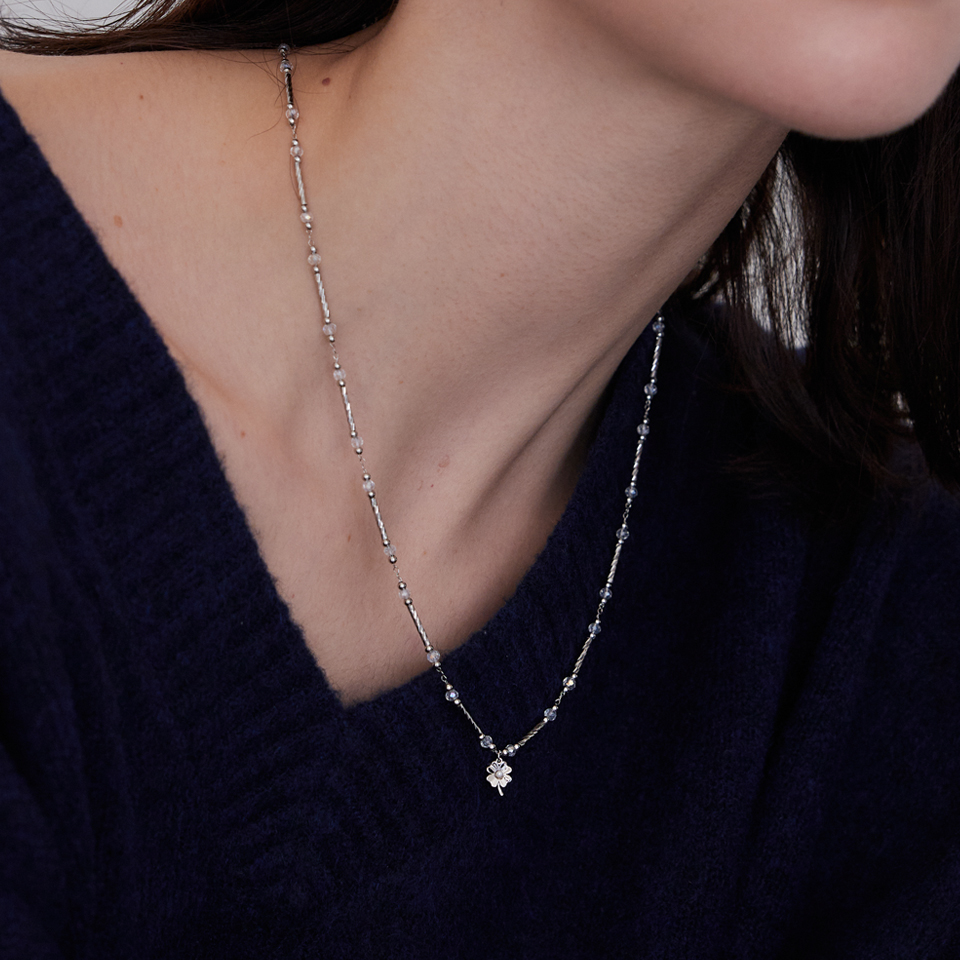 크리스탈 장식 체인과 함께 미니 사이즈의 클로버 팬던트가 매치된 심플하면서도 반짝이는 무드의 목걸이. 많이 튀지 않으면서도 자연스러운 반짝임으로 웨어러블하게 스타일링하기 좋은 디자인 입니다.
