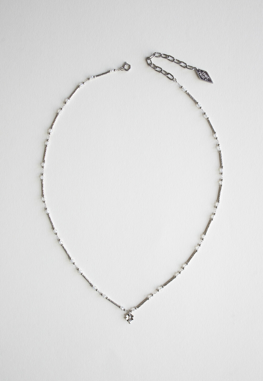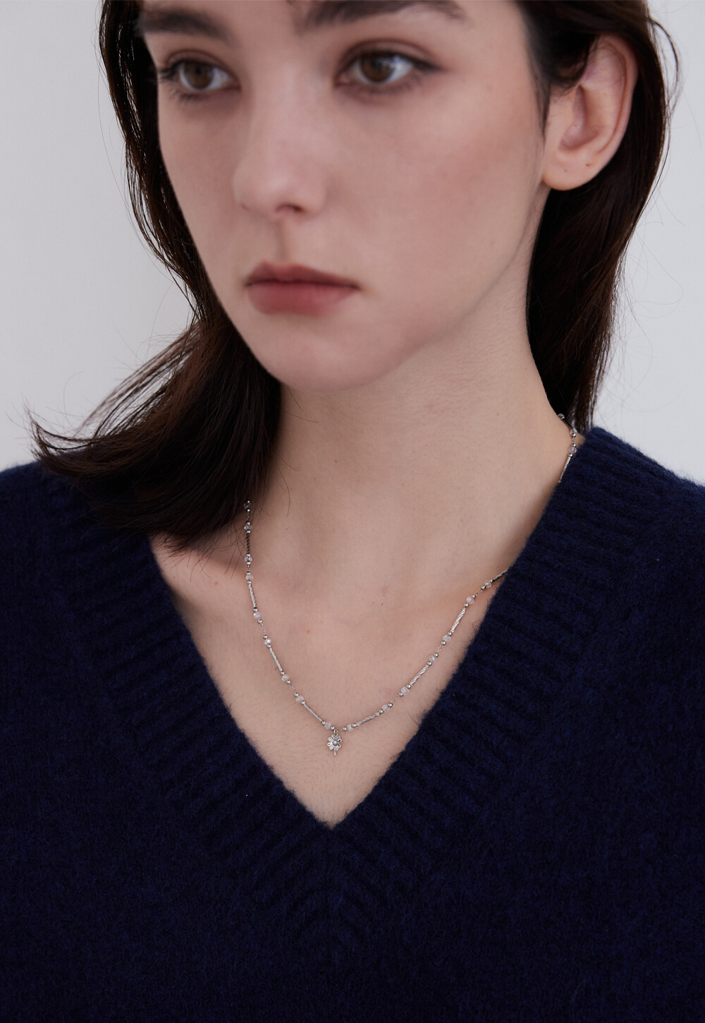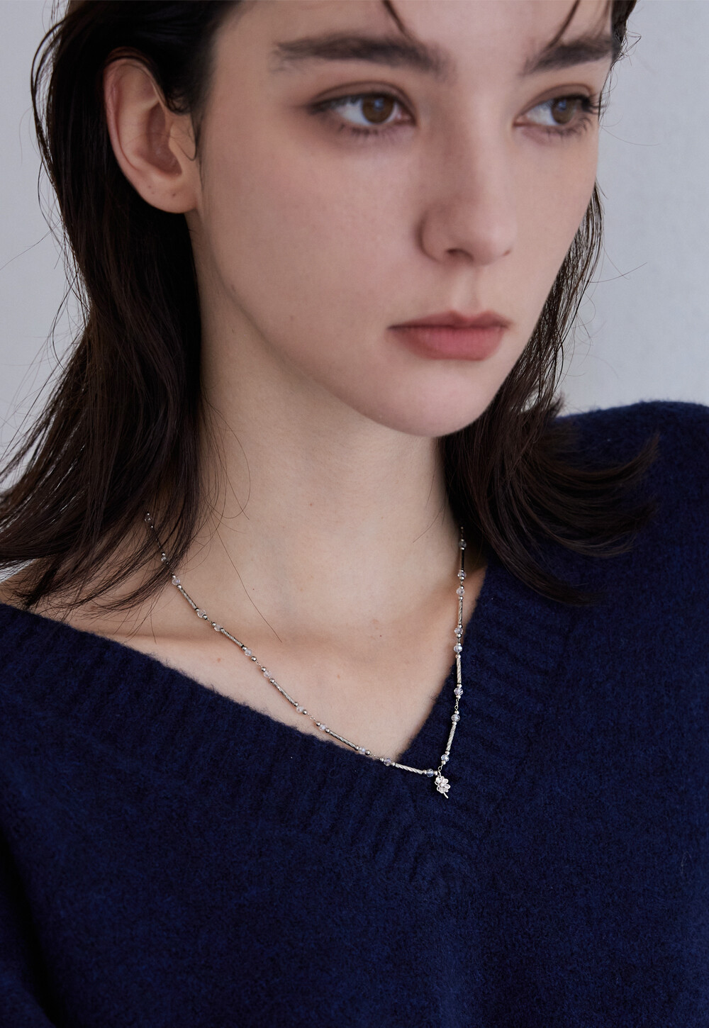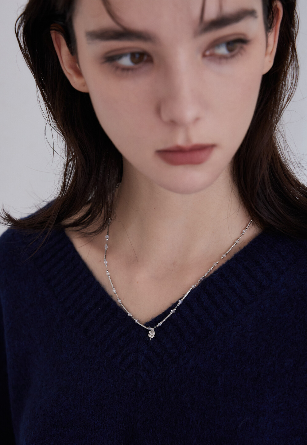 크리스탈 장식 체인과 함께 미니 사이즈의 클로버 팬던트가 매치된 심플하면서도 반짝이는 무드의 목걸이. 많이 튀지 않으면서도 자연스러운 반짝임으로 웨어러블하게 스타일링하기 좋은 디자인 입니다.