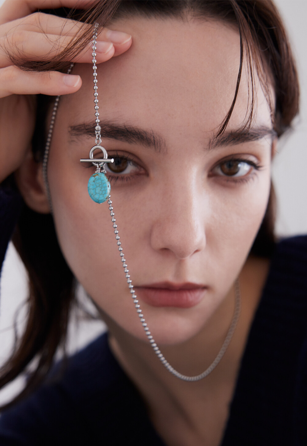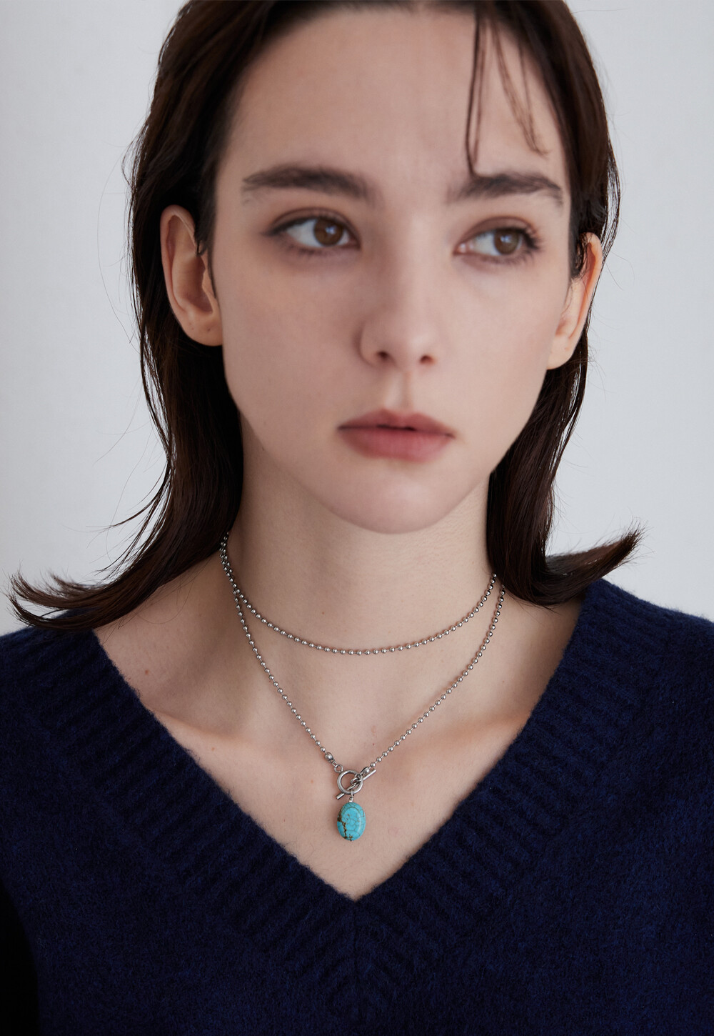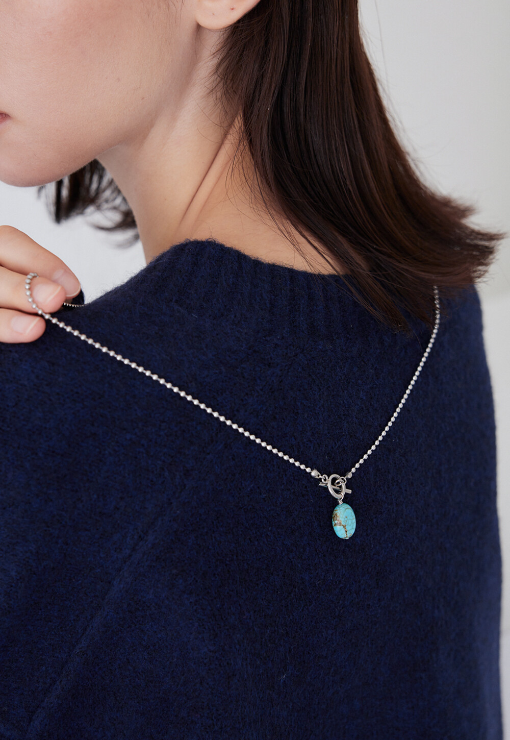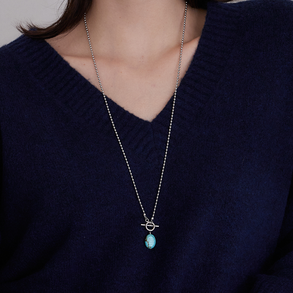 오벌 형태의 묵직한 천연 터키원석을 메인으로 토글바 장식과 볼체인이 매치된 목걸이. 긴 길이감으로 감아서 2줄 착용으로 연출할 수도 있는 2way 디자인 입니다. 계절 상관없이 웨어러블하게 착용할 수 있는 아이템으로 추천합니다.