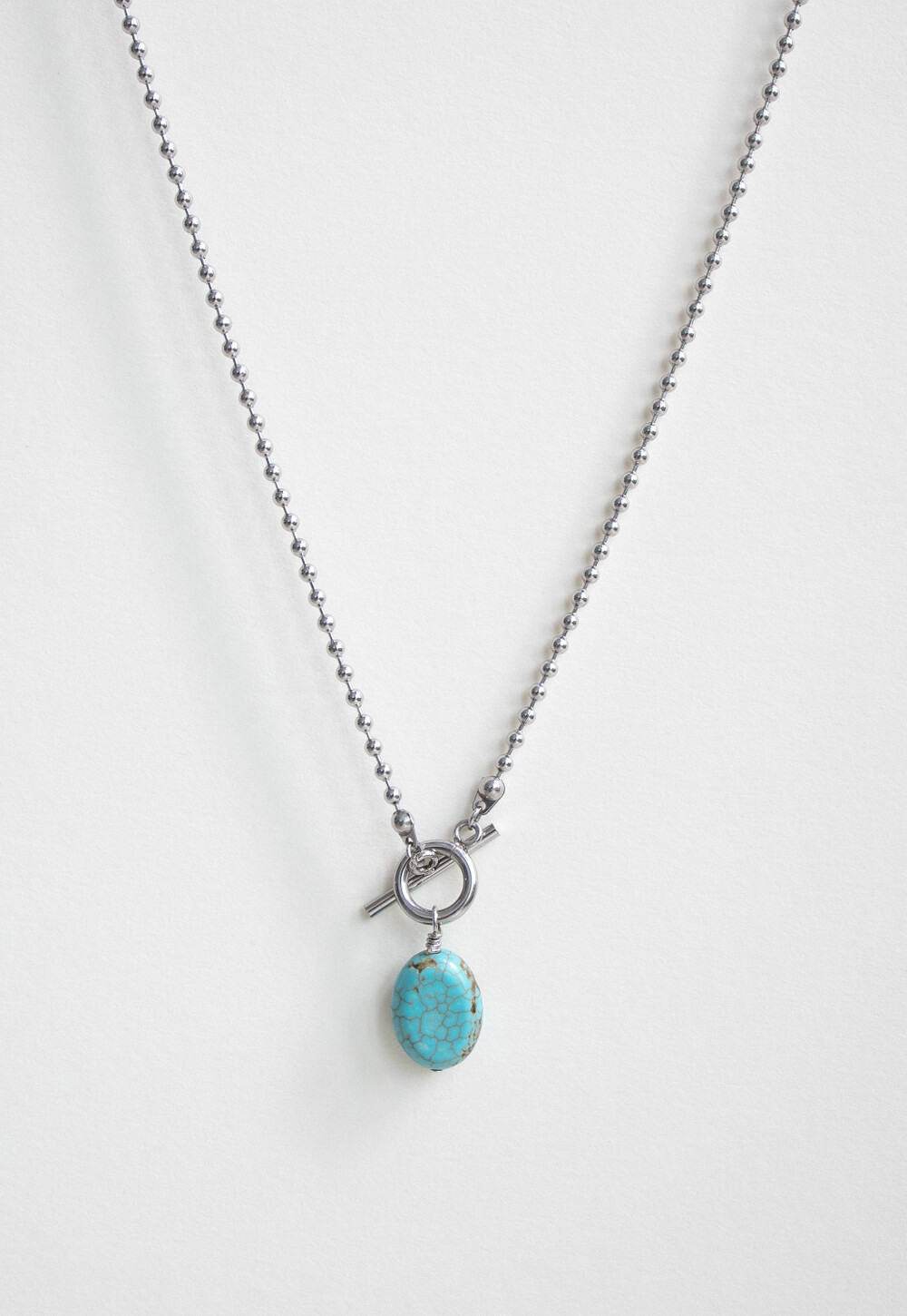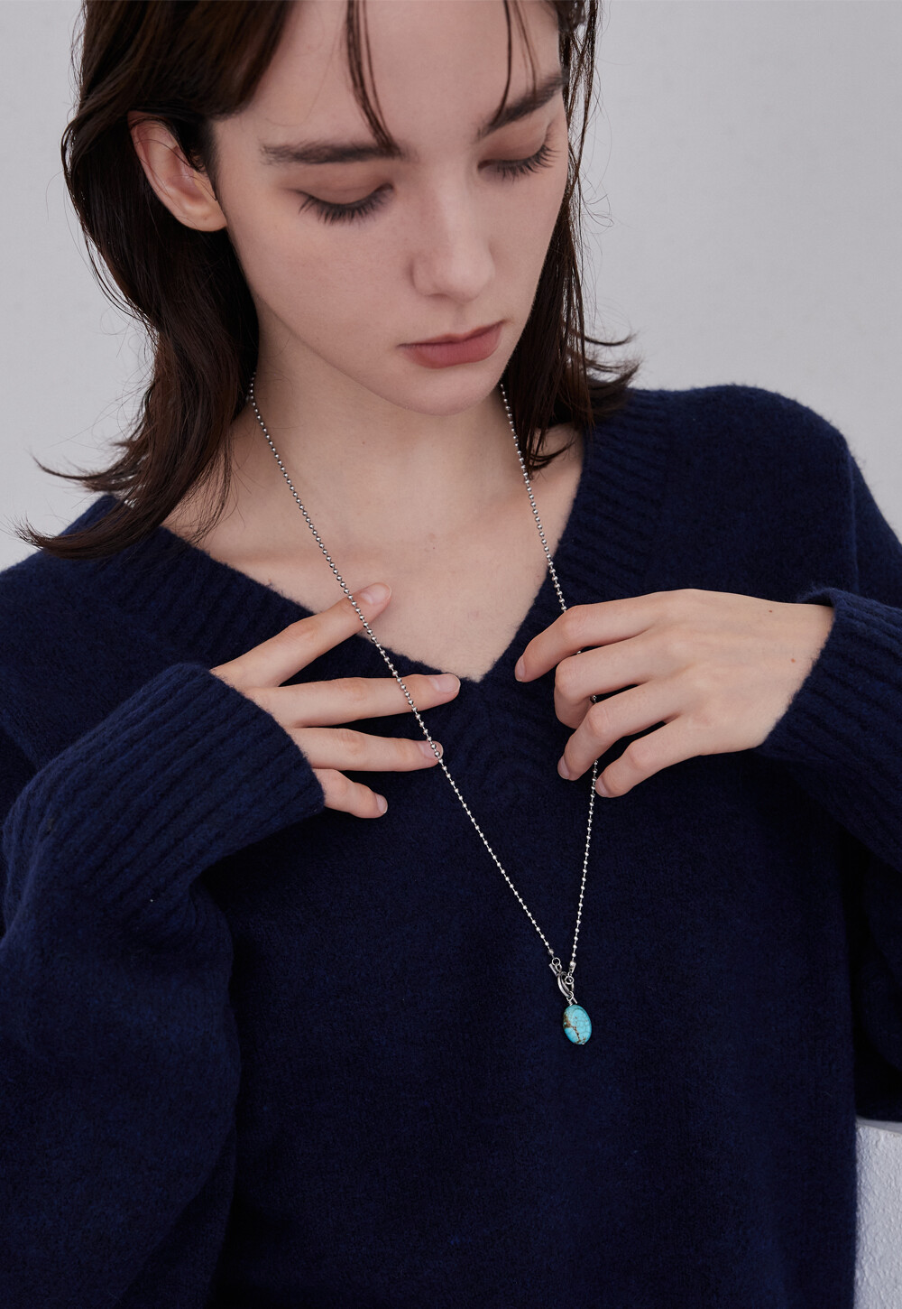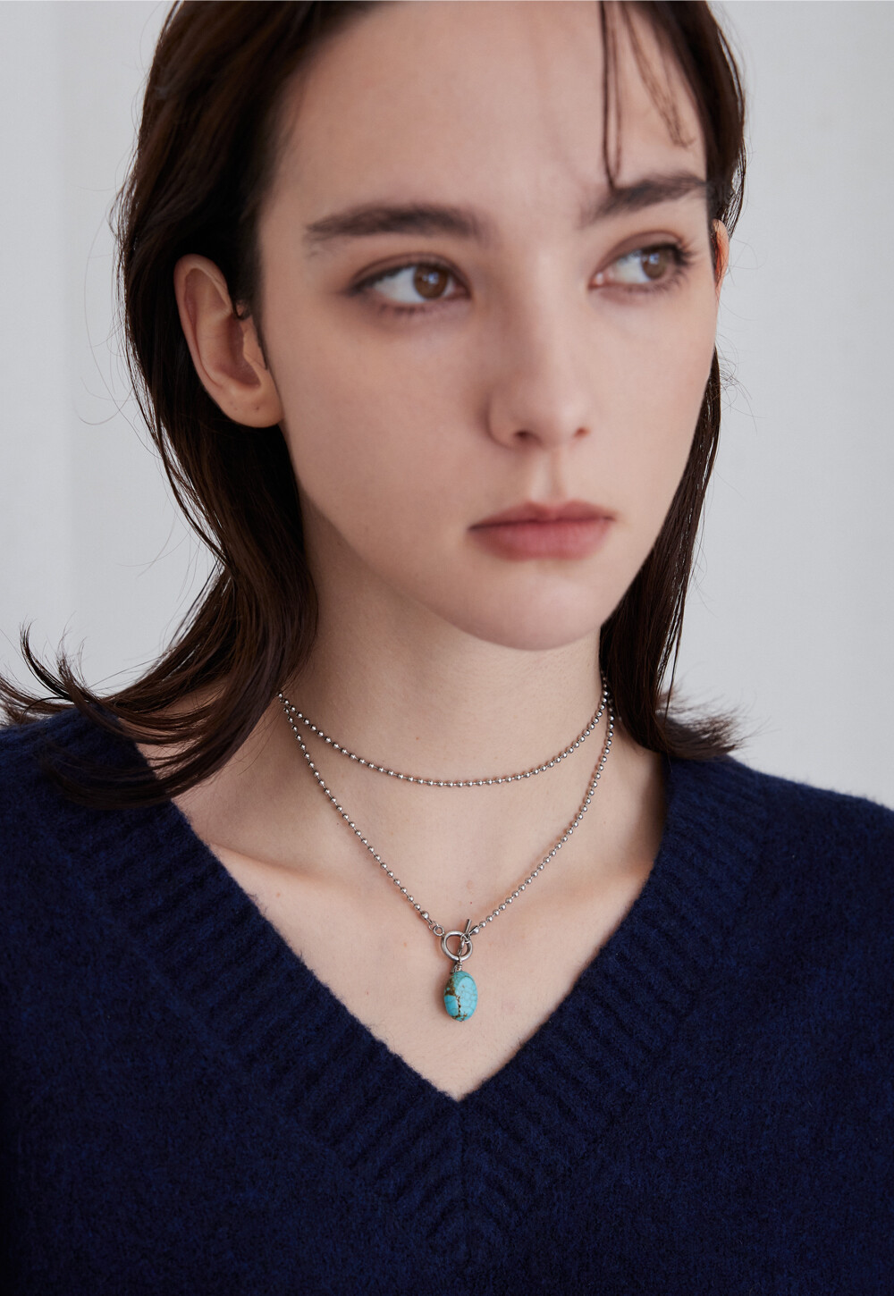 오벌 형태의 묵직한 천연 터키원석을 메인으로 토글바 장식과 볼체인이 매치된 목걸이. 긴 길이감으로 감아서 2줄 착용으로 연출할 수도 있는 2way 디자인 입니다. 계절 상관없이 웨어러블하게 착용할 수 있는 아이템으로 추천합니다.