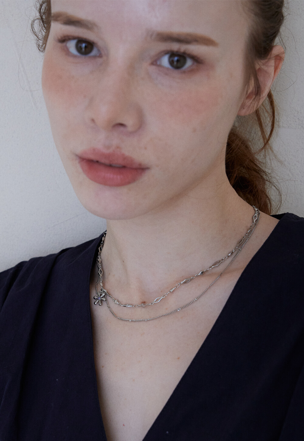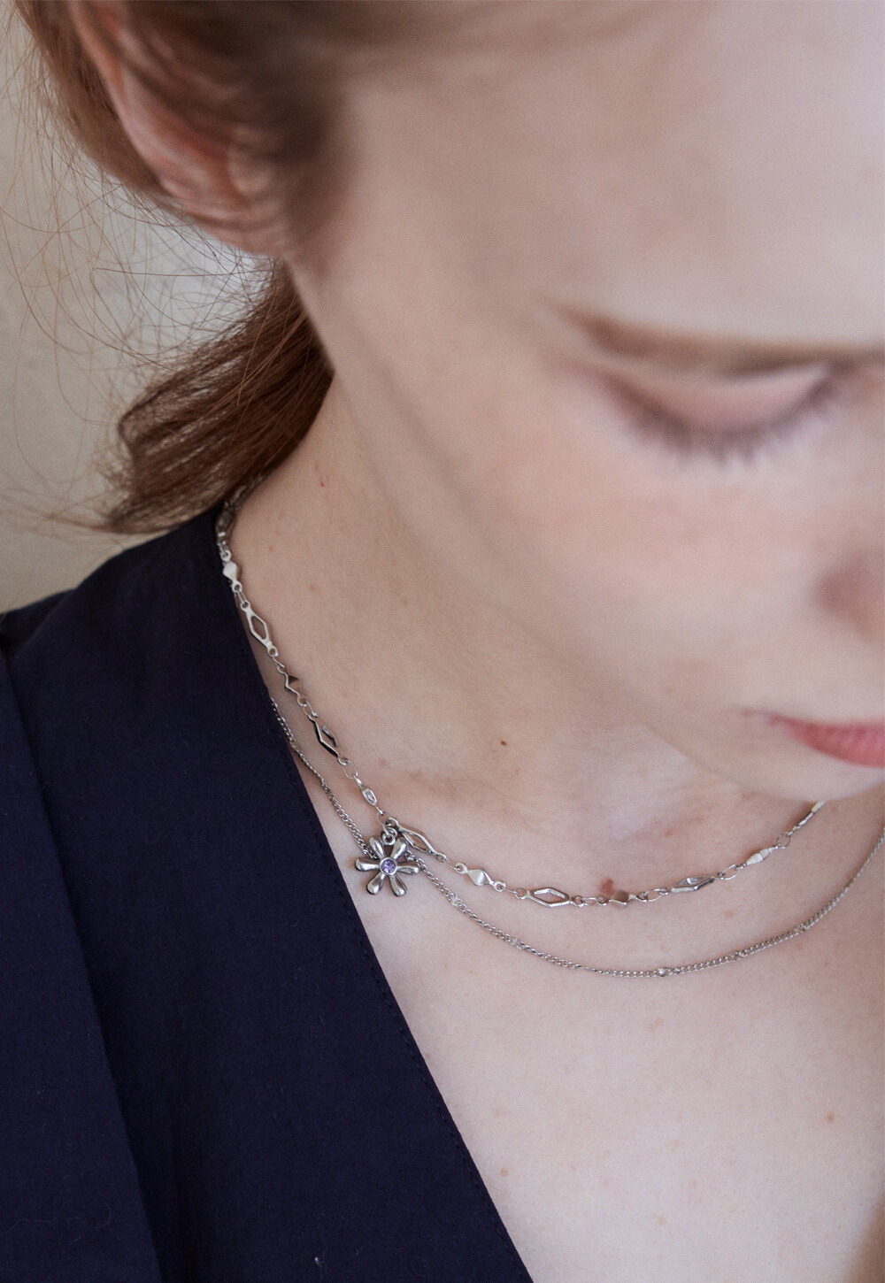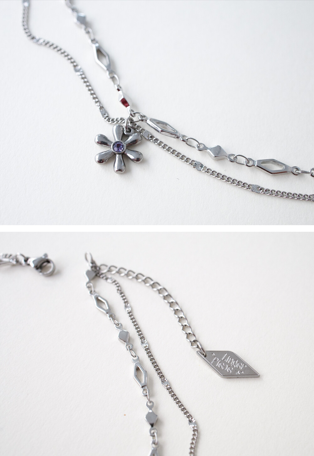 2가지 패턴의 체인이 더블 레이어드된 유니크한 디자인의 네클리스 입니다. 보라색 스톤이 박혀있는 플라워 팬던트를 사이드에 매치시켜 포인트를 주었으며, 전체 써지컬 스틸 소재로 제작되어 알러지와 변색을 예방합니다.