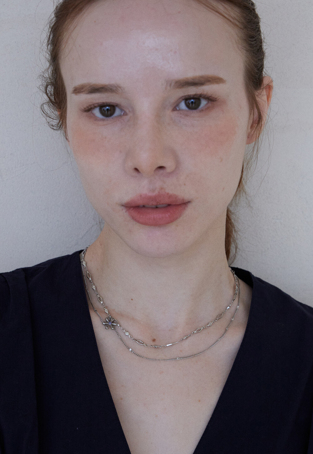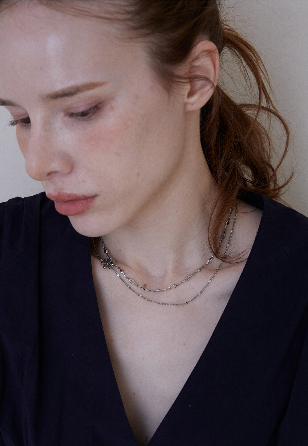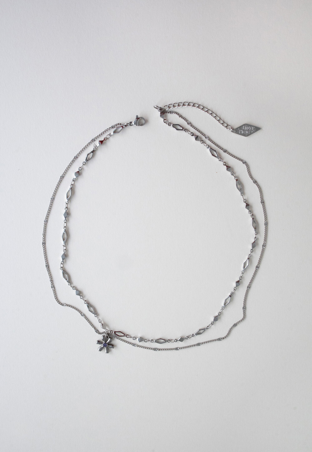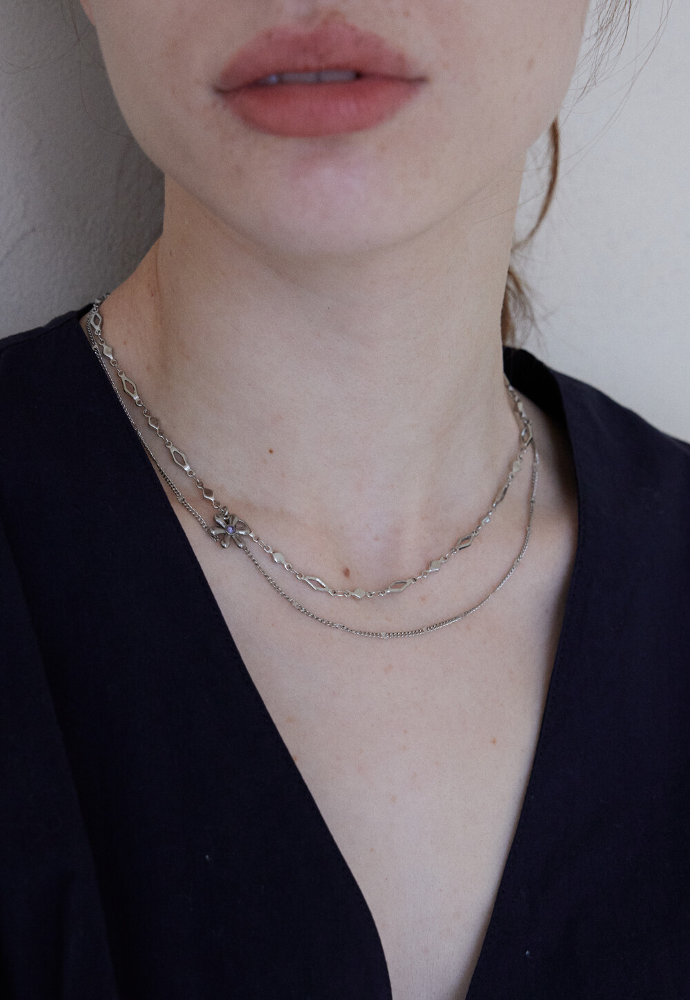 2가지 패턴의 체인이 더블 레이어드된 유니크한 디자인의 네클리스 입니다. 보라색 스톤이 박혀있는 플라워 팬던트를 사이드에 매치시켜 포인트를 주었으며, 전체 써지컬 스틸 소재로 제작되어 알러지와 변색을 예방합니다.