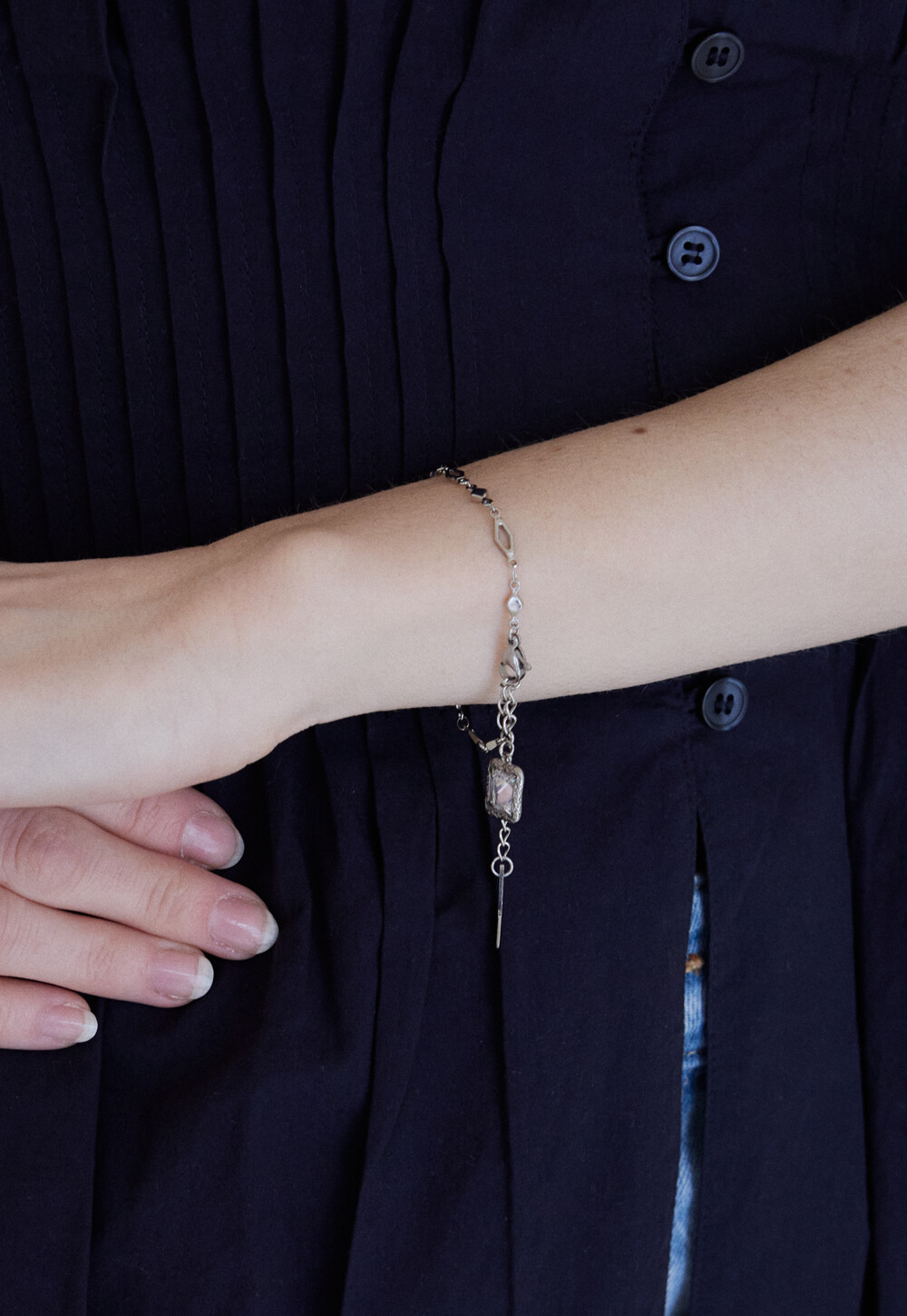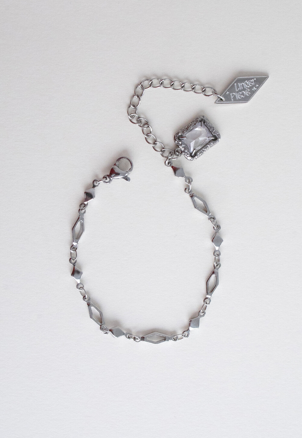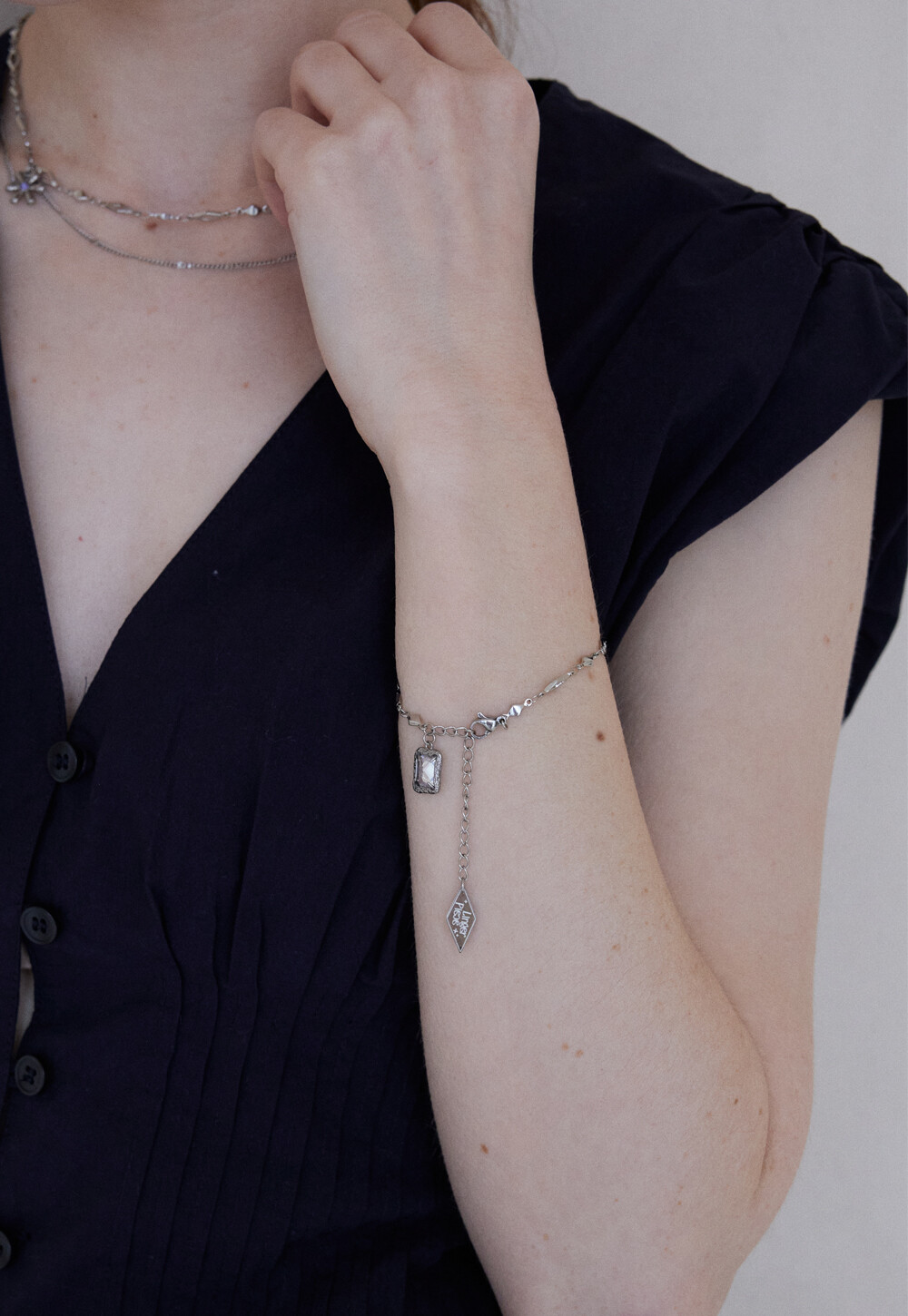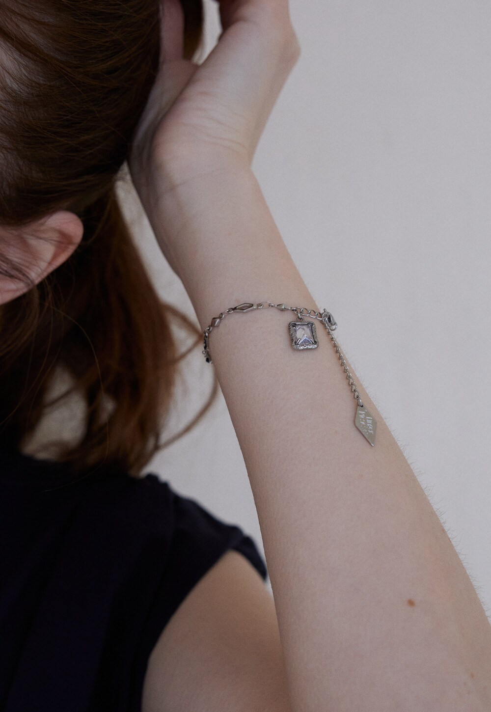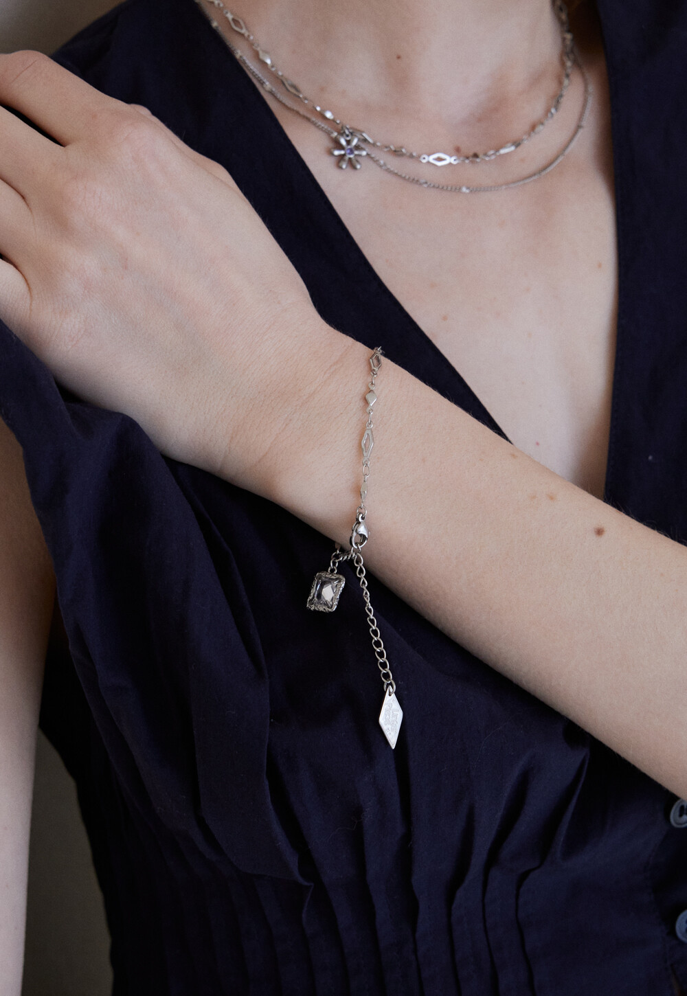 마름모 패턴의 체인과 빈티지한 무드의 사각 크리스탈 팬던트가 매치된 브레이슬릿 입니다. 심플하면서도 팬던트와 체인으로 유니크한 포인트를 준 아이템이며, 전체 써지컬 스틸 소재로 제작되어 알러지와 변색을 예방합니다.