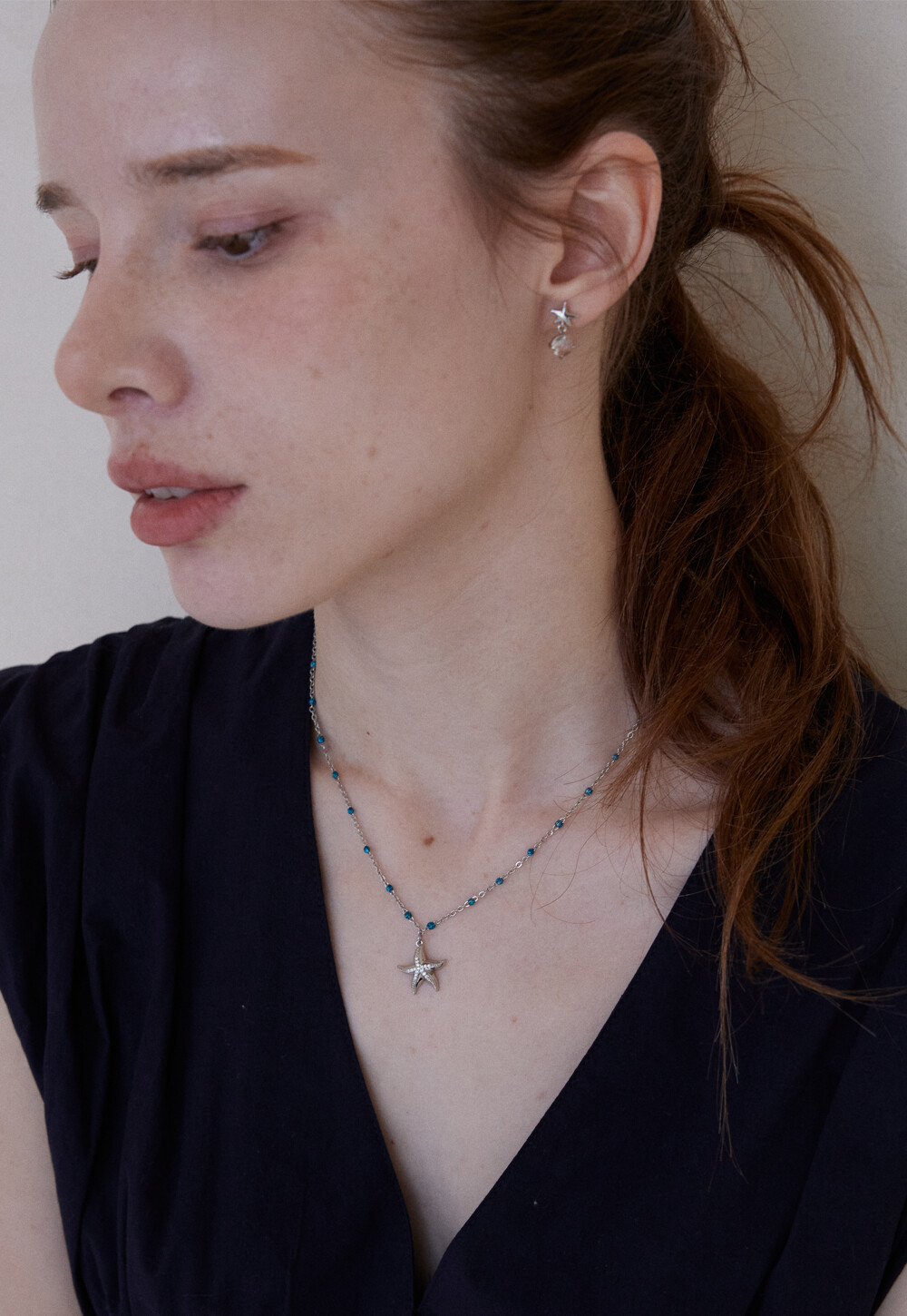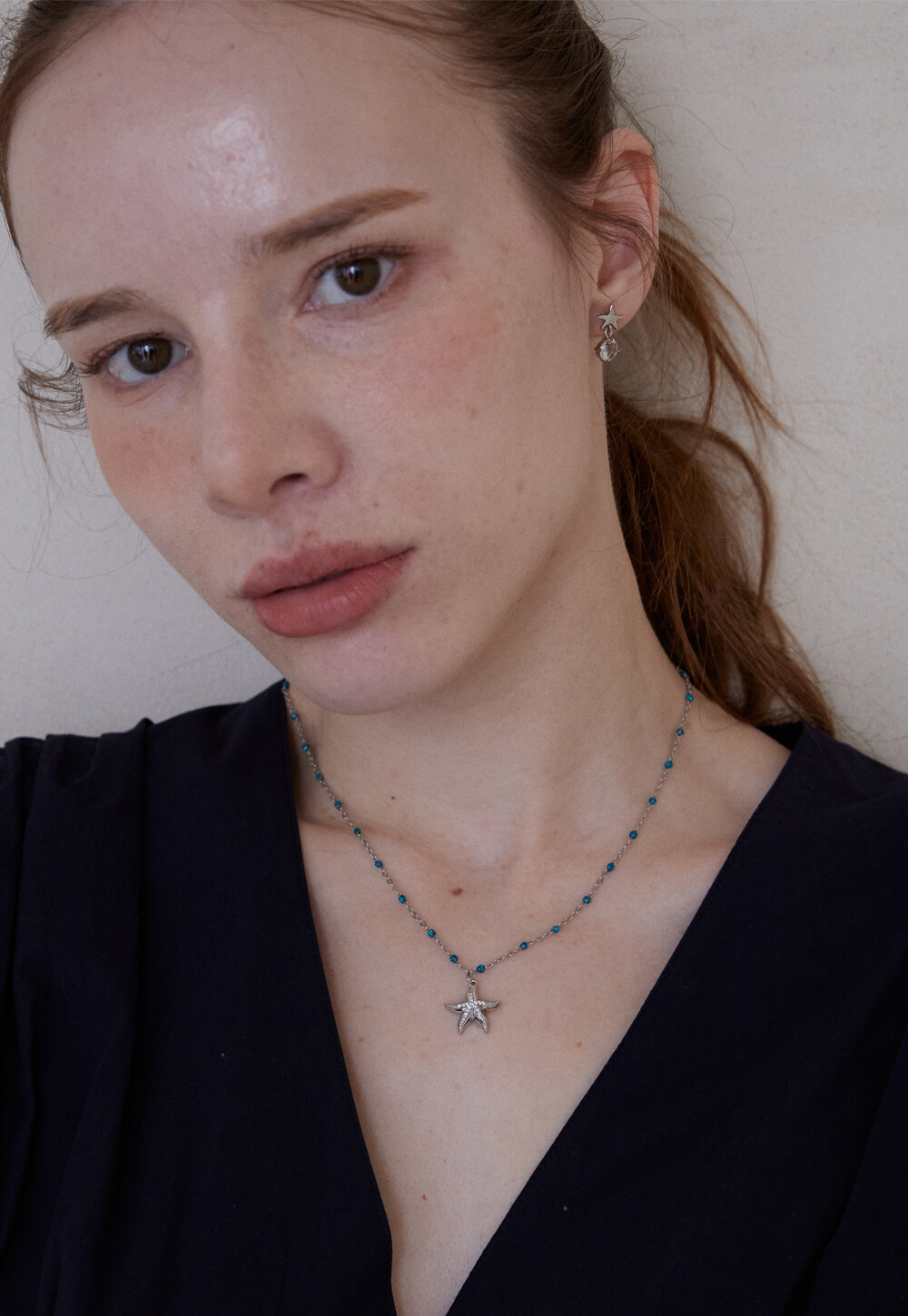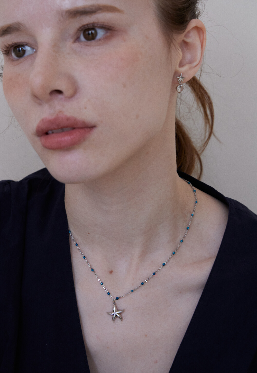 촘촘한 작은 큐빅이 박힌 반짝이는 불가사리 팬던트를 메인으로 한 네클리스 입니다. 펄이 믹스된 블루 컬러 볼로 포인트를 준 시원한 무드의 체인과 마감 부속은 써지컬 스틸 소재로 제작되어 알러지와 변색을 예방합니다. (불가사리 팬던트는 브라스에 알러지방지 도금 처리 되었습니다.)