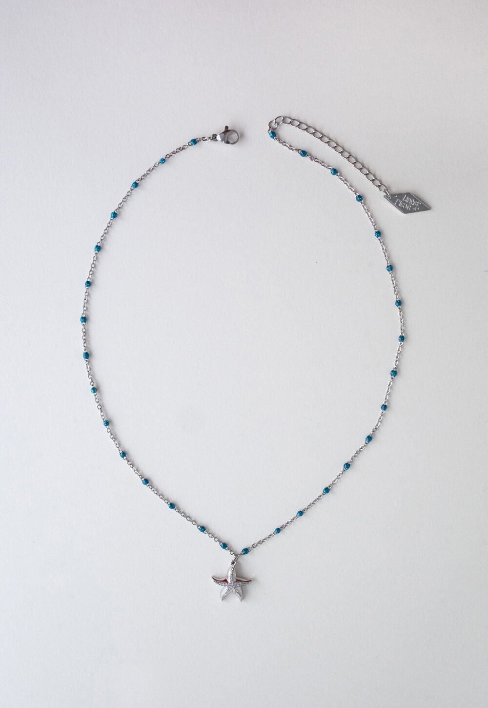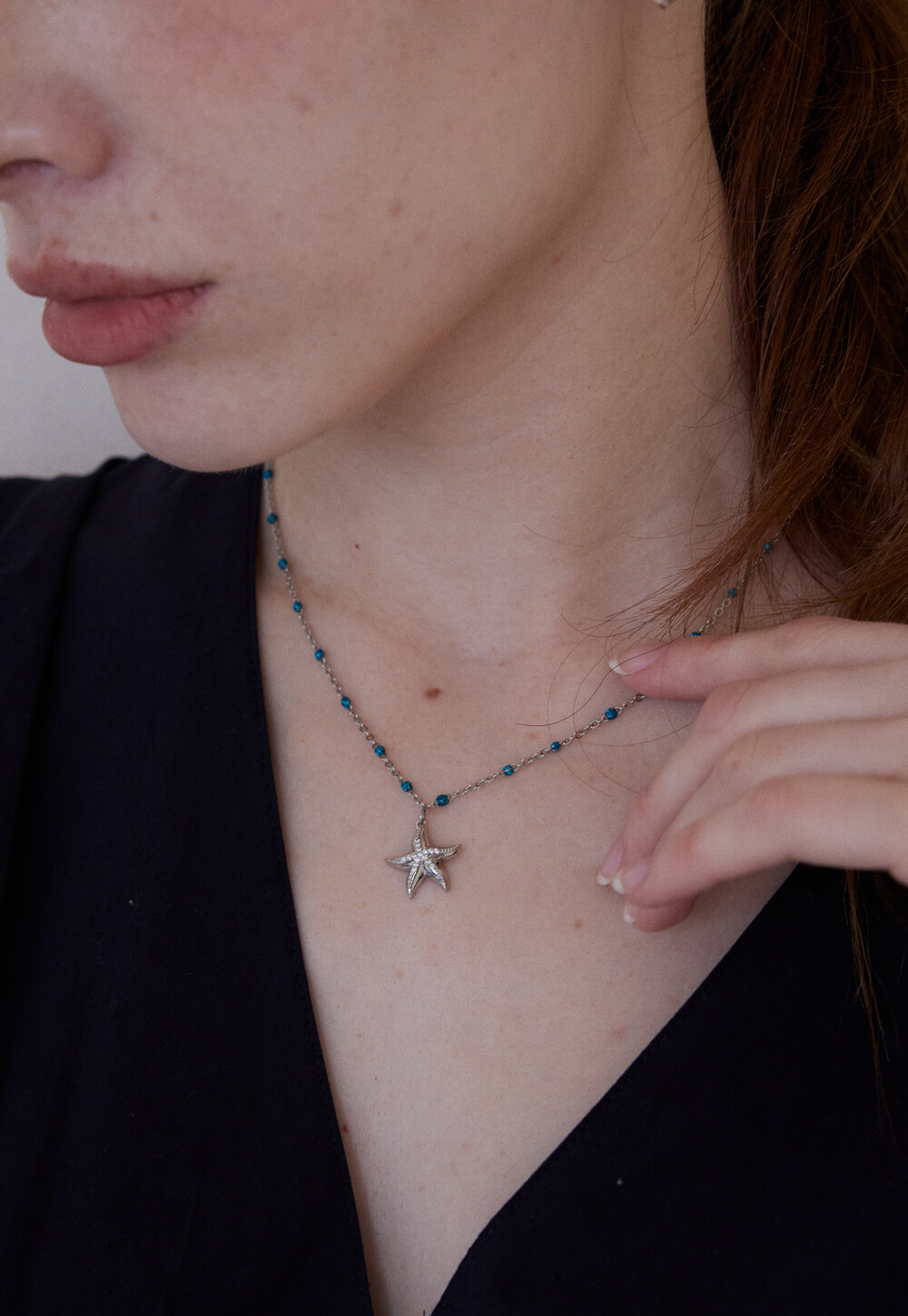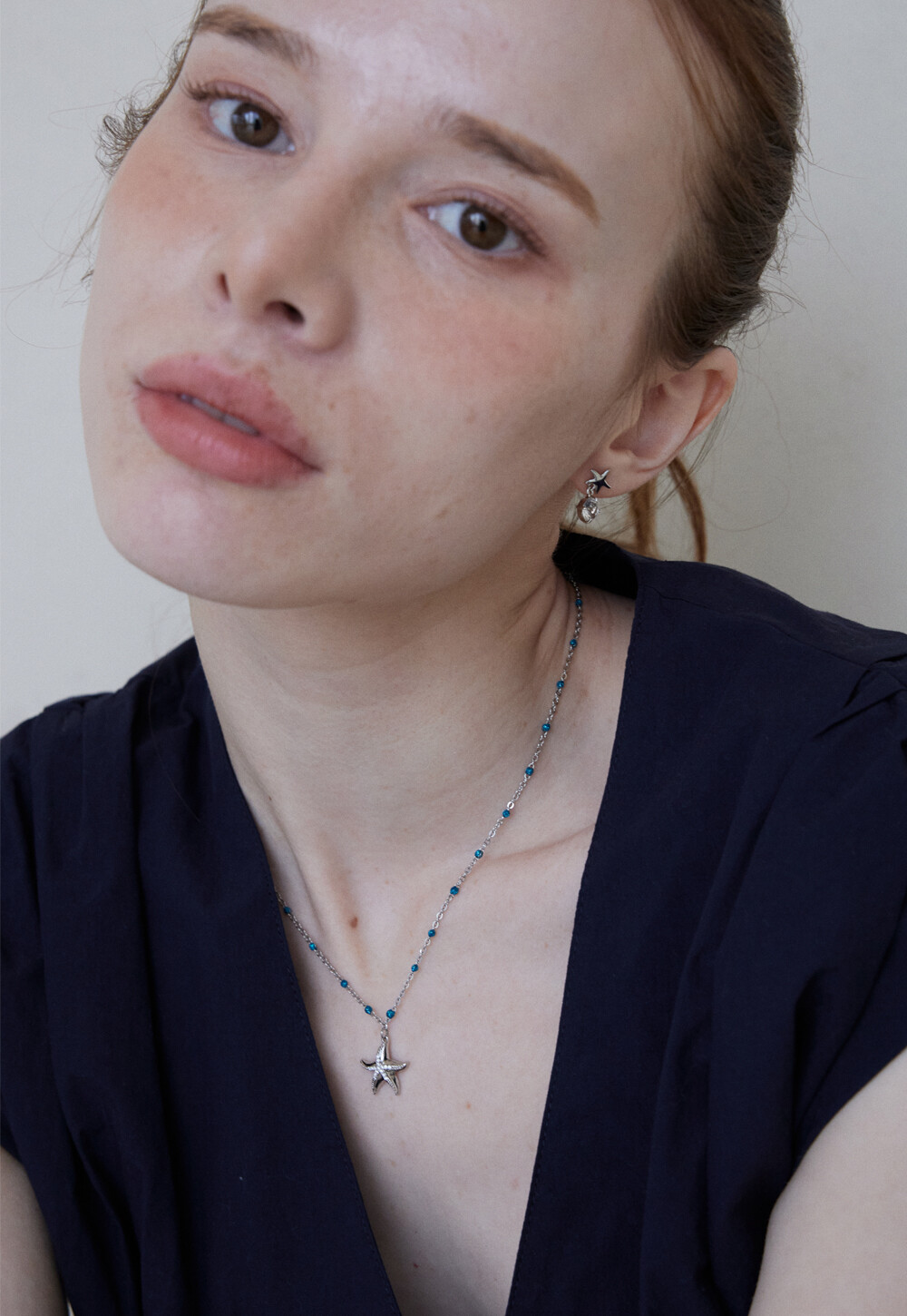 촘촘한 작은 큐빅이 박힌 반짝이는 불가사리 팬던트를 메인으로 한 네클리스 입니다. 펄이 믹스된 블루 컬러 볼로 포인트를 준 시원한 무드의 체인과 마감 부속은 써지컬 스틸 소재로 제작되어 알러지와 변색을 예방합니다. (불가사리 팬던트는 브라스에 알러지방지 도금 처리 되었습니다.)